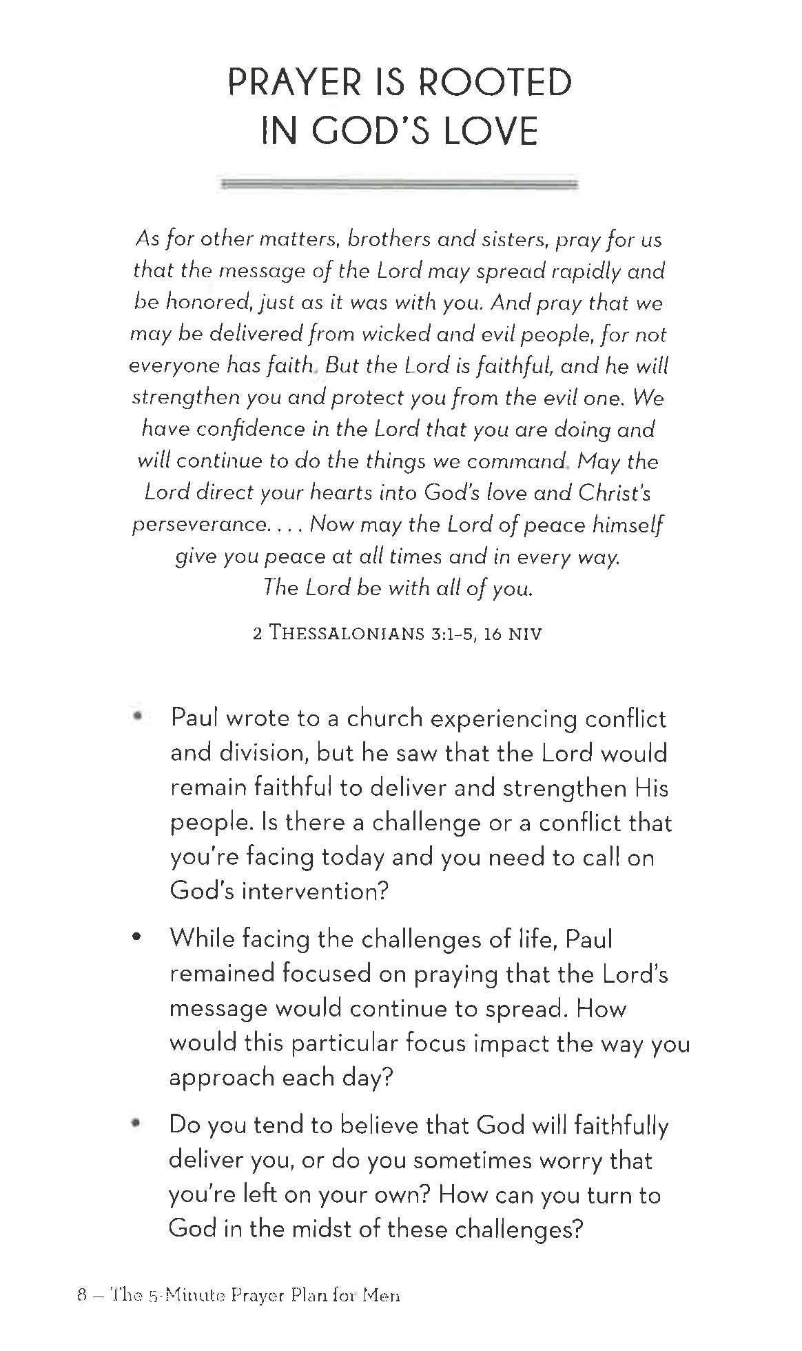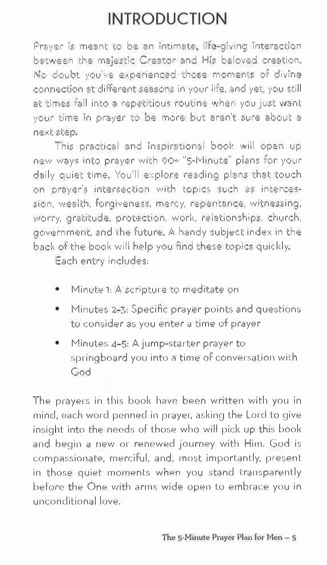This practical and inspirational guide will give you new ways to approach prayer with 90 focused 5-minute plans for your daily quiet time. These prayer plans explore a variety of life themes such as health, finances, forgiveness, relationships, wisdom, worry, and thankfulness. Each entry includes: