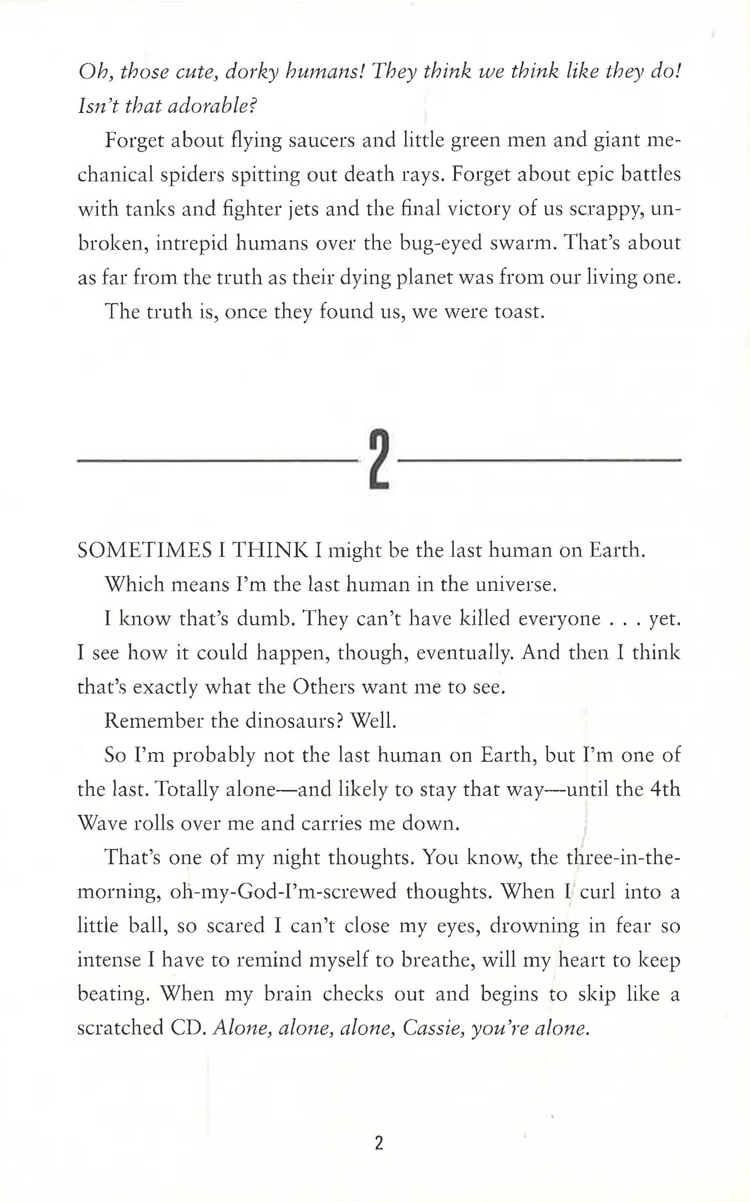 Now, it's the dawn of the 5th wave, and on a lonely stretch of highway, Cassie runs from Them. The beings who only look human, who roam the countryside killing anyone they see. Who have scattered Earth's last survivors. To stay alone is to stay alive, Cassie believes, until she meets Evan Walker. Beguiling and mysterious, Evan Walker may be Cassie's only hope for rescuing her brother--or even saving herself. But Cassie must choose: between trust and despair, between defiance and surrender, between life and death. To give up or to get up.