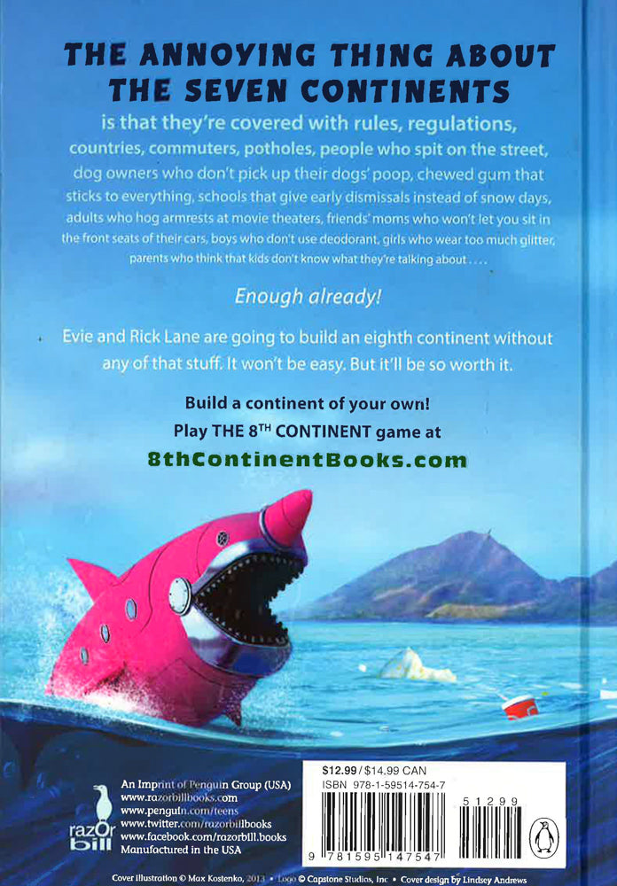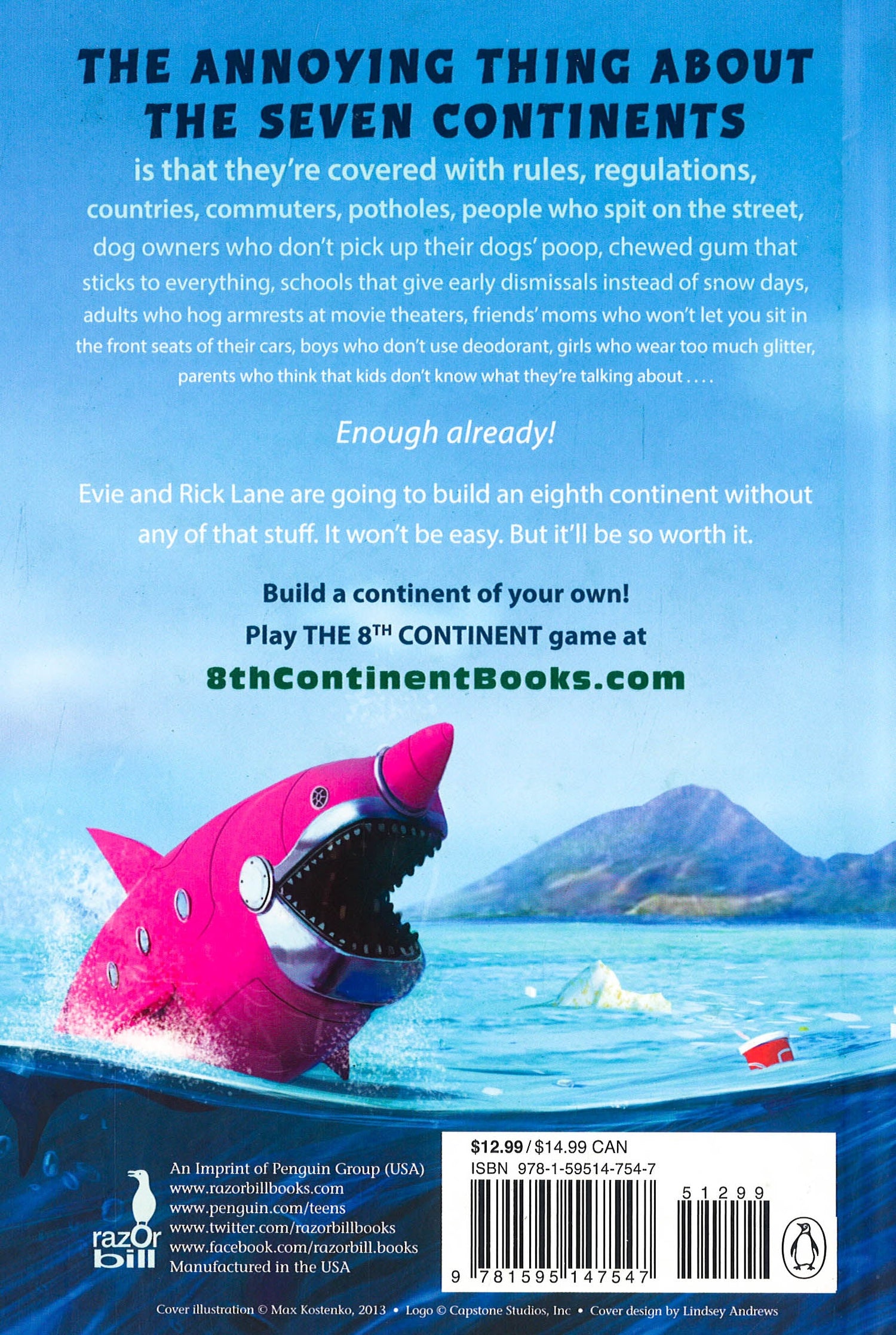HAVE YOU EVER WANTED TO CREATE A PLACE WHERE YOU COULD MAKE YOUR OWN RULES? Evie and Rick Lane are determined to transform the Great Pacific Garbage Patch—a real life pile of floating garbage—into an eighth continent, using a special formula developed by their father. This new continent will be a place where their family can make their own rules and live free from the intervention of Winterpole, a global governing agency run by bumbling bureaucrats. But eleven-year-old pink-and-plastic-obsessed Vesuvia Piffle, the secret mastermind behind the villainous Condo Corp, also has her sights set on this new land, and she wants to use it to build a kind of Miami-on-steroids. Now, it’s a race against time and across the world as the kids gather the items they need to create their continent. Because whoever controls the eighth continent controls our future. And the future can’t be both “green” and pink. BUILD IT - RUN IT - RULE IT at 8thContinentBooks.com
