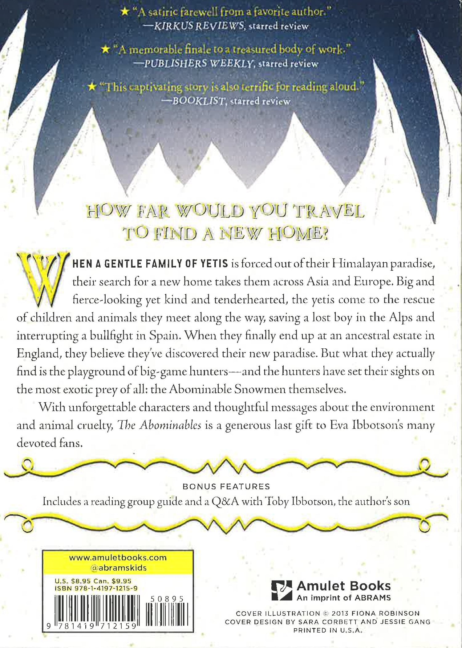 Renowned literary great Eva Ibbotson delivers a final novel in her classic, much-loved style. A previously unpublished work from this favorite author, The Abominables follows a family of yetis who are forced, by tourism, to leave their home in the Himalayas and make their way across Europe to a possible new home. Siblings Con and Ellen shepherd the yetis along their eventful journey, with the help of Perry, a good-natured truck driver. Through a mountain rescue in the Alps and a bullfight in Spain, the yetis at last find their way to an ancestral estate in England--only to come upon a club of voracious hunters who have set their sights on the most exotic prey of all: the Abominable Snowmen.Briskly funny and full of incident, The Abominables is vintage Ibbotson. With unforgettable characters and thoughtful messages about the environment and animal cruelty, it's a generous last gift to her many devoted fans.