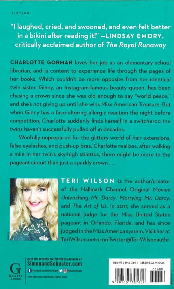 In this charming romantic comedy perfect for fans of Meg Cabot and Sophie Kinsella, critically acclaimed author Teri Wilson shows us that sometimes being pushed out of your comfort zone leads you to the ultimate prize. Charlotte Gorman loves her job as an elementary school librarian, and is content to experience life through the pages of her books. Which couldn't be more opposite from her identical twin sister. Ginny, an Instagram-famous beauty pageant contestant, has been chasing a crown since she was old enough to enunciate the words world peace, and she's not giving up until she gets the title of Miss American Treasure. And Ginny's refusing to do it alone this time. She drags Charlotte to the pageant as a good luck charm, but the winning plan quickly goes awry when Ginny has a terrible, face-altering allergic reaction the night before the pageant, and Charlotte suddenly finds herself in a switcheroo the twins haven't successfully pulled off in decades. Woefully unprepared for the glittery world of hair extensions, false eyelashes, and push-up bras, Charlotte is mortified at every unstable step in her sky-high stilettos. But as she discovers there's more to her fellow contestants than just wanting a sparkly crown, Charlotte realizes she has a whole new motivation for winning.