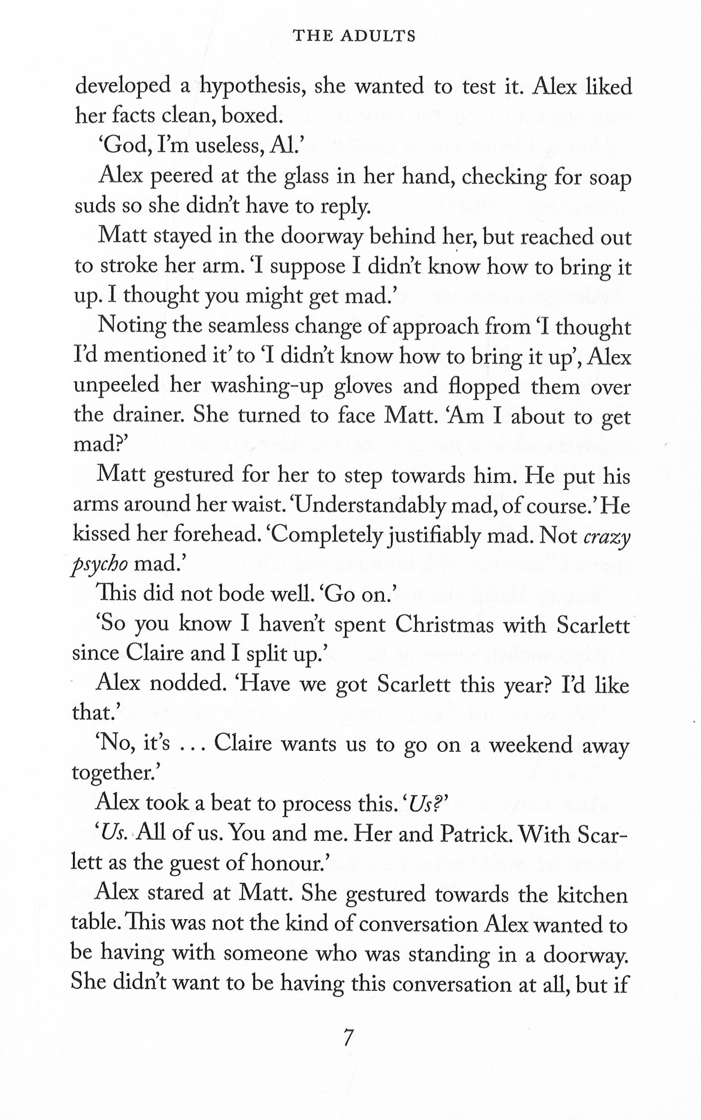 The most hilarious and heartwarming debut of the year, from a totally fresh and original new voice.Genuinely unputdownable books are rare in my experience. This is one. A brilliant, original comedy' Daily Mail'I loved The Adults! Funny, dry and beautifully observed. Highly recommended for anyone whose perfect Christmases never quite go according to plan!'Gill Sims, #1 bestselling author of Why Mummy Drinks and Why Mummy Swears * * * * *MEET THE ADULTS...Claire and Matt are divorced but decide what's best for their daughter Scarlett is to have a 'normal' family Christmas with them all together.Claire brings her new boyfriend Patrick, a seemingly eligible Iron-Man-in-Waiting. Matt brings the new love of his life Alex, funny, smart, and extremely patient. Scarlett, their daughter, brings her imaginary friend Posey. He's a rabbit.Together the five (or six?) of them grit their teeth over Organized Fun activities, drinking a little too much after bed-time, oversharing classified secrets about their pasts and, before they know it, their holiday is a powder keg that ends - where this story starts - with a tearful, frightened, call to the police...But what happened? They said they'd all be adults about this...* * * * *'Such a breath of fresh air! Witty, intensely human and (dare I say it) relatable ... The perfect comedy of errors' Katie Khan'The Adults is my top read of 2018 so far. Absolutely hilarious ... This one will stay with me for a long time' Cathy Bramley 'Packed with sharp wit, engaging characters and off-beat humour, this is a fresh and feisty thrill-ride of a novel' Heat'I took this book on holiday and couldn't put it down! I've never read anything quite like it' The Unmumsy Mum'Gripped me from the start. Reminiscent of Liane Moriarty's Big Little Lies - a sure-fire winner' Cass Hunter, author of The After Wife'Brilliantly funny - will have you wincing in recognition' Good Housekeeping'I have a feeling Caroline Hulse might be a genius, this book is so brilliant. t's funny, clever and original - I loved every minute of reading it. Also, Posey should get a spin-off TV show' Lucy Vine, author of Hot Mess'Funny, poignant, real - a truly original book that made me laugh, cry and cringe in equal measure. I loved it' Charlotte Duckworth'Razor-sharp comedy - barbed and brilliant. The characters are totally convincing ... Sparky, heart-felt and fantastically fun, this is a fabulous debut' Sunday Mirror