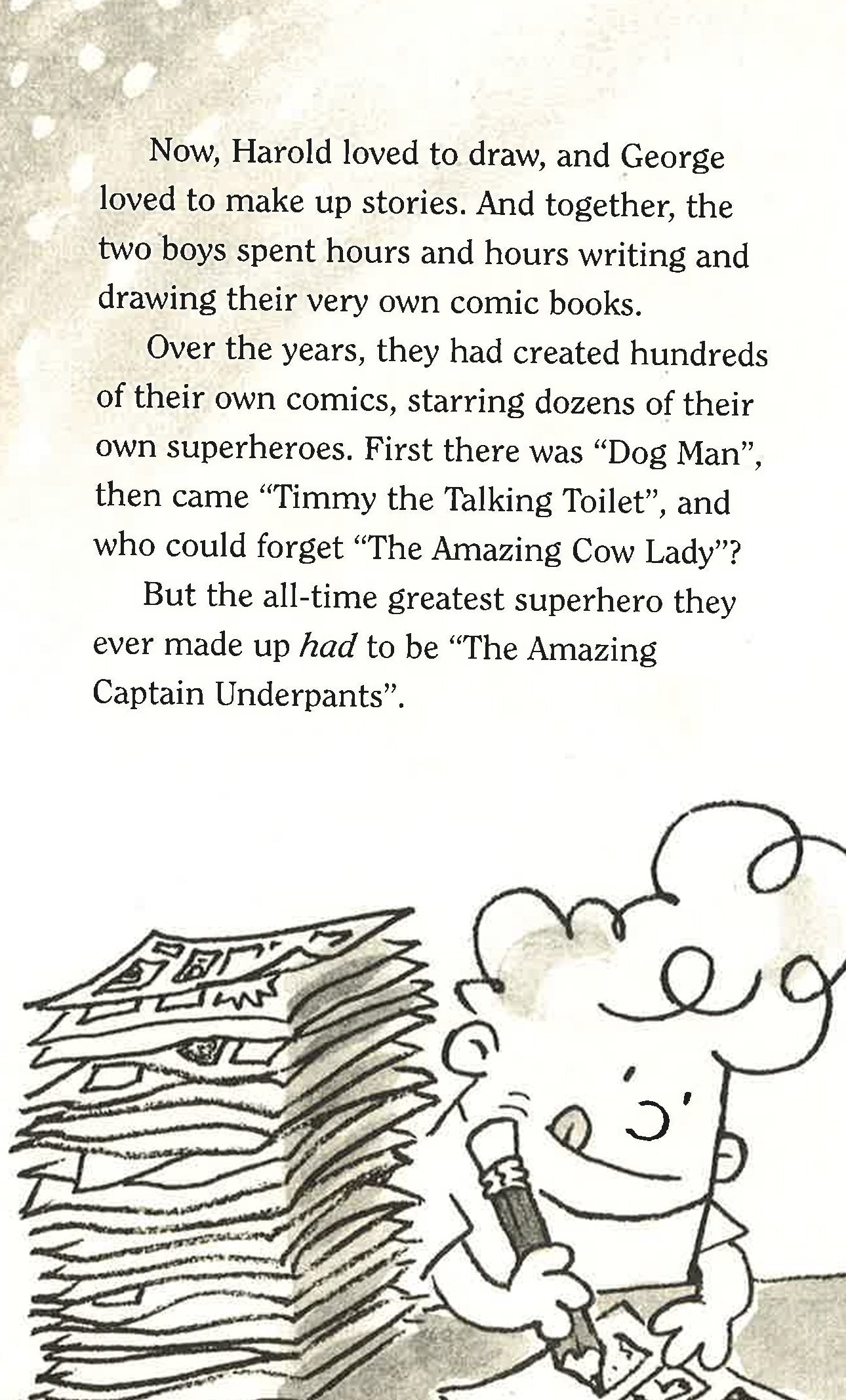 When naughty George and Harold hypnotise their headteacher, they accidentally create the greatest superhero in the history of their school -- Captain Underpants! His true identity is so secret that even HE doesn't know who he is...but he's fighting for truth, justice, and all things pre-shrunk and cottony!! If you're a naughty villain like the diabolical Dr Diaper, watch out! Captain Underpants has wedgie-power on his side, and he's coming your way.