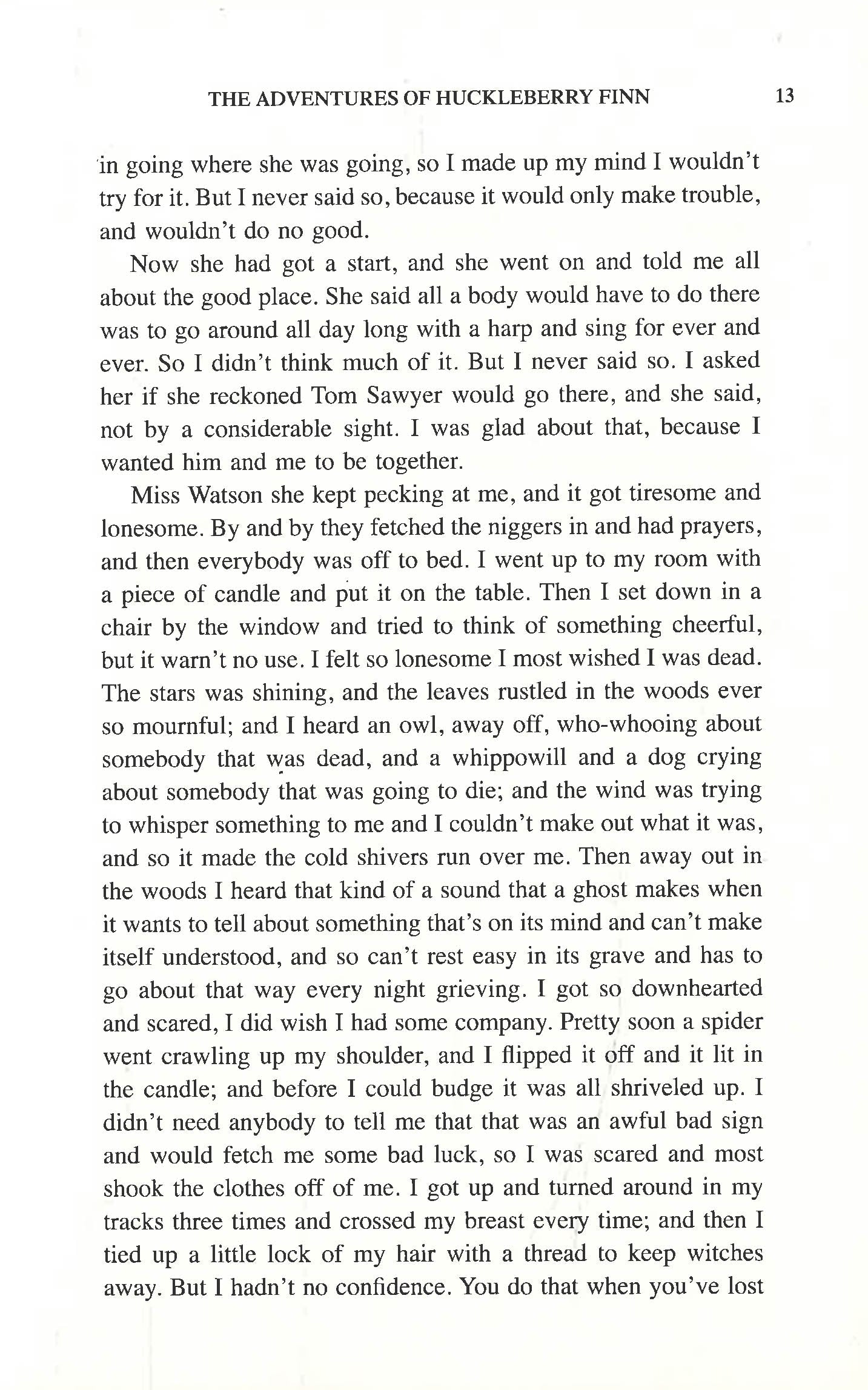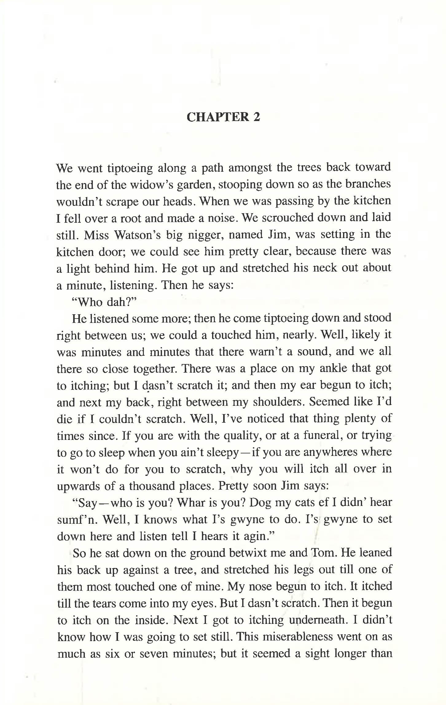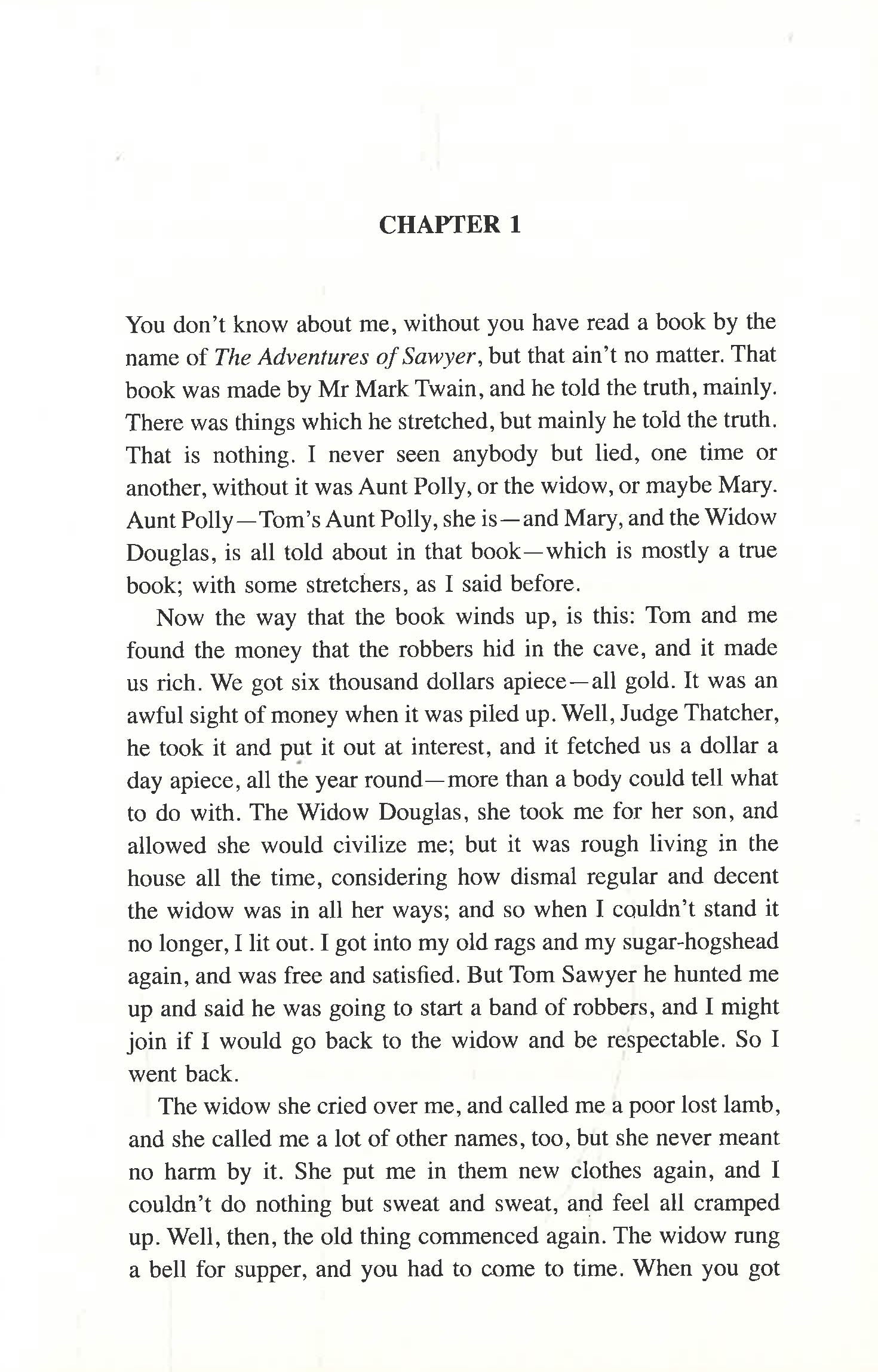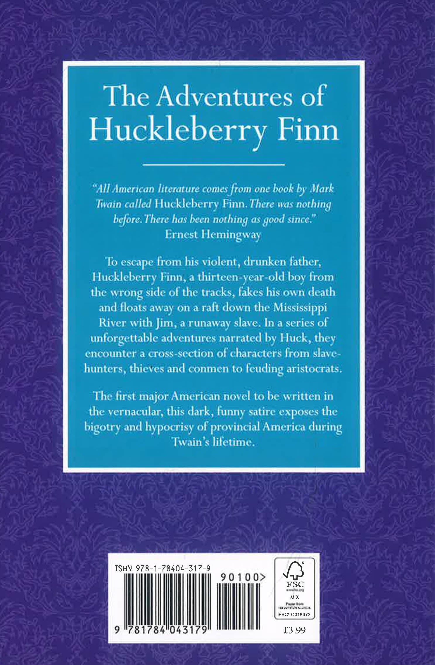 Commonly named among the Great American novels, The Adventures of Huckleberry Finn, written by Mark Twain, is generally regarded as the sequel to his earlier novel, The Adventures of Tom Sawyer; however, in Huckleberry Finn, Twain focused increasingly on the institution of slavery and the South. Narrated by Huckleberry “Huck” Finn in Southern antebellum vernacular, the novel gives vivid descriptions of people and daily life along the Mississippi River while following the adventure of Huck and a runaway slave, Jim, rafting their way to freedom.