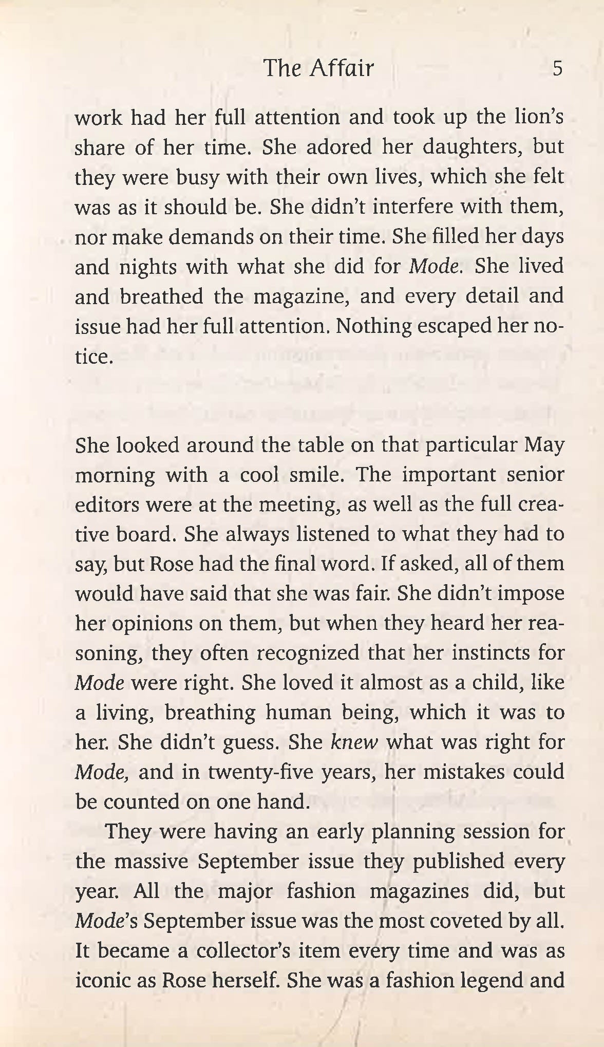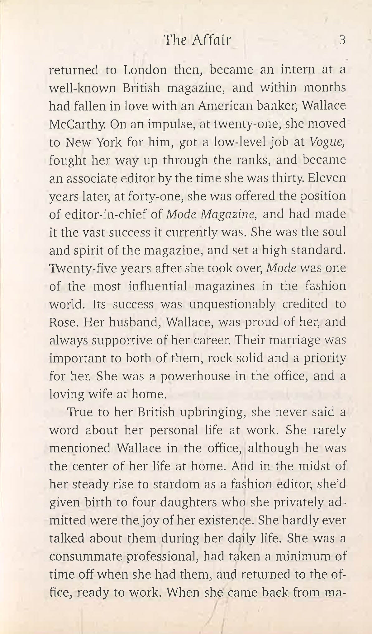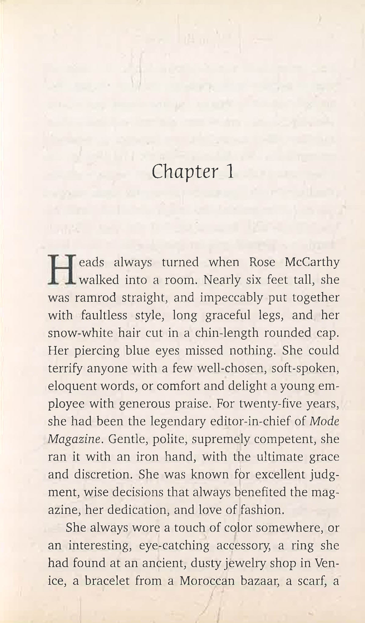 When Rose McCarthy’s staff at Mode magazine pitches a cover shoot with Hollywood’s hottest young actress, the actress’s sizzling affair with a bestselling French author is exposed. The author happens to be Rose’s son-in-law, which creates a painful dilemma for her. Her daughter Nadia, a talented interior designer, has been struggling to hold her marriage together, and conceal the truth from their young daughters, her family, and the world. But Nicolas, her straying husband, is blinded by passion for a younger woman—and not only that, she is pregnant with his child.