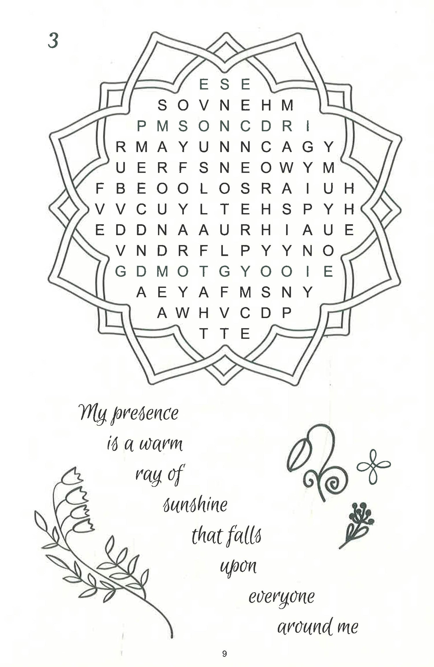 Affirmations are positive statements which are designed to be repeated to help strength our feelings of self-worth, and improve our overall well-being. These delightful, uplifting puzzles combine affirmations with ever-popular wordsearch puzzles, meaning that you can use their power while you enjoy the satisfaction of finding the hidden words.