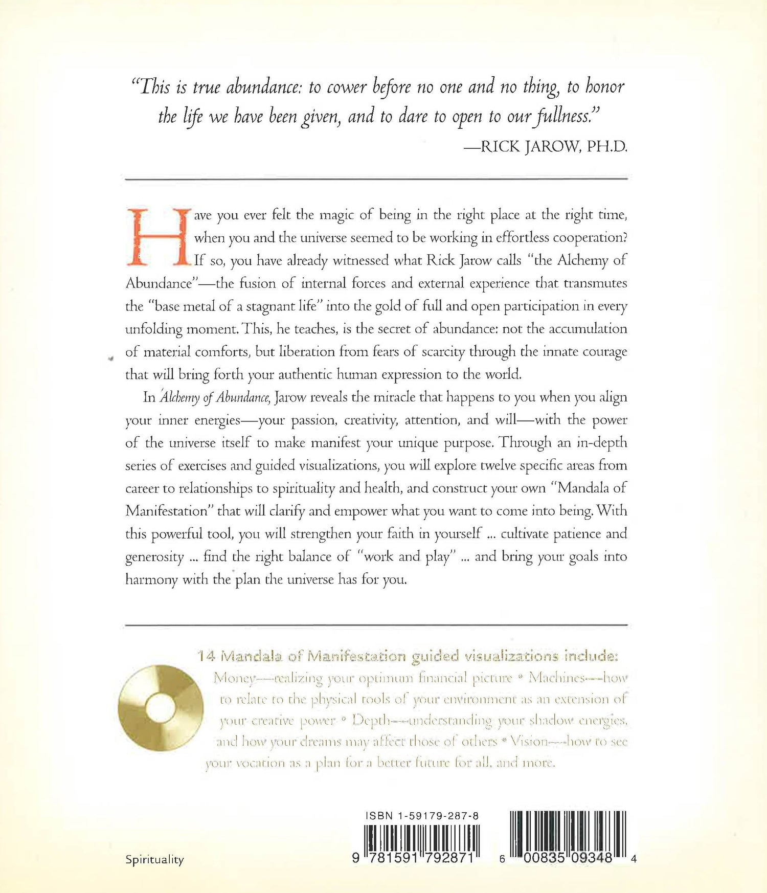 Have you ever felt the magic of being in the right place at the right time, when you and the universe seemed to be working in effortless cooperation? If so, you have already witnessed what Rick Jarow calls the "Alchemy of Abundance"-the fusion of internal forces and external experience that transmutes the "base metal of a stagnant life" into the gold of full and open participation in every unfolding moment. In Alchemy of Abundance, Jarow reveals the miracle that happens to you when you align your inner energies-your passion, creativity, attention, and will-with the power of the universe itself to make manifest your unique purpose. Includes in-depth exercises and guided visualizations to strengthen your faith in yourself, cultivate patience and generosity, and bring your goals into harmony with the plan the universe has for you.Highlights:Creating your "Mandala of Manifestation"-a powerful tool that will clarify and focus what you want to come into beingFourteen guided visualizations for learning to attend to your body, your vocation, your relationships, your money, and much more