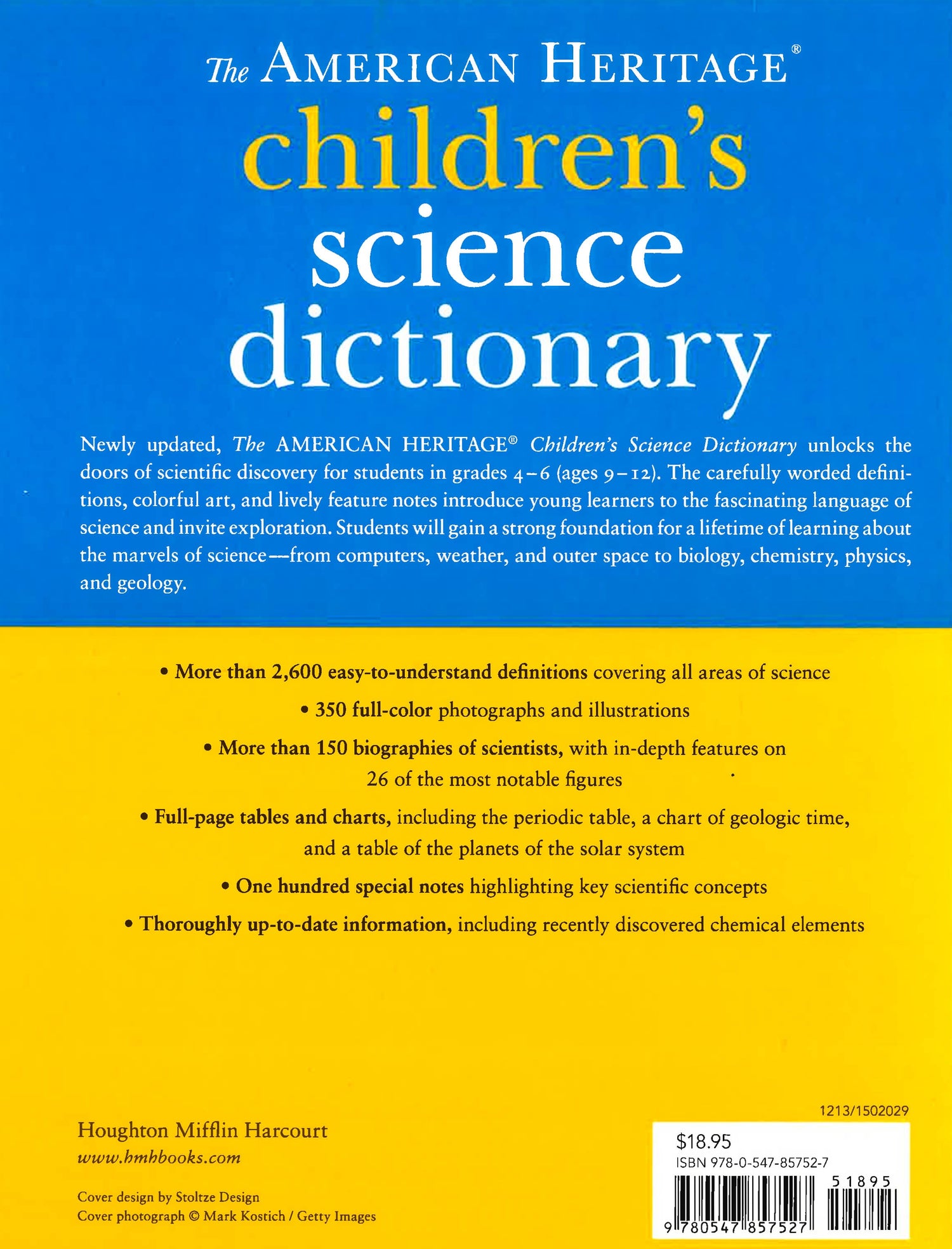 The newly updated American Heritage® Children's Science Dictionary introduces students in grades 4-6 (ages 9-12) to the language and ideas of science. Over 2,600 entries, written in clear language and accompanied by stunning color art, cover the full range of scientific subjects, from biology, chemistry, physics, and mathematics to the environment, technology, and medicine. Key figures in the sciences are showcased in biographical entries and sidebars. Tables and charts include the periodic table, a chart of geologic time, and a timeline of scientific discovery. Detailed, illustrated feature notes provide in-depth information on basic concepts, and brief notes relate interesting facts on dozens of additional topics.