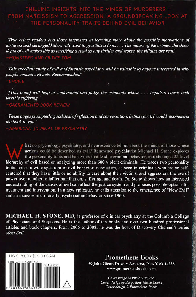 FROM NARCISSISM TO AGGRESSION, AN ORIGINAL LOOK AT THE PERSONALITY TRAITS AND BEHAVIORS THAT CONSTITUTE EVIL In this groundbreaking book, renowned psychiatrist Michael H. Stone explores the concept and reality of evil from a new perspective. In an in-depth discussion of the personality traits and behaviors that constitute evil across a wide spectrum, Dr. Stone takes a clarifying scientific approach to a topic that for centuries has been inadequately explained by religious doctrines. Stone has created a 22-level hierarchy of evil behavior, which loosely reflects the structure of Dante's Inferno. Basing his analysis on the detailed biographies of more than 600 violent criminals, hetraces two salient personality traits that run the gamut from those who commit crimes of passion to perpetrators of sadistic torture and murder. One trait is narcissism, as exhibited in people who are so self-centered that they have little or no ability to care about their victims. The other is aggression, the use of power over another person to inflict humiliation, suffering, and death. What do psychology, psychiatry, and neuroscience tell us about the minds of those whose actions could be described as evil? And what will that mean for the rest of us? Stone discusses how an increased understanding of the causes of evil will affect the justice system. He predicts a day when certain persons can safely be declared salvageable and restored to society and when early signs of violence in children may be corrected before potentially dangerous patterns become entrenched.