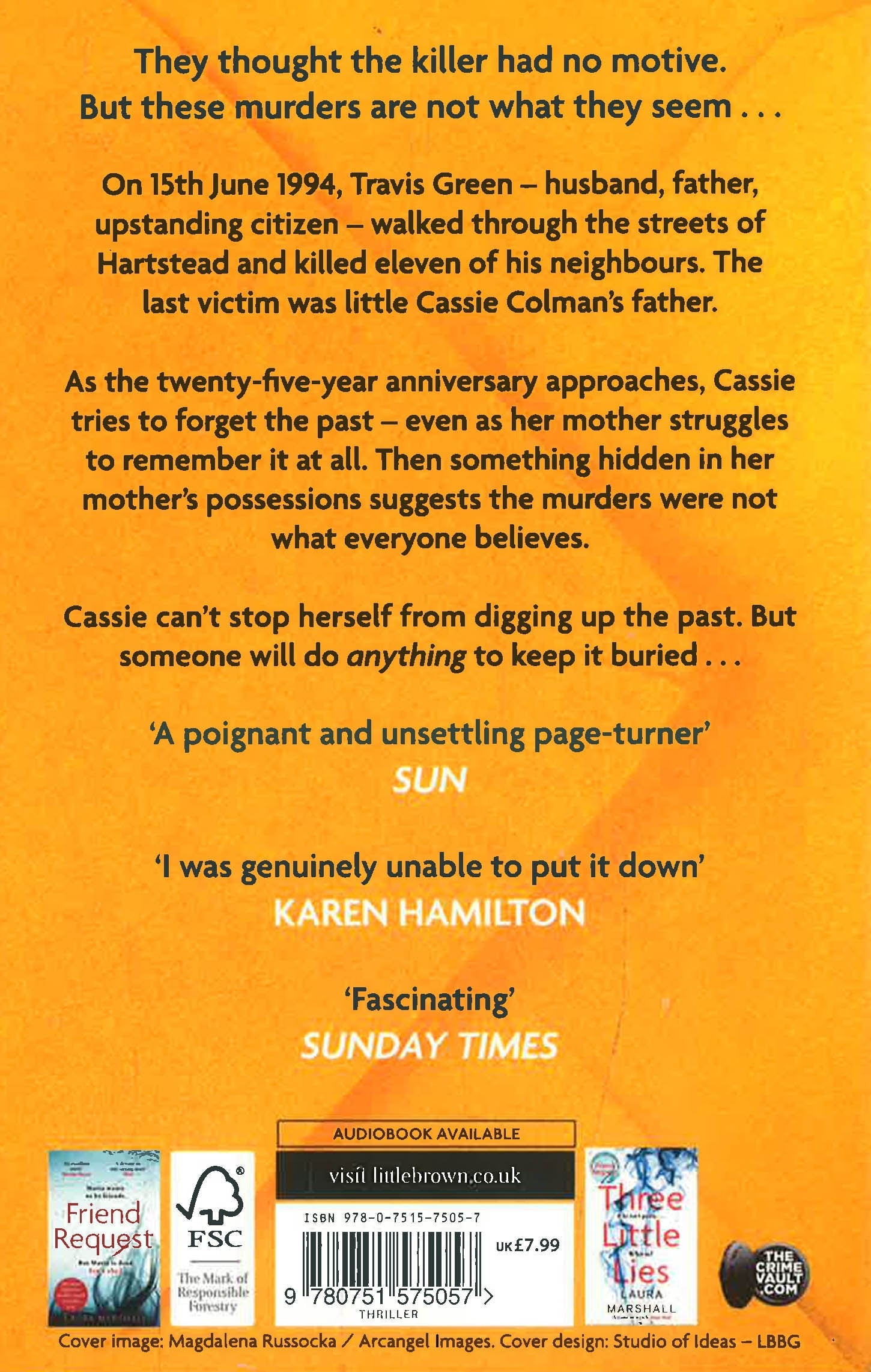 YOU'LL BE HOOKED BY THE FIRST PAGE, AND SHOCKED BY THE LAST . . . THE TWISTY NEW THRILLER FROM THE #1 BESTSELLING AUTHOR OF FRIEND REQUESTThey thought the killer had no motive. But these murders are not what they seem . . .On 15th June 1994, Travis Green - husband, father, upstanding citizen - walked through the streets of Hartstead and killed eleven of his neighbours. The last victim was little Cassie Colman's father.As the twenty-five-year anniversary approaches, Cassie tries to forget the past - even as her mother struggles to remember it at all. Then something hidden in her mother's possessions suggests the murders were not what everyone believes.Cassie can't stop herself from digging up the past. But someone will do anything to keep it buried . . .PRAISE FOR THE ANNIVERSARY:'A poignant and unsettling page-turner' SUN'A book to keep you guessing and pull at your heartstrings' ERIN KELLY, author of HE SAID/SHE SAID'Fascinating' SUNDAY TIMES'Compulsively readable. Laura Marshall's best yet' CHRIS WHITAKER, author of WE BEGIN AT THE END'I was genuinely unable to put it down' KAREN HAMILTON, author of THE PERFECT GIRLFRIEND'A tense, twisty one-sitting read' TAMMY COHEN, author of THE WEDDING PARTY'A brilliant, twisty thriller you'll want to race through' FABULOUS MAGAZINE'The perfect compulsive summer read' FIONA CUMMINS, author of WHEN I WAS TEN'Clever, pacey and compelling. A cracking thriller' EMMA CURTIS, author of INVITE ME IN'Utterly gripping' WOMAN'S OWN