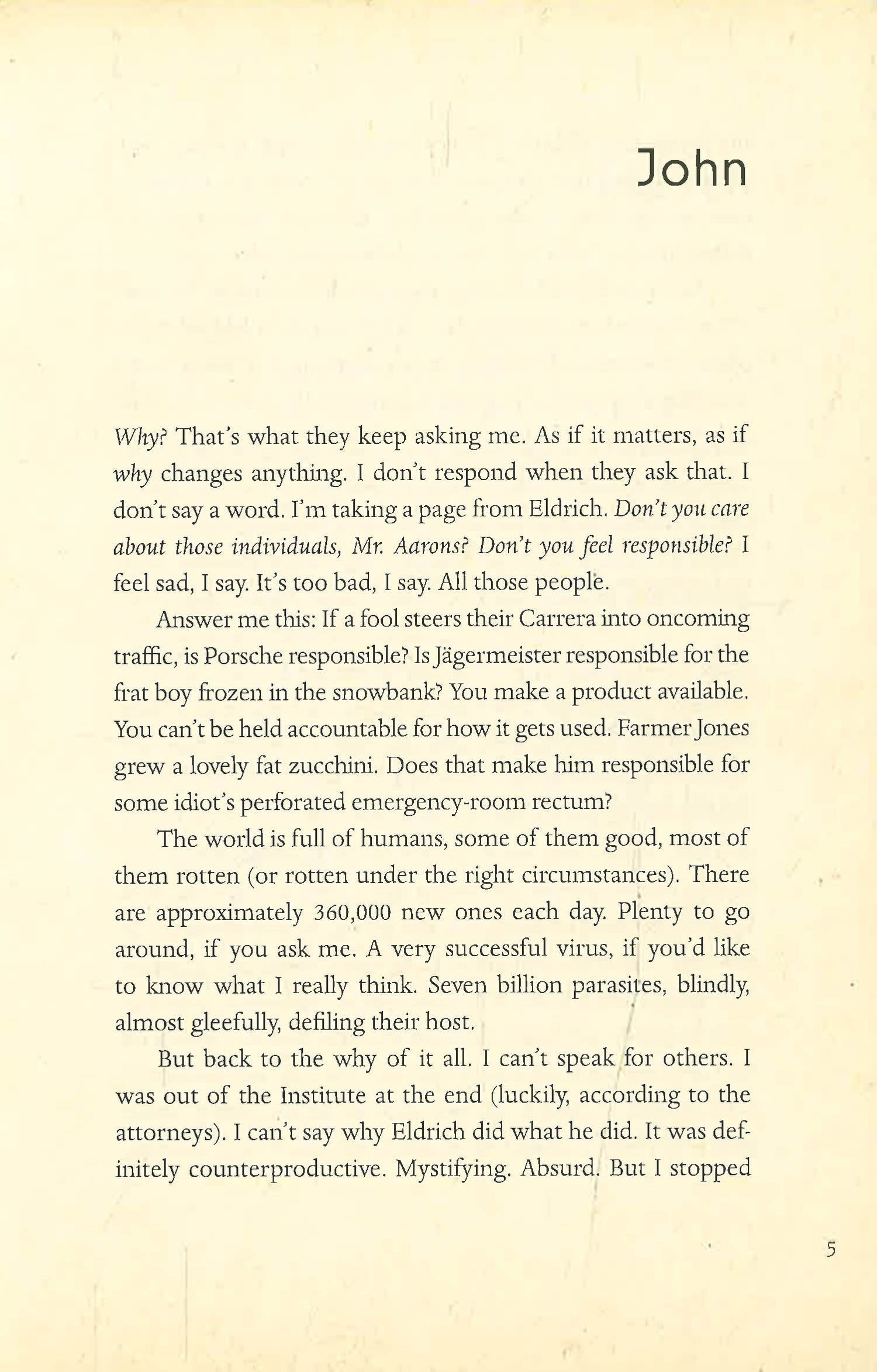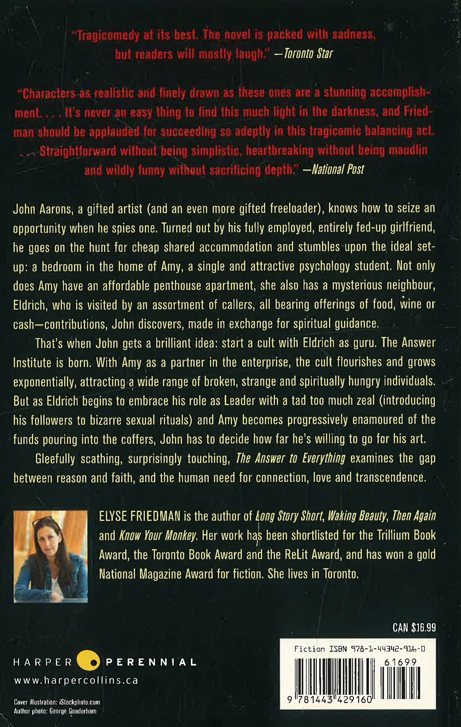 John Aarons, a brilliant but perpetually broke artist, knows how to cadge a meal or seize an opportunity when he spies one. Turned out on the street by his fully employed, entirely fed up girlfriend, he goes on the hunt for cheap shared accommodation and stumbles upon the ideal set-up―a bedroom in the home of Amy, an attractive psychology student who has been abandoned by her condo-buying roommate. Not only does Amy have a surprisingly affordable penthouse apartment with rooftop patio and a fridge full of high-quality comestibles, but she also has a mysterious across-the-hall neighbour, Eldrich, who appears to be home all day, smoking weed and receiving an odd assortment of visitors. Before long, John is availing himself of Eldrich's pot, food and wine. He notices that these staples are provided gratis to Eldrich by friends and acquaintances who rely on him for spiritual guidance. That's when John, atheist and misanthrope, decides to start a New Age cult with Eldrich as guru. And so, as half art project, half money-making scheme, the Answer Institute is born. With Amy as a partner in the enterprise, the cult flourishes and grows exponentially, attracting a wide range of broken, strange and spiritually hungry individuals, including an obscenely wealthy Singaporean expat, a psilocybin-dealing hippie, a conservative mom mourning the death of her only child, and the star of a popular sci-fi TV show. Eldrich begins to embrace his role as Leader with a little too much zeal and introduces his followers to increasingly peculiar rituals. Amy becomes progressively more enamoured of the funds pouring into the coffers, and John lets sexual jealousy get the better of him. The more successful the Institute gets, the more it spirals out of control, culminating in a bizarre ayahuasca ceremony that ends in a way nobody could have expected. With humour and pathos, The Answer to Everything examines the gap between reason and faith, and the human need for connection, love and transcendence.