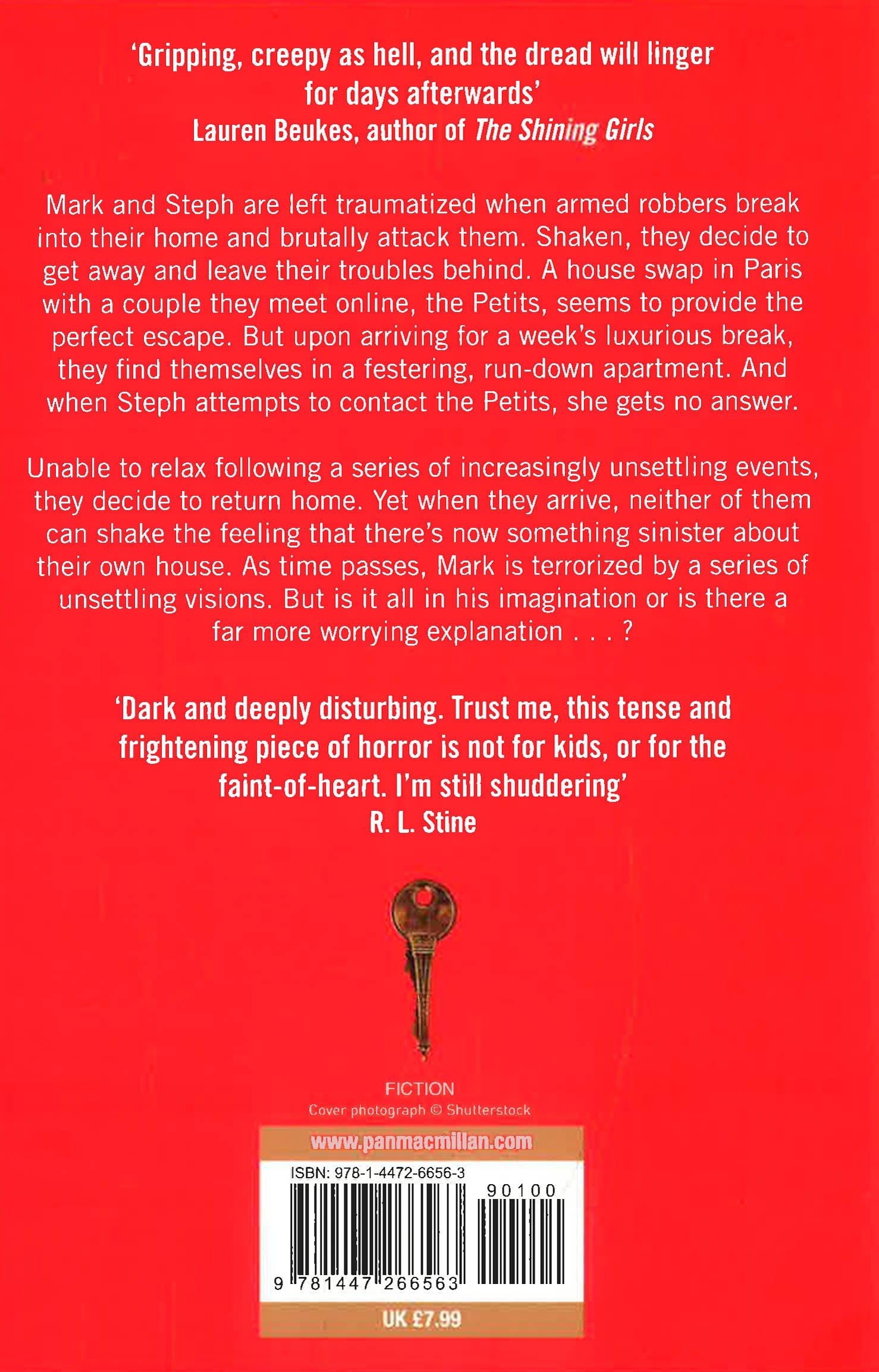 From S. L. Grey comes this suspenseful psychological thriller. Mark and Steph are struggling to move on with their lives after armed robbers broke into their home and brutalized them. Shaken, they decide to get away and leave their troubles behind. A house swap in Paris with a couple they meet online, the Petits, seems to provide the perfect escape. But upon arriving for a week's luxurious break, they find themselves in a festering, run-down apartment. And when Steph attempts to contact the Petits, she gets no answer. Mark and Steph try to make the most of the trip, but they are unable to relax. After a series of increasingly unsettling events, they decide to return home. Yet when they arrive, neither of them can shake the feeling that there's now something sinister about their own house. As time passes, Mark is terrorized by a series of unsettling visions. But is it all in his imagination or is there a far more worrying explanation . . . ?