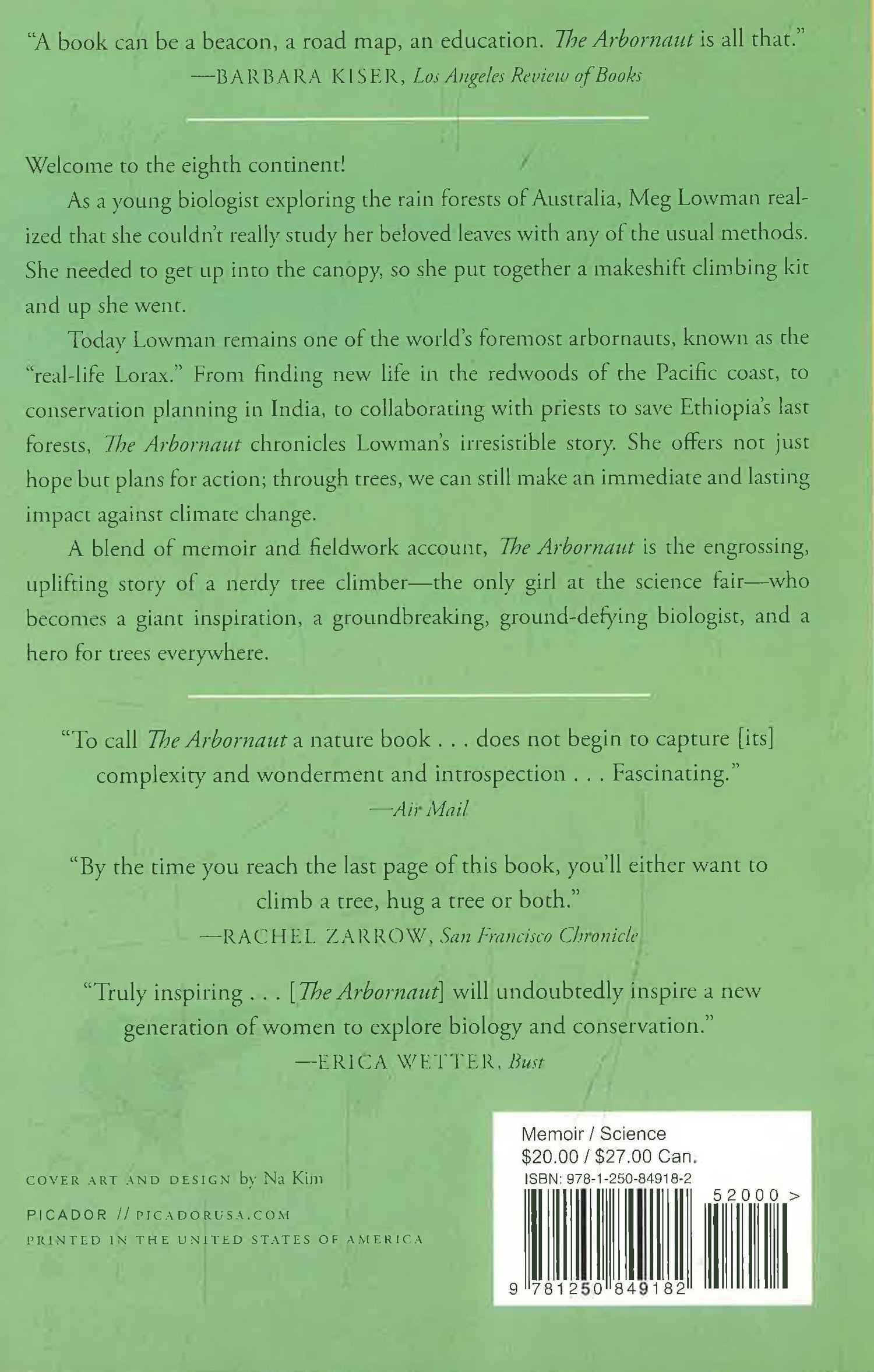 With a voice as infectious in its enthusiasm as it is practical in its optimism, The Arbornaut chronicles Lowman's irresistible story. From climbing solo hundreds of feet into the air in Australia's rainforests to measuring tree growth in the northeastern United States, from searching the redwoods of the Pacific coast for new life to studying leaf eaters in Scotland's Highlands, from conducting a BioBlitz in Malaysia to conservation planning in India and collaborating with priests to save Ethiopia's last forests, Lowman launches us into the life and work of a field scientist, ecologist, and conservationist. She offers hope, specific plans, and recommendations for action; despite devastation across the world, through trees, we can still make an immediate and lasting impact against climate change.