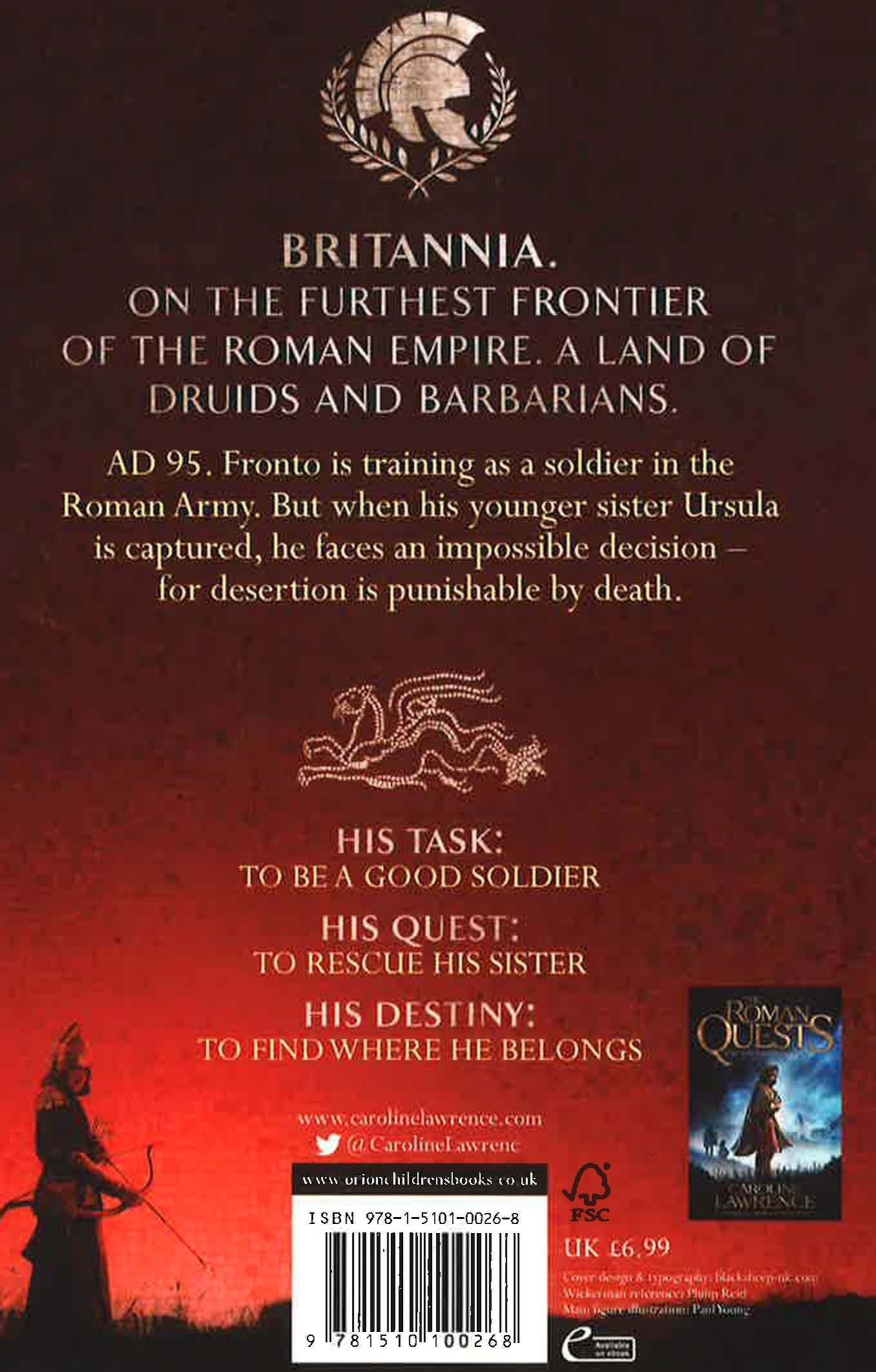 The second thrilling adventure in a new historical series from million-copy-selling Caroline Lawrence, set in Roman Britain during the reign of the evil Emperor Domitian.Britannia AD 94. On the run from the Emperor Domitian, fifteen-year-old Fronto has joined the Roman army in order to find the security and structure he craves. But when his younger sister Ursula is captured by a terrifying Druid called Snakebeard, he must make an impossible decision. Can he leave the army, when desertion is punishable by death?His desire: To become a good soldierHis quest: To rescue his sister His destiny: To find his place in Roman BritainFrom the bestselling author of THE ROMAN MYSTERIES, perfect for children studying at Key Stage 2. Historical locations featured in this book are a British Iron Age Village, Bath Spa and the fortress at Caerleon.