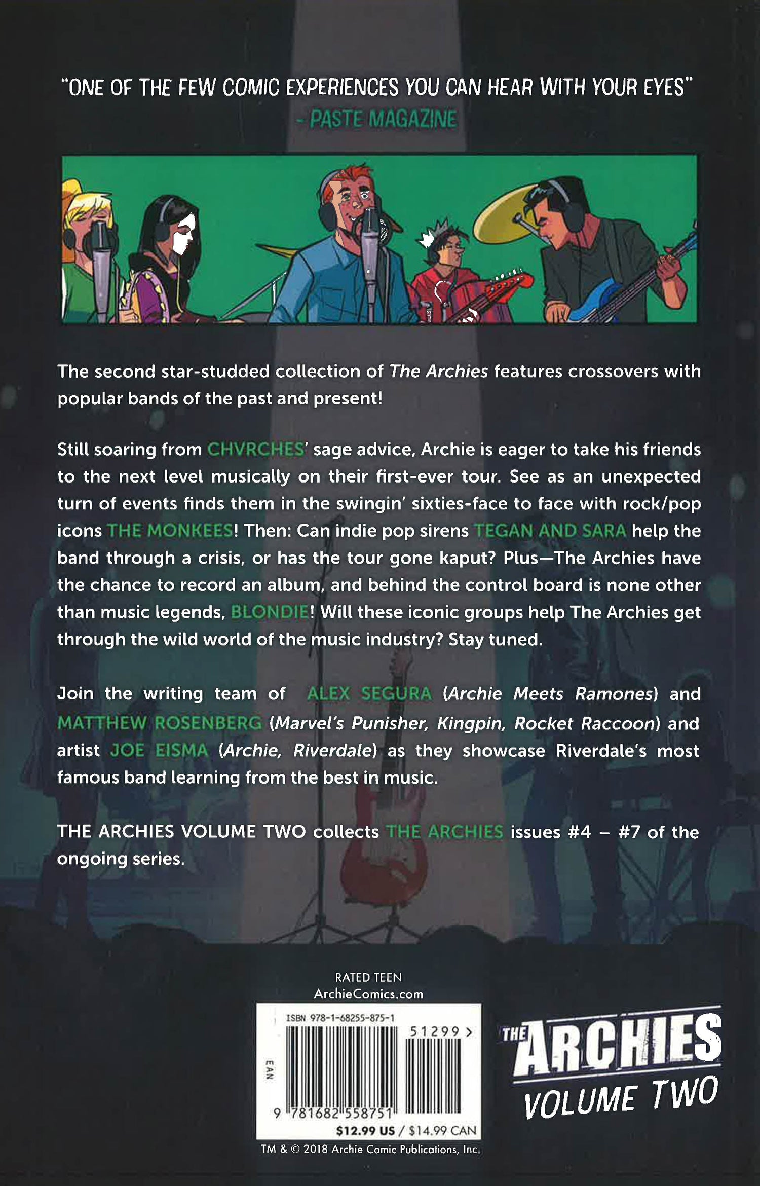 The second star-studded collection of The Archies, featuring crossovers with popular bands of the past and present! The Archies Meet Ramones writing team of Matthew Rosenberg (Marvel's Punisher, Kingpin, Rocket Raccoon) and Alex Segura (Archie Meets KISS) alongside artist Joe Eisma (Archie, Riverdale) showcase Riverdale's most famous band learning from the best in music.