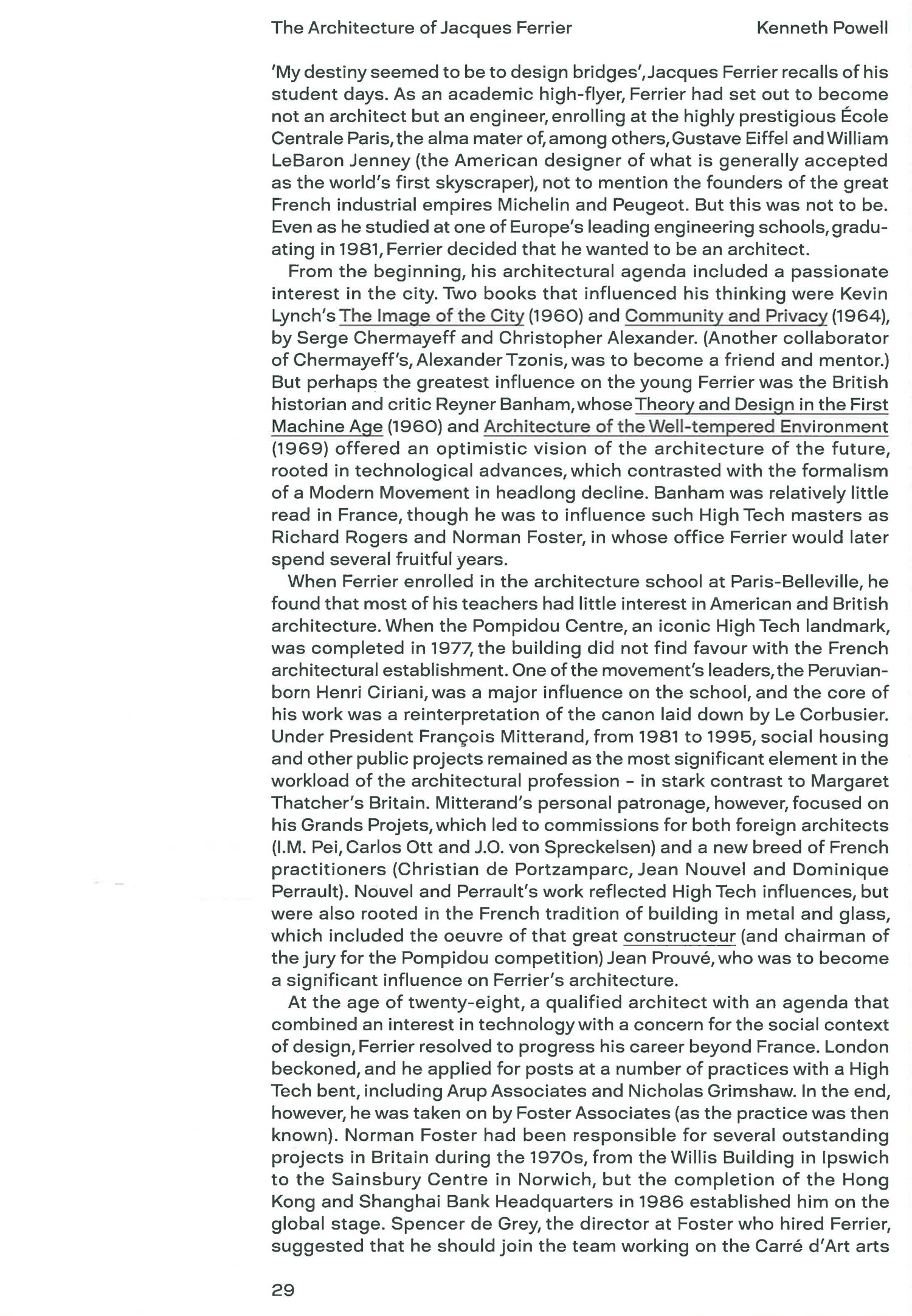 It was perhaps no surprise that Jacques Ferrier was personally selected by French President Nicolas Sarkozy to design the country’s pavilion for the Shanghai World Expo in 2010. It was to become, along with Thomas Heatherwick’s `Seed Cathedral’, one of the most lauded and visited pavilions of the fair, and embodied the key characteristics of Ferrier’s work: a deep interest in technology; the encouragement of social interaction through the use of courtyards, walkways and loggias; and the use of a perforated outer skin that not only responds to the need for internal climatic control but also provides an additional space for informal social gathering while softening the transition from the building’s internal space to the outside world. Influenced by the critic Rayner Banham, by the work of French architect–engineer Jean Prouvé, and by his early experience of working with Norman Foster, Jacques Ferrier has developed a highly individual approach to architecture that seeks to harness technology in order to create buildings and urban environments that fully engage with the practical and emotional needs of people. Central to Ferrier’s philosophy is the idea of the `Sensual City’, which aims to create buildings and cities that engage with the five senses – sound, smell, sight, touch and taste – that are central to human experience. Ferrier is the antithesis of the celebrity `starchitect’, but his work stands out precisely because of its calm thoughtfulness, sensitivity and precision.