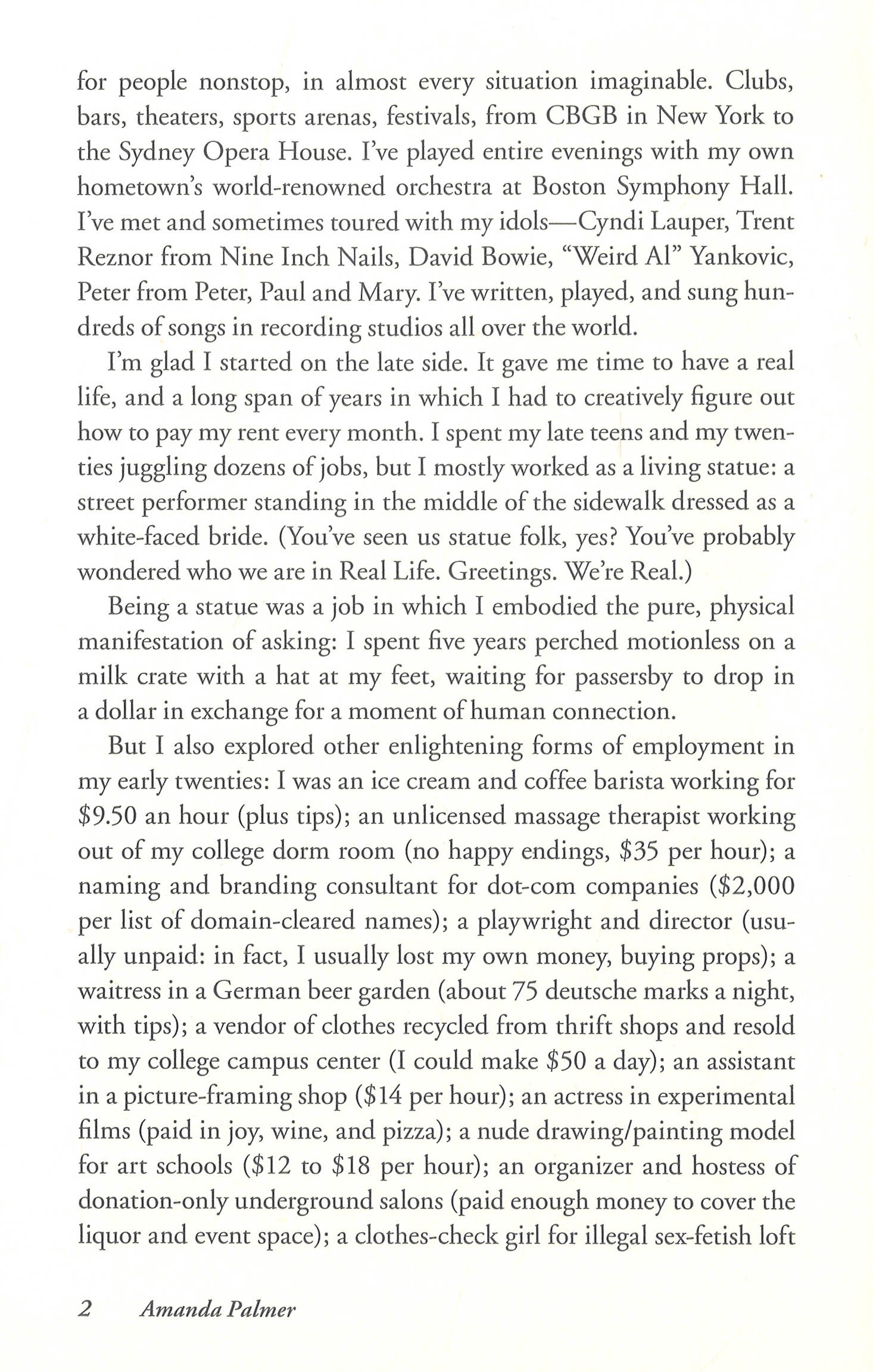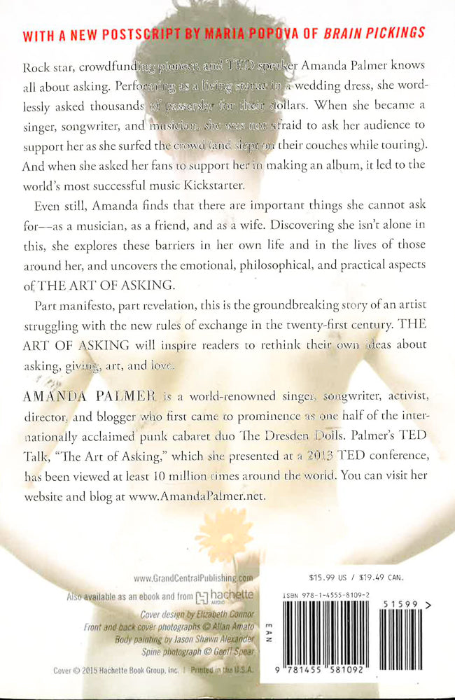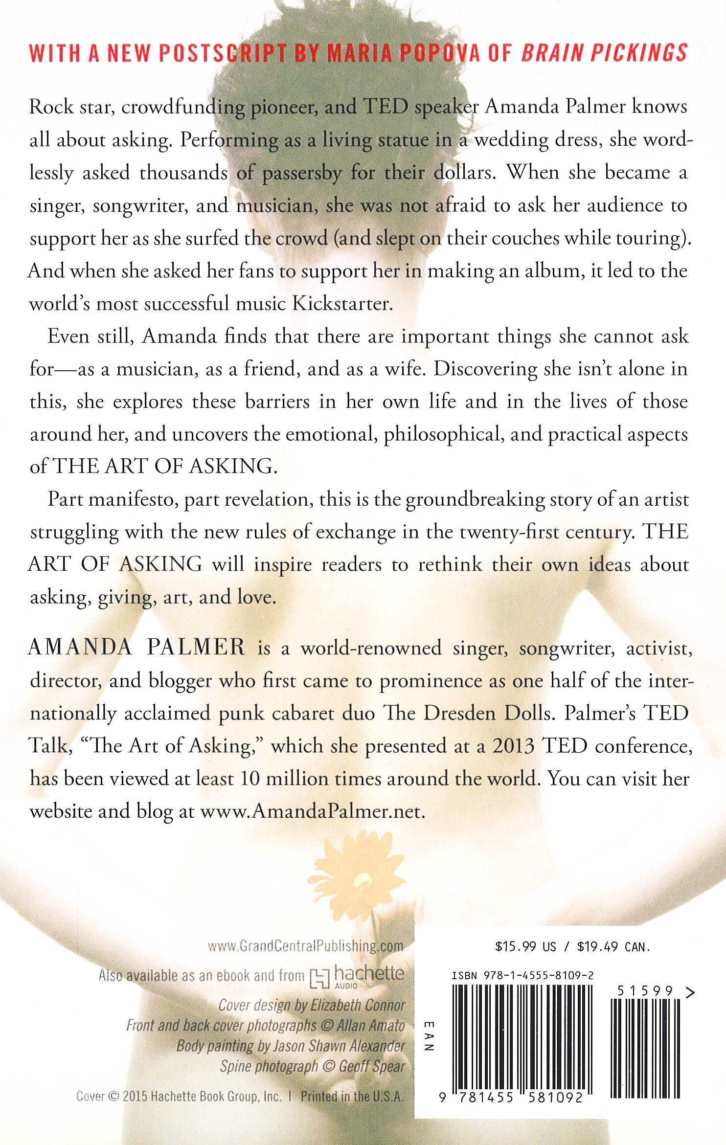 Rock star, crowdfunding pioneer, and TED speaker Amanda Palmer knows all about asking. Performing as a living statue in a wedding dress, she wordlessly asked thousands of passersby for their dollars. When she became a singer, songwriter, and musician, she was not afraid to ask her audience to support her as she surfed the crowd (and slept on their couches while touring). And when she left her record label to strike out on her own, she asked her fans to support her in making an album, leading to the world's most successful music Kickstarter. Even while Amanda is both celebrated and attacked for her fearlessness in asking for help, she finds that there are important things she cannot ask for - as a musician, as a friend, and as a wife. She learns that she isn't alone in this, that so many people are afraid to ask for help, and it paralyzes their lives and relationships. In this groundbreaking book, she explores these barriers in her own life and in the lives of those around her, and discovers the emotional, philosophical, and practical aspects of THE ART OF ASKING. Part manifesto, part revelation, this is the story of an artist struggling with the new rules of exchange in the twenty-first century, both on and off the Internet. THE ART OF ASKING will inspire readers to rethink their own ideas about asking, giving, art, and love.