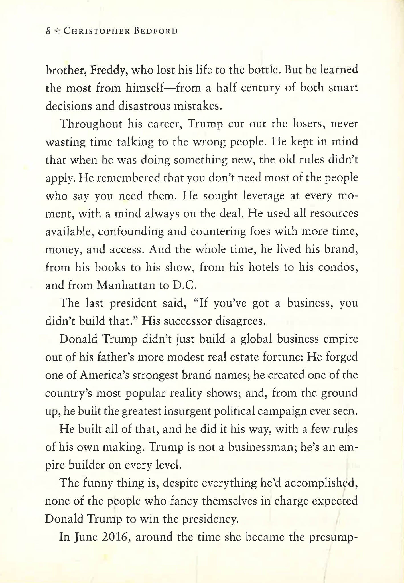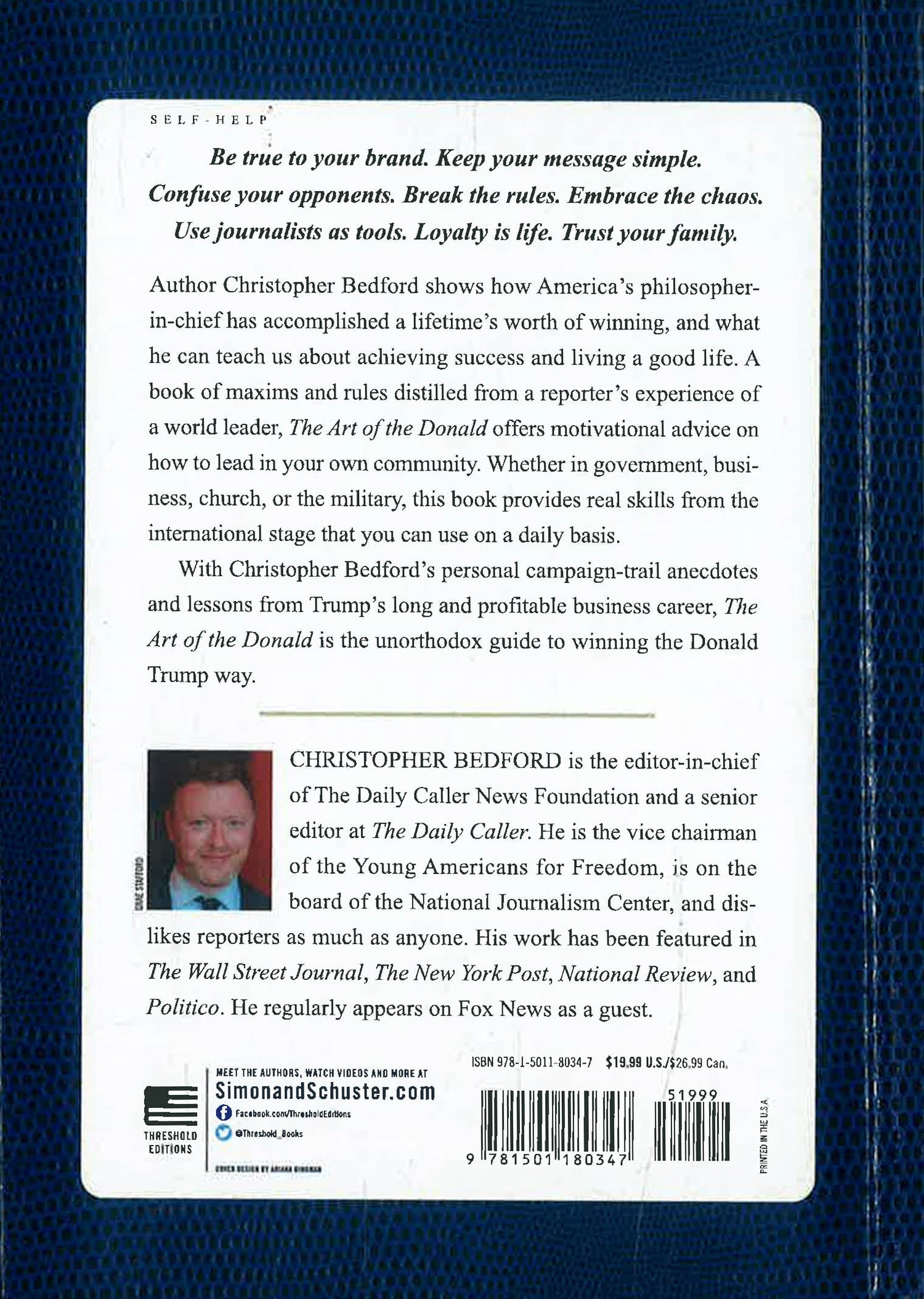 President Donald Trump knows about living the good life and achieving success. With his election to the presidency, he added to a life that already includes billions of dollars, worldwide celebrity, and a beautiful family, despite legions of haters. In The Art of the Donald, Daily Caller News Foundation editor-in-chief Christopher Bedford takes you inside the new president’s unorthodox mind, unlocking the genius of his approach to everything in life and offering you insight into navigating life the Trump way.