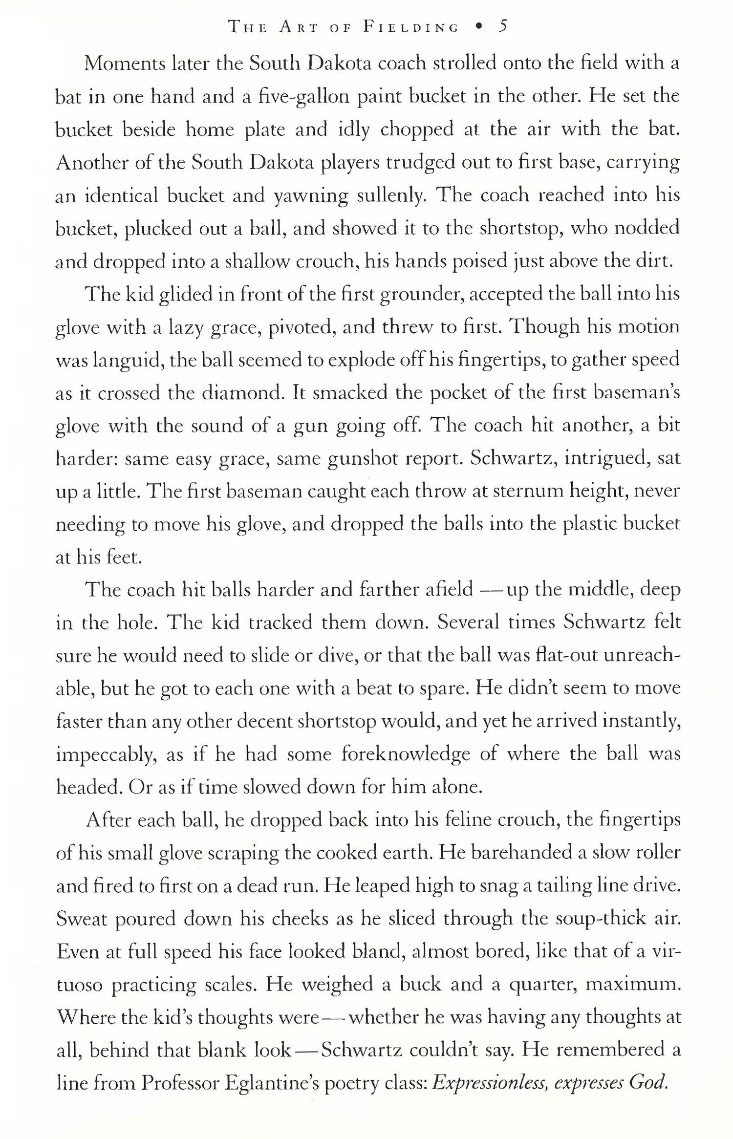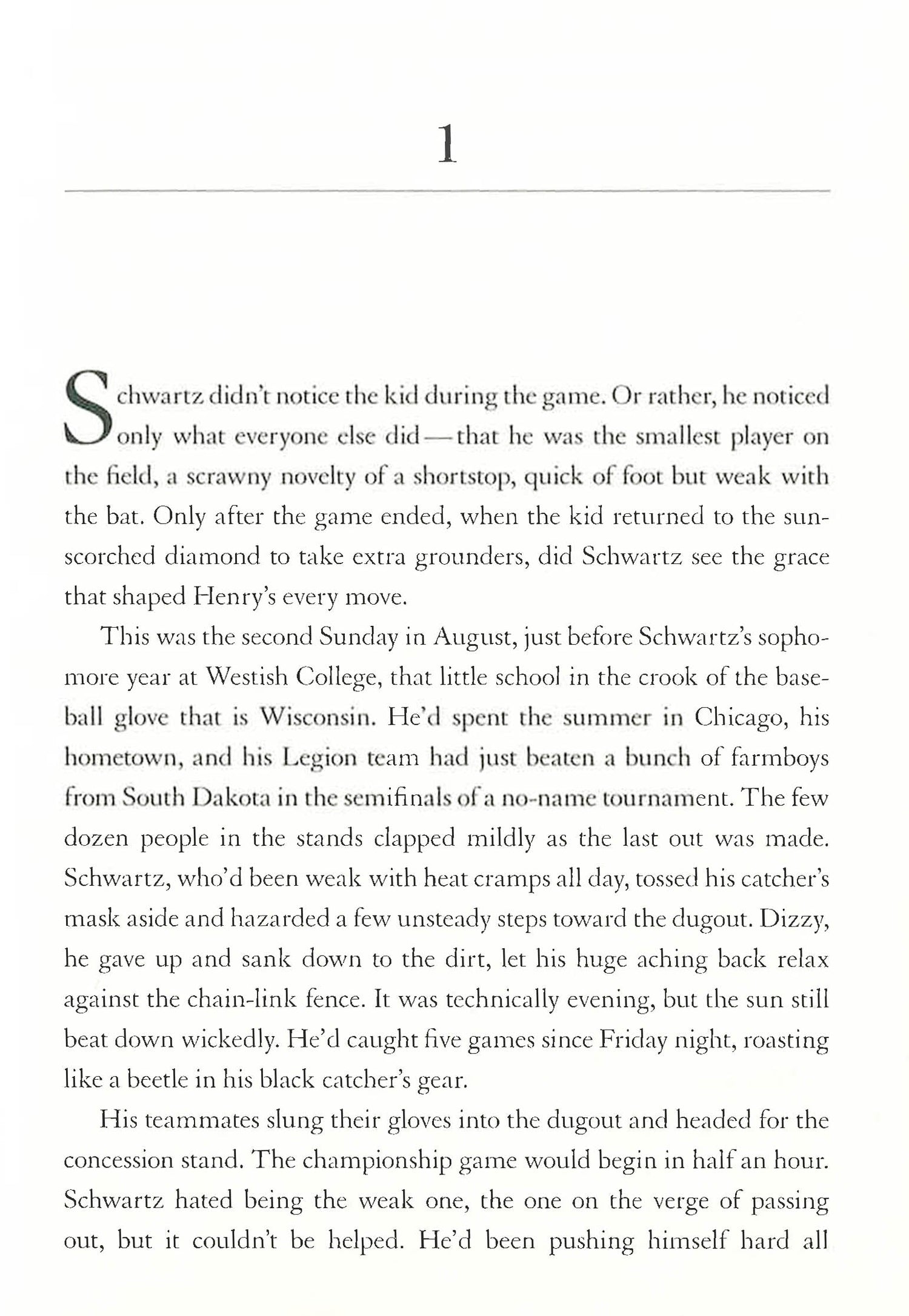 At Westish College, baseball star Henry Skrimshander seems destined for big league until a routine throw goes disastrously off course. In the aftermath of his error, the fates of five people are upended. Henry's fight against self-doubt threatens to ruin his future. College president Guert Affenlight has fallen unexpectedly and helplessly in love. Owen Dunne becomes caught up in a dangerous affair. Mike Schwartz realizes he has guided Henry's career at the expense of his own. And Pella Affenlight returns to Westish after escaping an ill-fated marriage, determined to start a new life. As the season counts down to its climactic final game, these five are forced to confront their deepest hopes, anxieties, and secrets. Written with boundless intelligence and filled with the tenderness of youth, "The Art of Fielding is mere baseball fiction the way Moby Dick is just a fish story" (Nicholas Dawidoff). It is an expansive, warmhearted novel about ambition and its limits, about family and friendship and love, and about commitment--to oneself and to others.