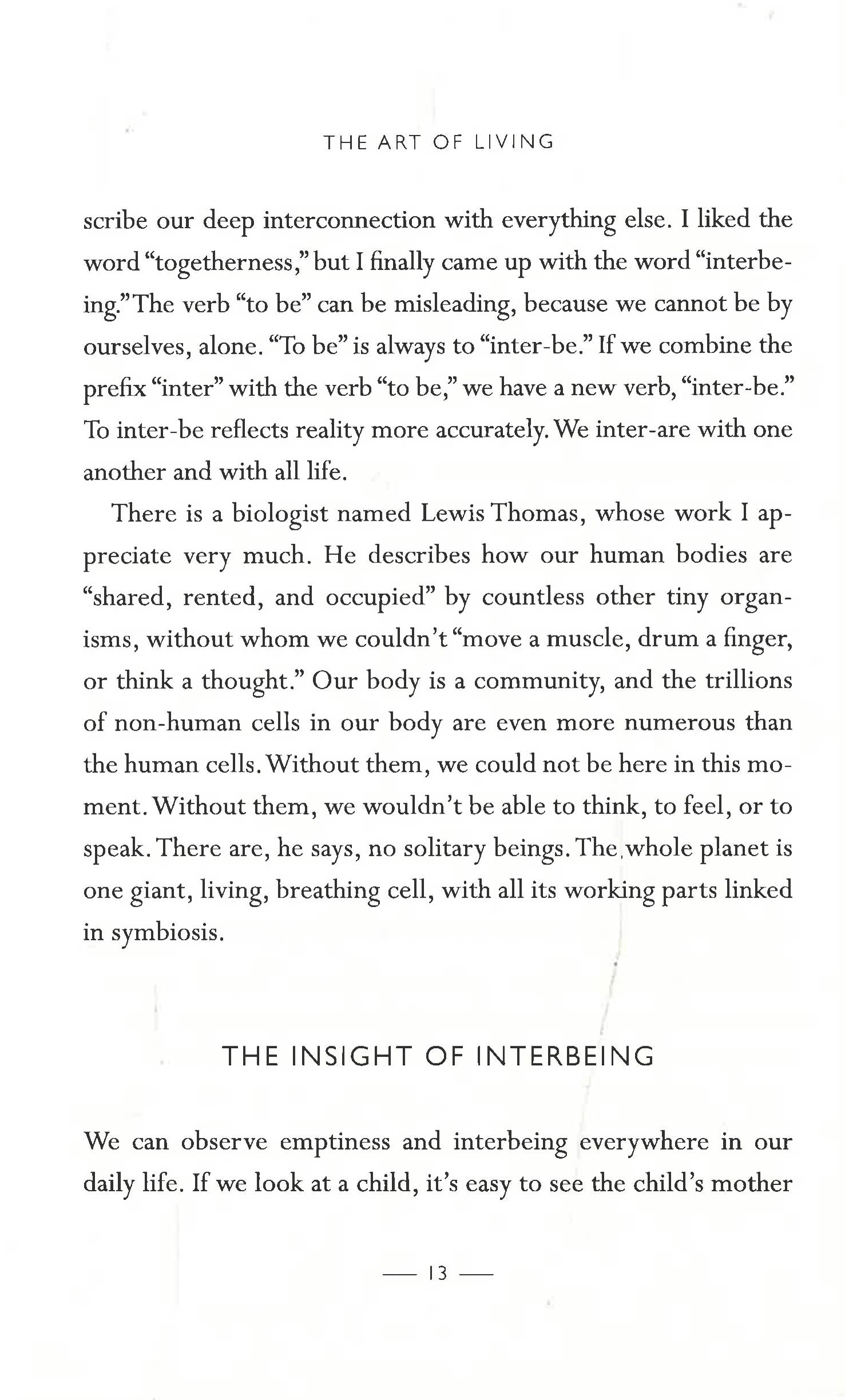 Thich Nhat Hanh is the subject of the major documentary Walk With Me narrated by Benedict Cumberbatch Master the art of living from one of the world s most revered spiritual leaders. Thich Nhat Hanh, the world s most renowned Zen master, turns his mindful attention to the most important subject of all - the art of living. The bestselling author of The Miracle of Mindfulness presents, for the first time, seven transformative meditations that open up new perspectives on our lives, our relationships and our interconnectedness with the world around us. He reveals an art of living in mindfulness that helps us answer life s deepest questions, experience the happiness and freedom we desire and face ageing and dying with curiosity and joy instead of fear. Stimulating and inspiring, this book teaches us the importance of looking inside ourselves and developing compassion, before we can turn to our relationships at home and in the wider world. Full of remarkable stories from Thich Nhat Hanh s own experiences and mindful practices for engaging with life, this will be a book that will help us generate happiness, understanding and love so we can live deeply in each moment of our life, right where we are.