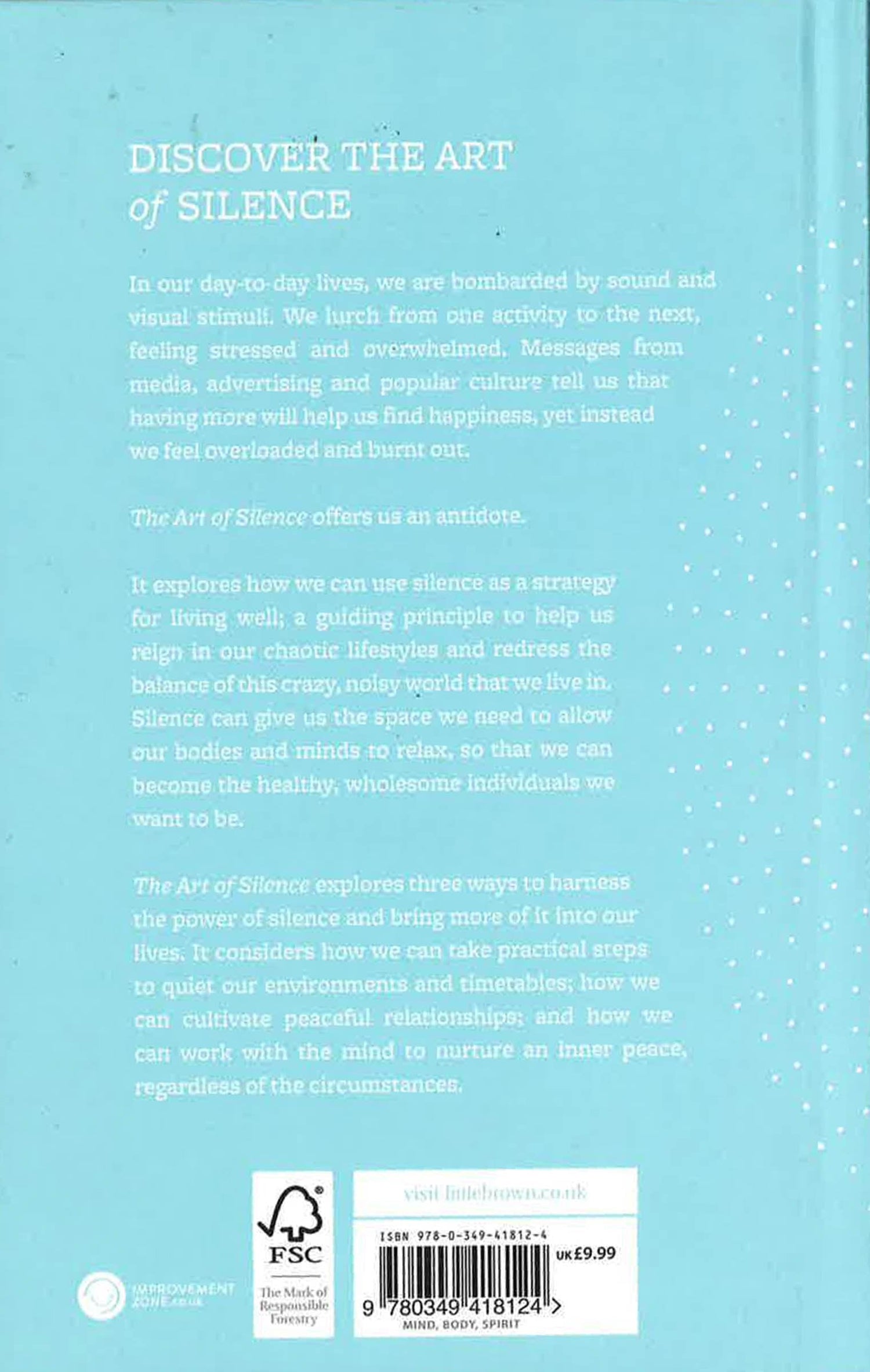 It explores how we can use silence as a strategy for living well; a guiding principle to help us reign in our chaotic lifestyles and redress the balance of this crazy, noisy world that we live in. It can give us the space we need to allow our bodies and minds to relax and become the healthy, wholesome individuals we want to be.