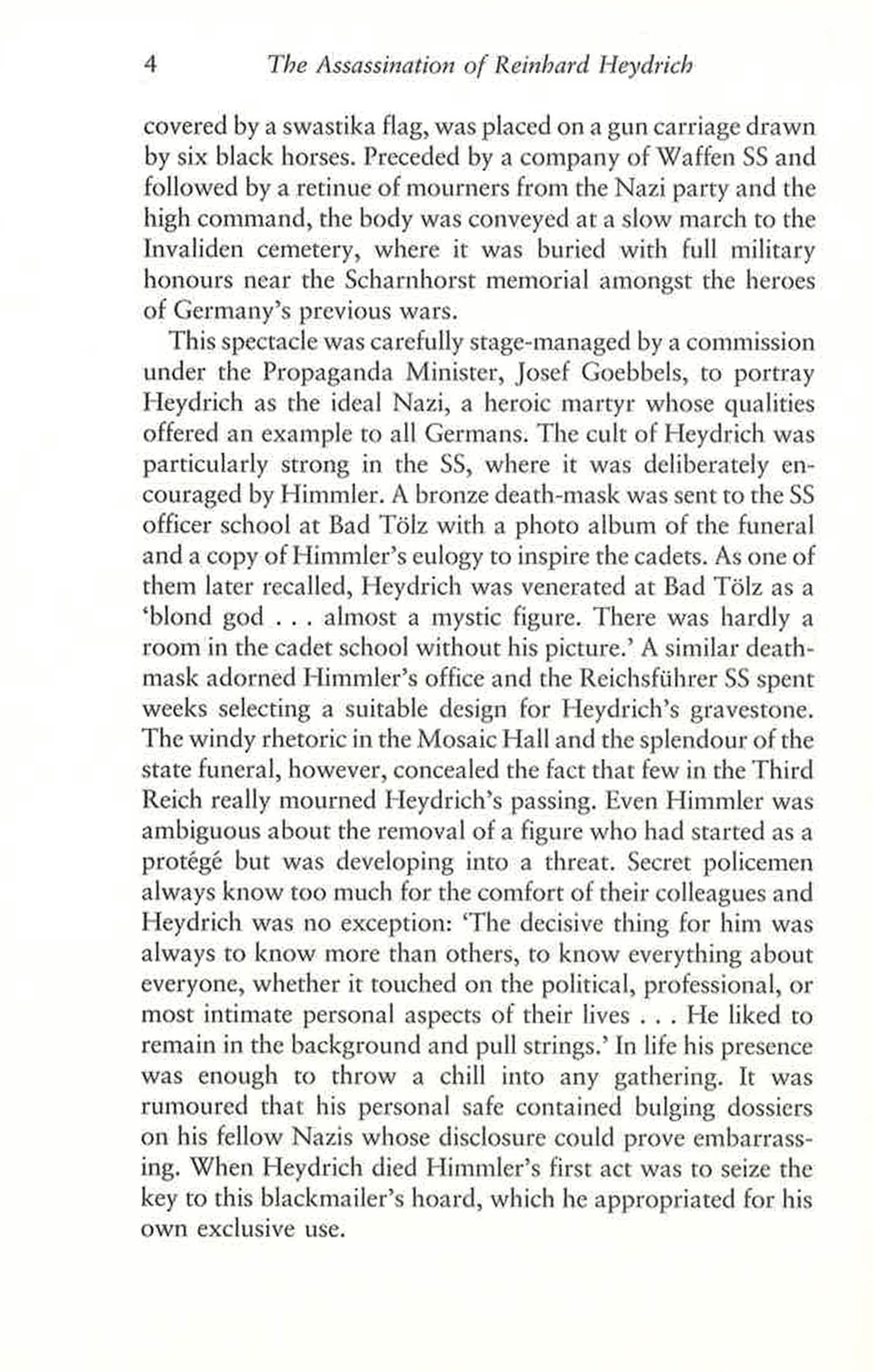 On 4 June 1942 one of the most powerful figures of the Nazi regime died in agony from wounds sustained during an assassination attempt in Prague. This is the story of the killing of Reinhard Heydrich, a man of extraordinary intelligence, ruthlessness and ambition who had risen from obscurity to become head of the Nazi security police and Governor of Bohemia-Moravia. Regarded by many as Hitler's most likely successor, he was feared and hated even by other high-ranking Nazi officials. Heydrich's death caused shockwaves throughout the Nazi leadership, provoking ferocious reprisals against Czechs and Jews. Those who carried out the assassination were hunted down, and, trapped like rats in the cellar of a Prague church, committed suicide rather than face the certainty of torture and execution at the hands of the SS. Based on original archive material, interviews with surviving members of the Special Operations Executive, who trained the Czech assassins in the UK, and Czech military intelligence, Callum MacDonald's book is a well-researched and gripping account of one of the most audacious assassinations of the Second World War.