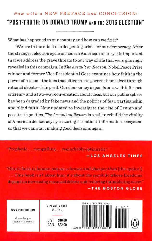 An alternate cover edition exists here. Nobel Peace Prize winner, bestselling author, activist, and political icon, Al Gore has become one of the most respected and influential public intellectuals in America today. The Assault on Reason takes an unprecedented look at how faith in the power of reason?the idea that citizens can govern themselves through rational debate?is now under assault. The marketplace of ideas, once open to everyone through the printed word, has been corrupted by the politics of fear, secrecy, cronyism, and blind faith. By leading us to an understanding of what we can do to restore the rule of reason, Gore has written a farsighted and powerful manifesto for clear thinking. A #1 New York Times bestseller: A visionary analysis of the degradation of our public sphere and its consequences for our democracy. *This book may have remainder mark*