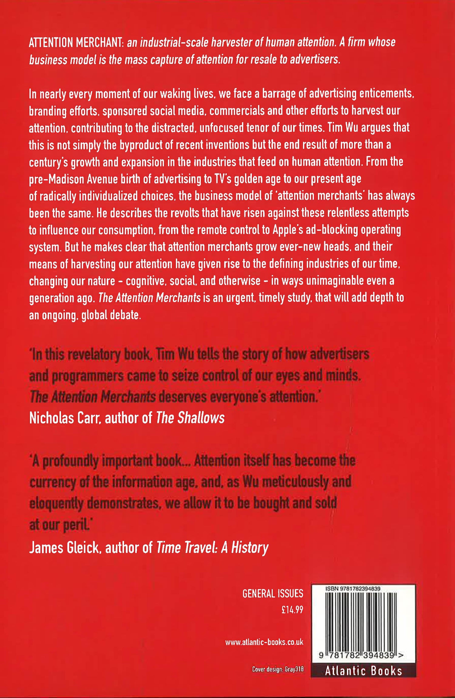 Attention merchant: an industrial-scale harvester of human attention. A firm whose business model is the mass capture of attention for resale to advertisers. In nearly every moment of our waking lives, we face a barrage of advertising enticements, branding efforts, sponsored social media, commercials and other efforts to harvest our attention. Over the last century, few times or spaces have remained uncultivated by the 'attention merchants', contributing to the distracted, unfocused tenor of our times. Tim Wu argues that this is not simply the byproduct of recent inventions but the end result of more than a century's growth and expansion in the industries that feed on human attention. From the pre-Madison Avenue birth of advertising to TV's golden age to our present age of radically individualized choices, the business model of 'attention merchants' has always been the same. He describes the revolts that have risen against these relentless attempts to influence our consumption, from the remote control to FDA regulations to Apple's ad-blocking OS. But he makes clear that attention merchants grow ever-new heads, and their means of harvesting our attention have given rise to the defining industries of our time, changing our nature - cognitive, social, and otherwise - in ways unimaginable even a generation ago.