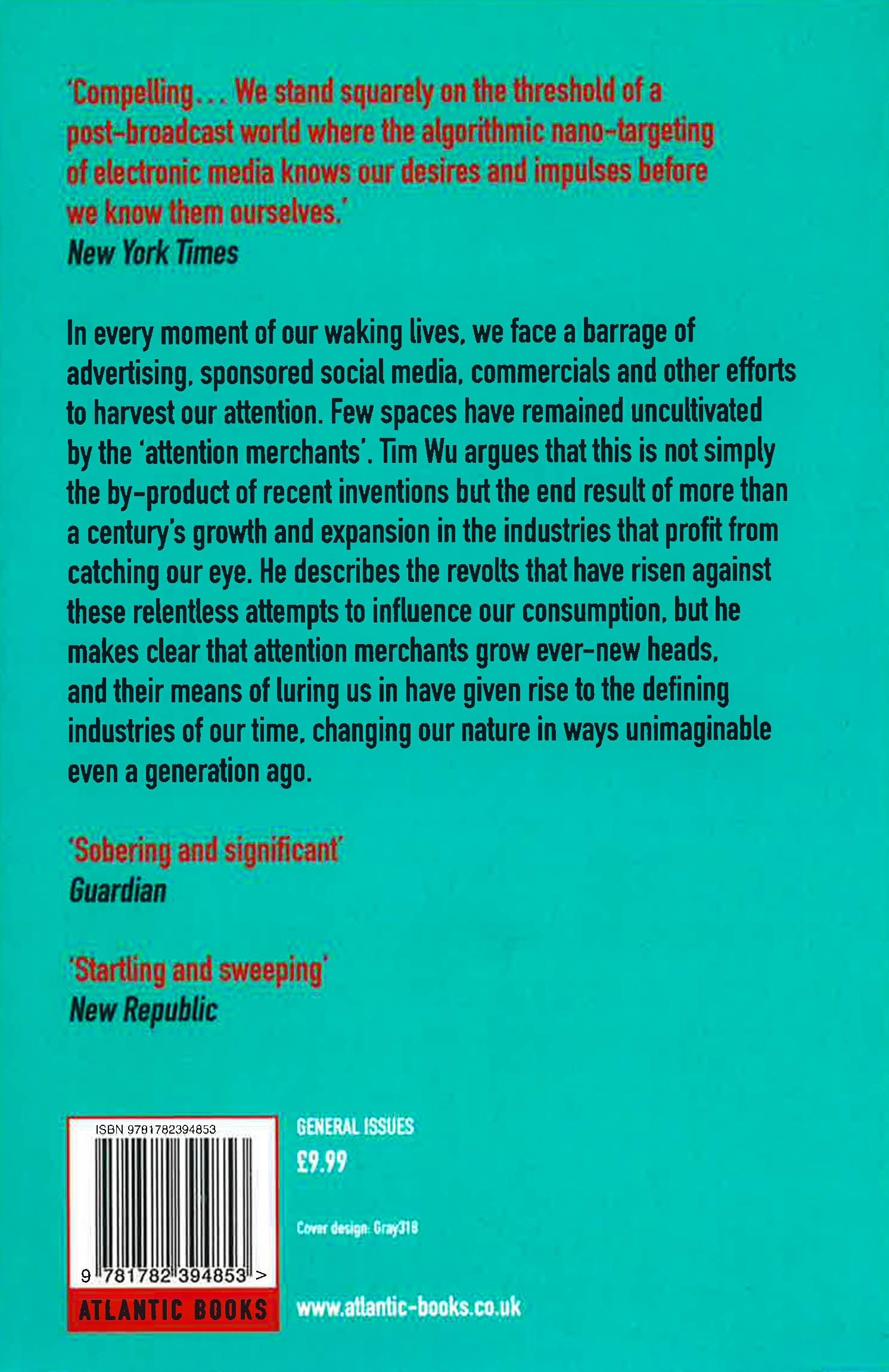 In nearly every moment of our waking lives, we face a barrage of advertising enticements, branding efforts, sponsored social media, commercials and other efforts to harvest our attention. Over the last century, few times or spaces have remained uncultivated by the 'attention merchants', contributing to the distracted, unfocused tenor of our times. Tim Wu argues that this is not simply the byproduct of recent inventions but the end result of more than a century's growth and expansion in the industries that feed on human attention. From the pre-Madison Avenue birth of advertising to TV's golden age to our present age of radically individualized choices, the business model of 'attention merchants' has always been the same. He describes the revolts that have risen against these relentless attempts to influence our consumption, from the remote control to FDA regulations to Apple's ad-blocking OS. But he makes clear that attention merchants grow ever-new heads, and their means of harvesting our attention have given rise to the defining industries of our time, changing our nature - cognitive, social, and otherwise - in ways unimaginable even a generation ago.