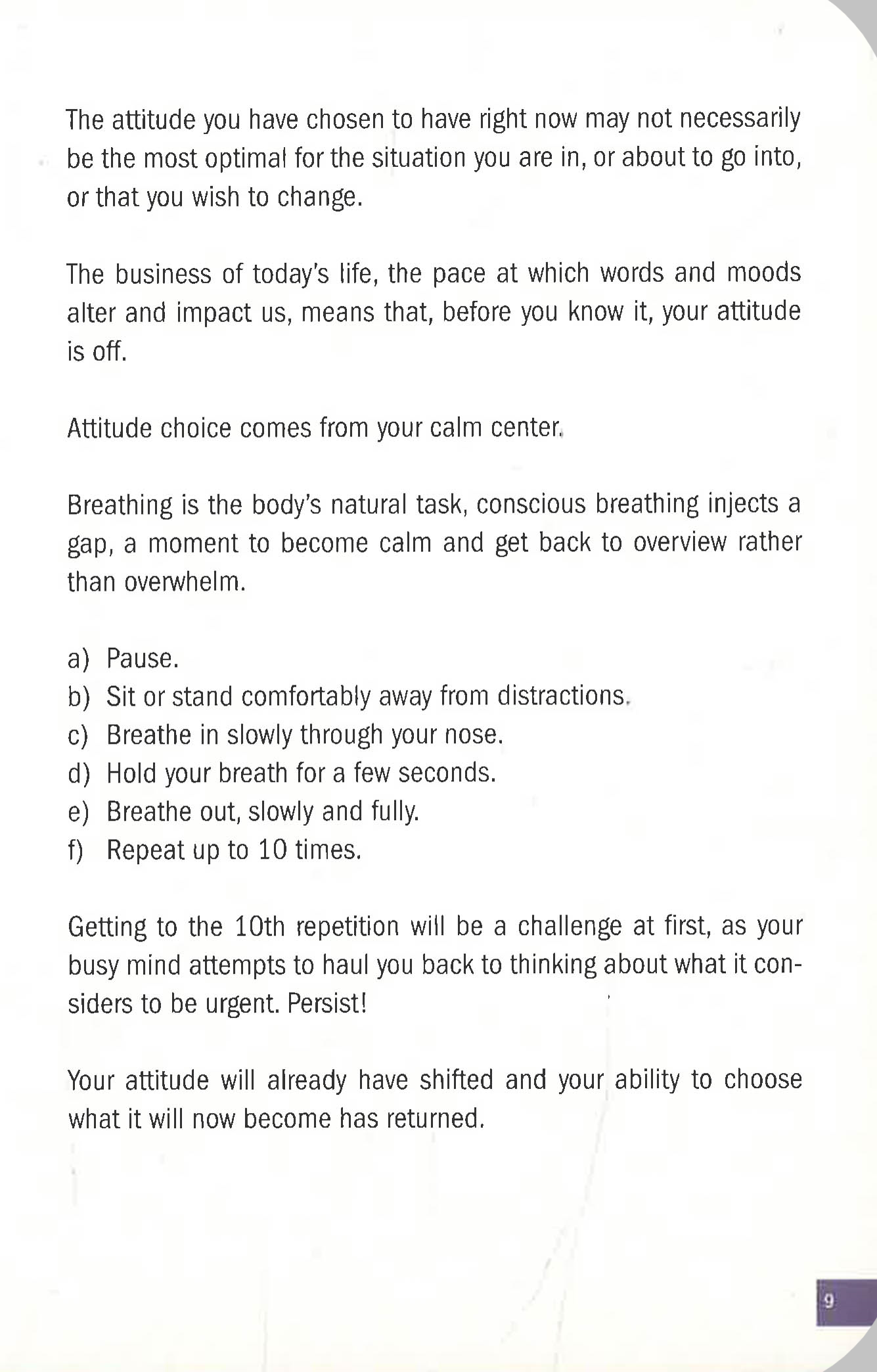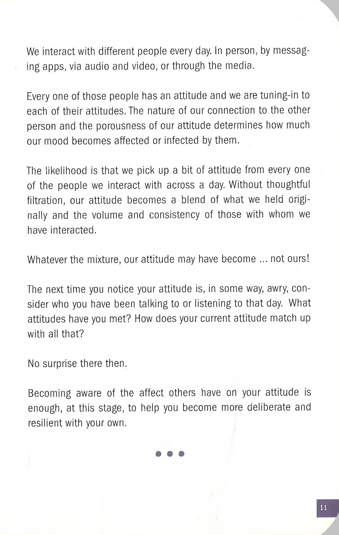The definition of attitude: an expression of favour or disfavour toward a person, thing or event. As human beings, we often find ourselves locked into certain habits, patterns, and behaviours. However, that is not to say we do not have a choice, especially when it comes to our attitude toward people, situations, and outcomes. In this original and engaging book, a leading business coach demonstrates how we can shift our attitudes to create positive change and outcomes in our work and personal lives. In doing so, he helps us to reassess our current habits and behaviours, and makes us realise the wider choices we have in coping and dealing with people, issues and problems in our everyday lives.