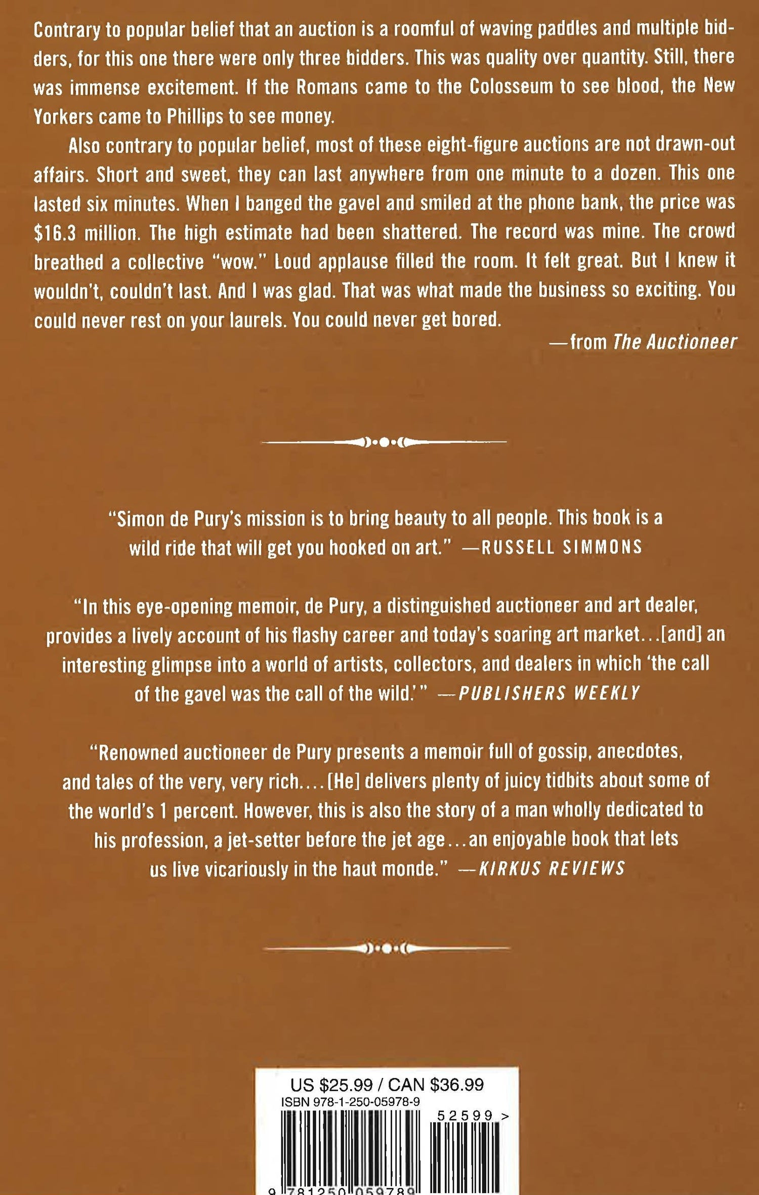 Just as William Goldman, the ultimate screenwriter, took us inside Hollywood, Simon de Pury, the ultimate art player, will take us inside an even more secretive business, whose staggering prices, famous collectors, and high crimes are front page news almost every day. The former Chairman of Sotheby's Europe, the former owner of Sotheby's rival Phillips de Pury, and currently a London-based dealer and advisor to great collectors around the world, Simon has one of the highest profiles of any non-artist in the art world. Even though he has an ancient title and the aura of an elegant Swiss banker, Simon is famous as an iconoclast and is known as "The Mick Jagger of Auctions" for his showmanship and exuberance. His whole life in art has been devoted to bringing art to the public and to the juxtaposition of high and low. Movie stars, musicians, and athletes compete with hedge funders and billionaires for the great art, and Simon is their pied piper; he wants to turn the world onto art and this book will be his message.