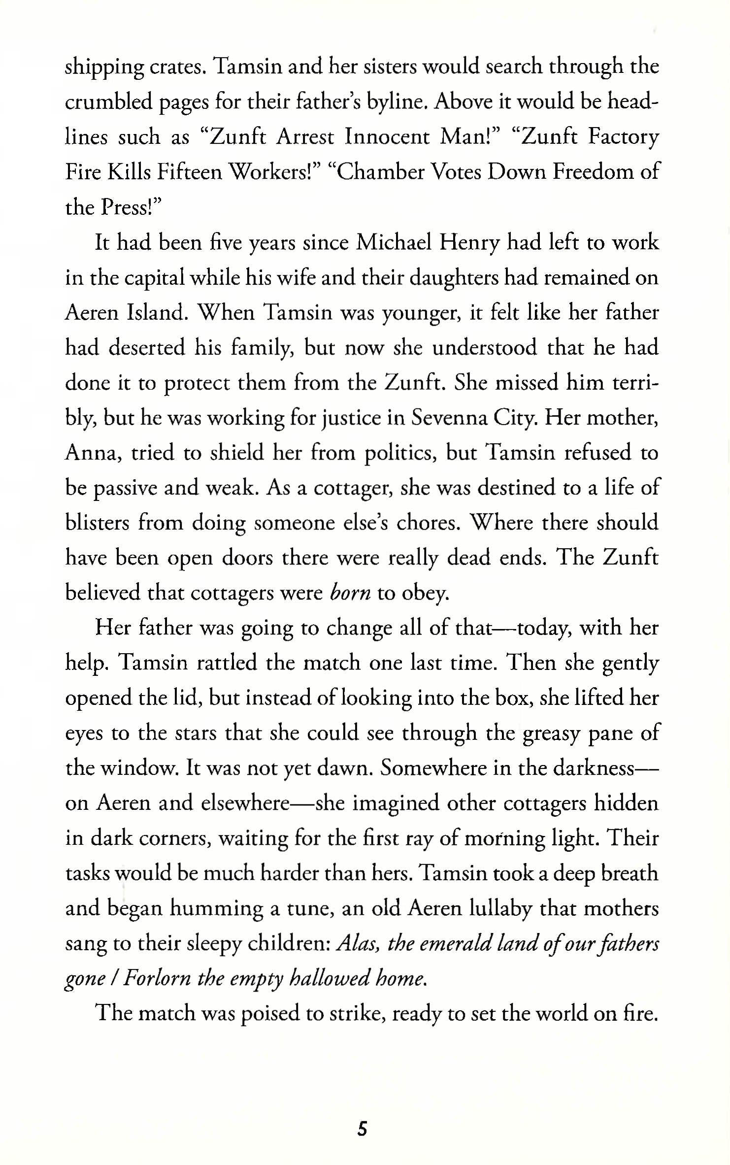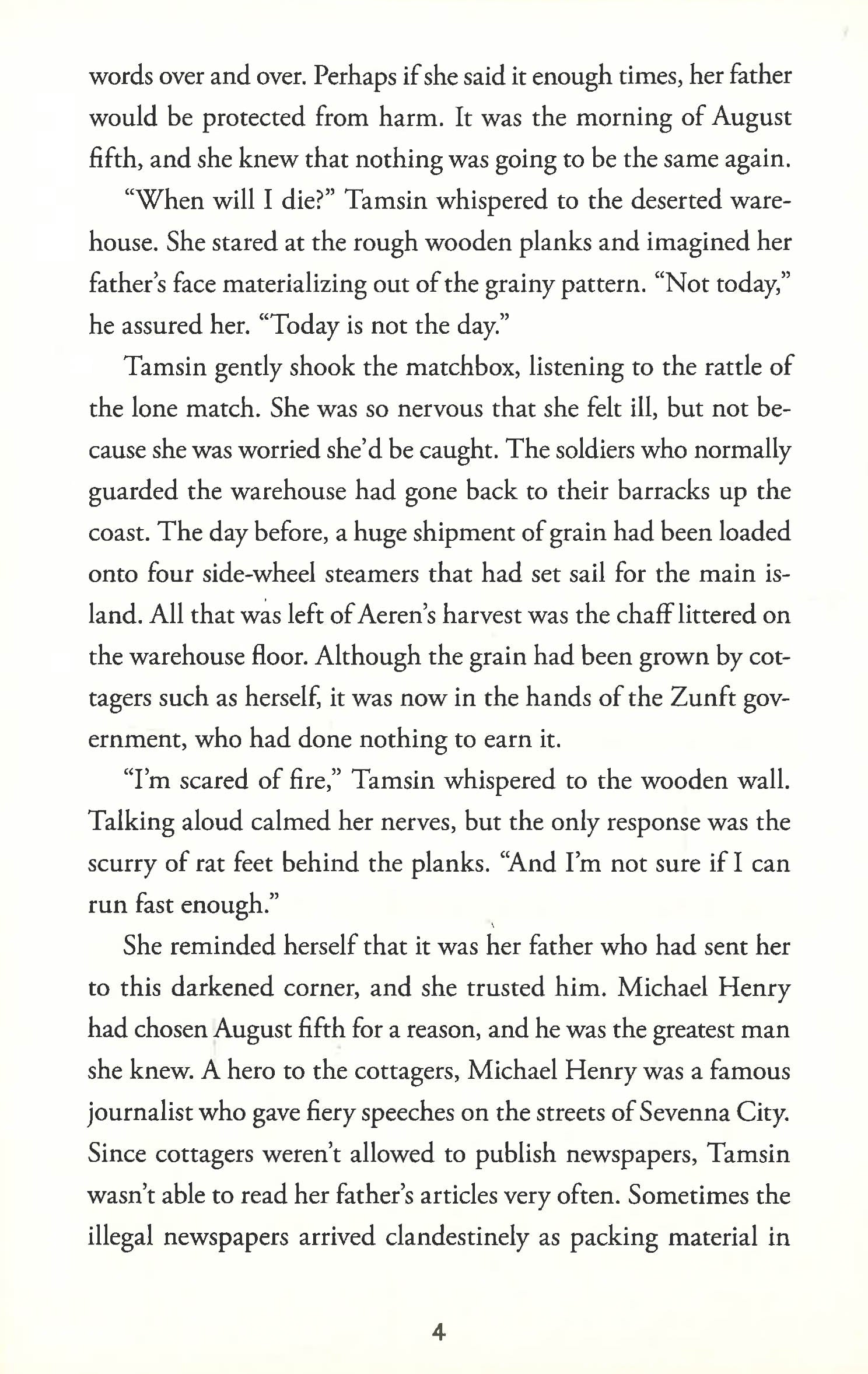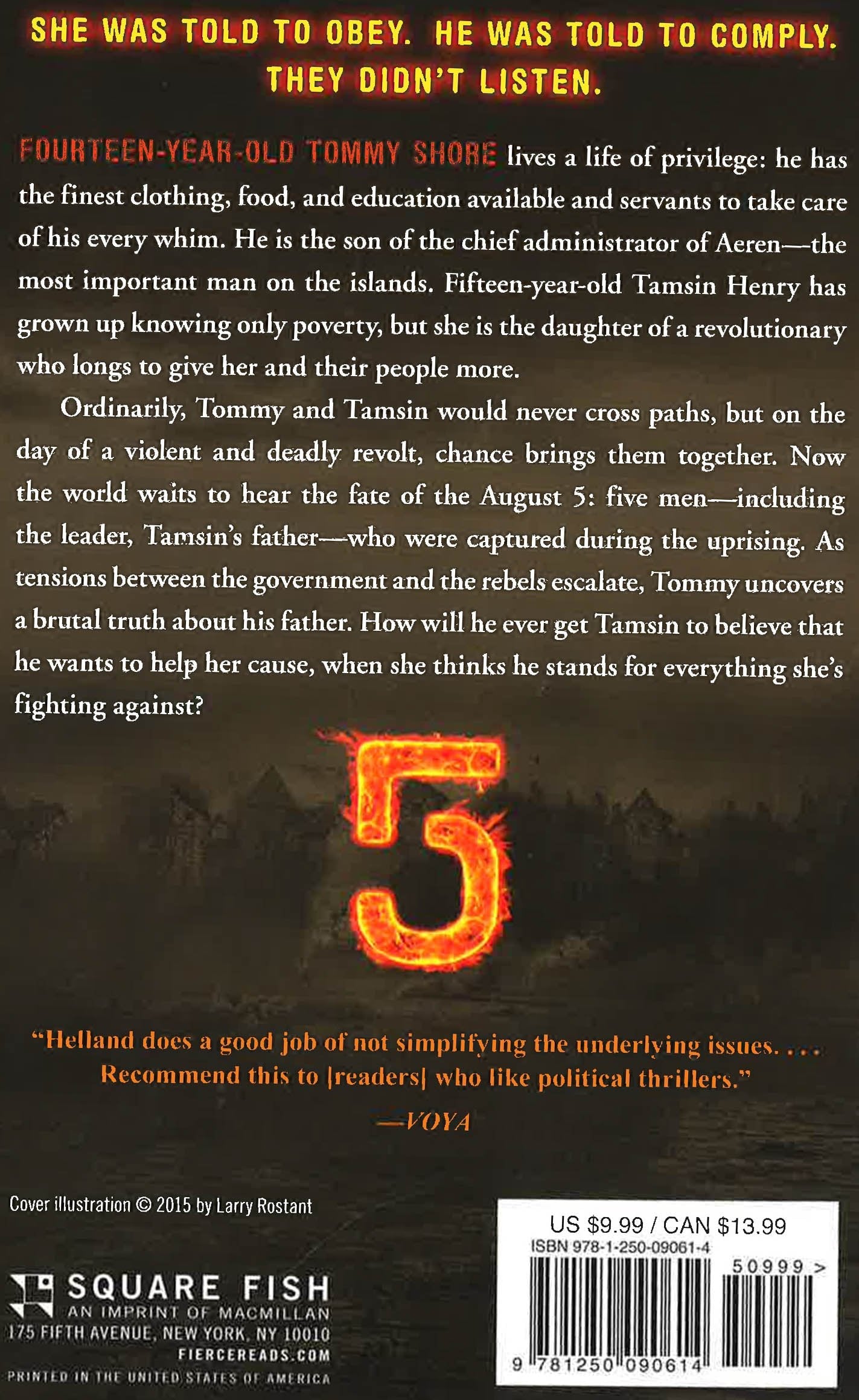 A richly imagined tale of star-crossed love, The August 5 by Jenna Helland is filled with political intrigue, danger, and suspense. Sixteen-year-old Tommy Shore lives a life of privilege: the finest clothing, food, and education available. He is the son of the chief administrator of Aeren--the most important man on the islands. Fifteen-year-old Tamsin Henry has grown up knowing only poverty, but she is the daughter of a revolutionary who longs to give her and their people more. Ordinarily, Tommy and Tamsin would never cross paths, but on the day of a violent and deadly revolt, chance brings them together. As the tensions between the government and the rebels escalate, Tommy uncovers a brutal truth about his father. How will he ever get Tamsin to trust that he wants to help when she sees him as the enemy? In the end, Tommy and Tamsin learn that sometimes the honorable thing to do demands the most amount of courage.