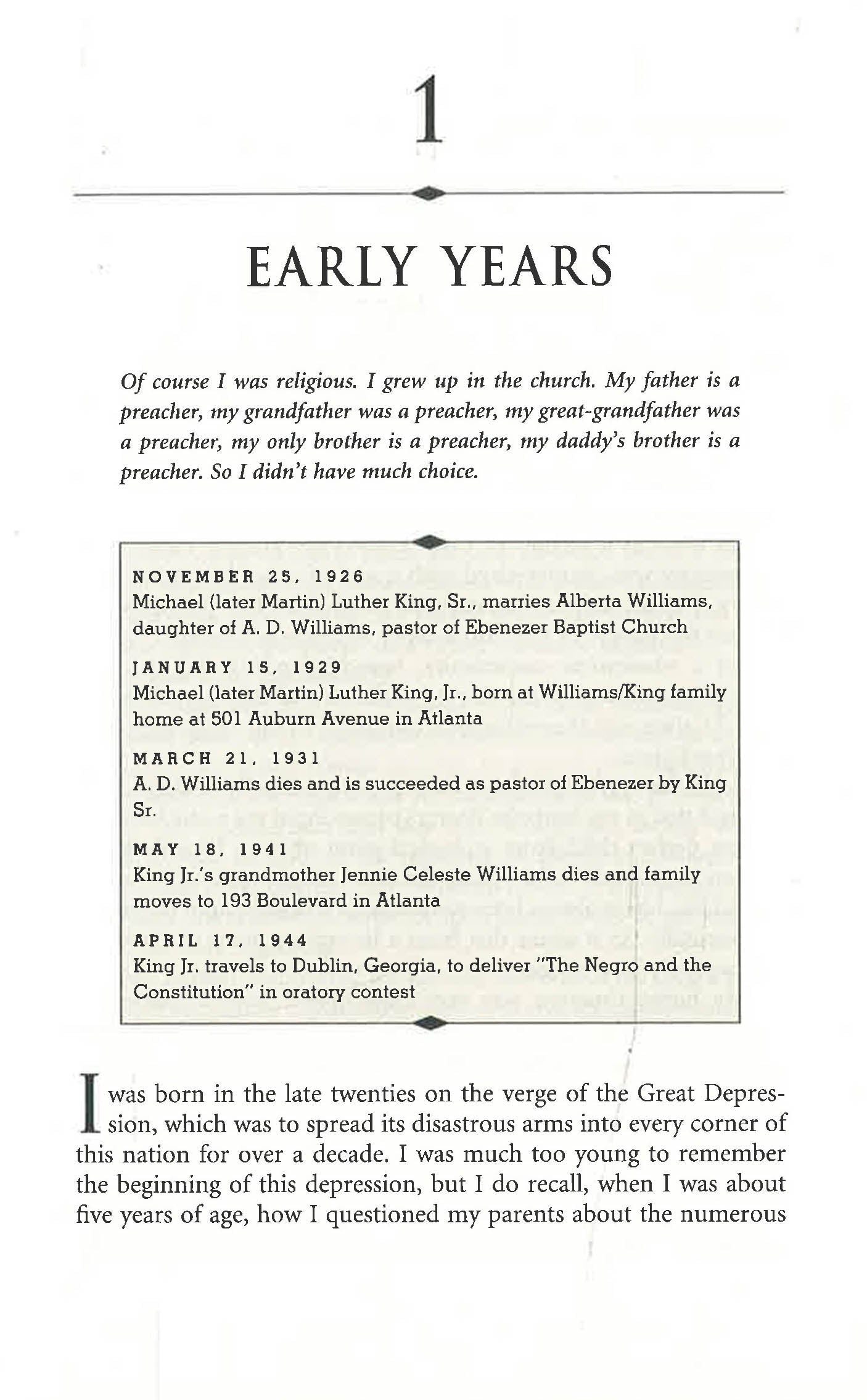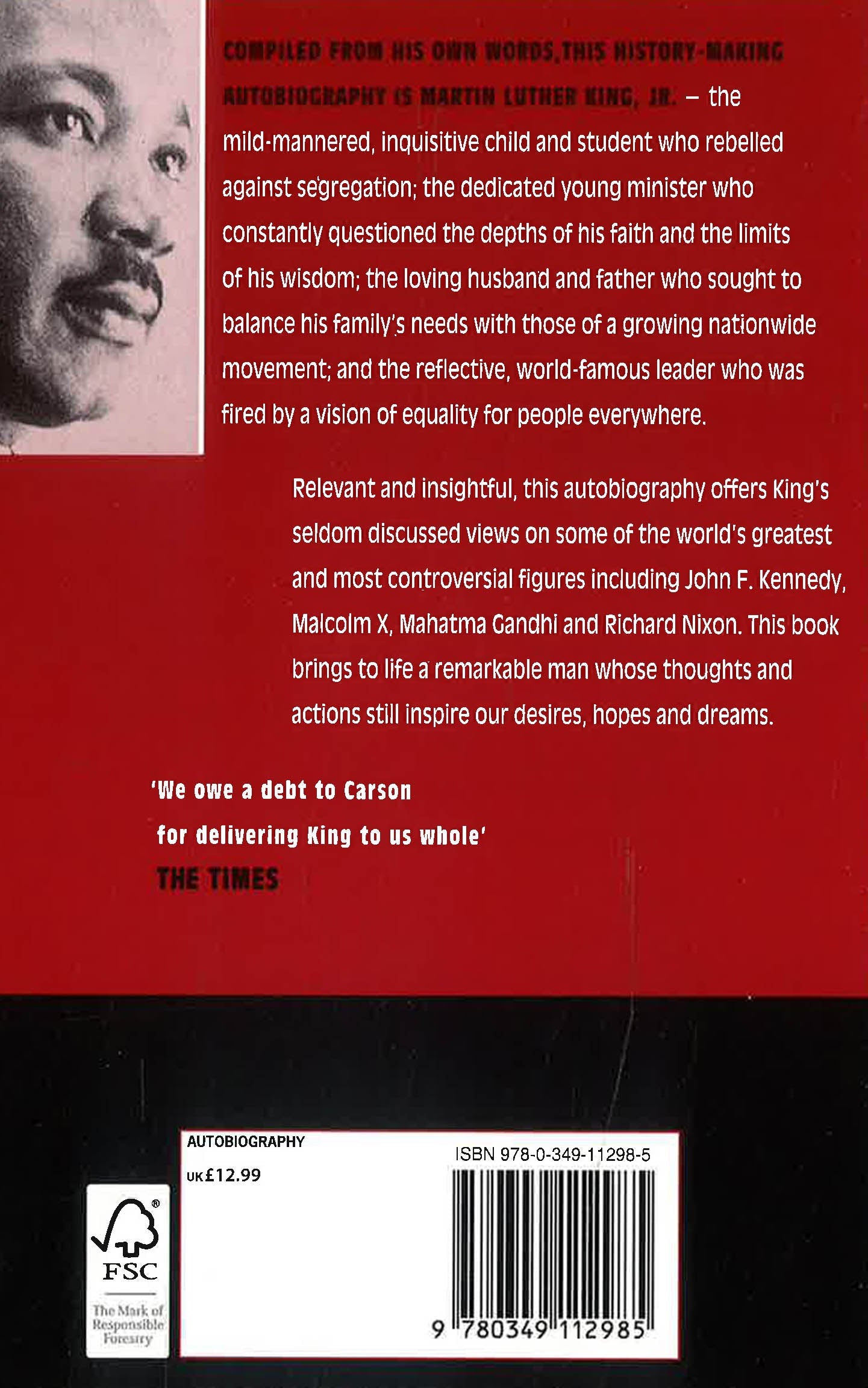 With knowledge, spirit, good humour and passion, The Autobiography of Martin Luther King, Jr brings to life a remarkable man whose thoughts and actions speak to our most burning contemporary issues and still inspire the desires, hopes and dreams of us all. Written in his own words, this history-making autobiography is Martin Luther King: the mild-mannered, inquisitive child and student who rebelled against segregation; the dedicated young minister who constantly questioned the depths of his faith and the limits of his wisdom; the loving husband and father who sought to balance his family's needs with those of a growing nationwide movement; and the reflective, world-famous leader who was fired by a vision of equality for people everywhere.Relevant and insightful, this autobiography offers King's seldom discussed views on some of the world's greatest and most controversial figures including John F. Kennedy, Malcolm X, Mahatma Gandhi and Richard Nixon. It also paints a rich and moving portrait of a people, a time and a nation in the face of powerful change. Finally, it shows how everyday Americans from all walks of life confronted themselves, each other and the burden of the past - and how their fears and courage helped shape our future.