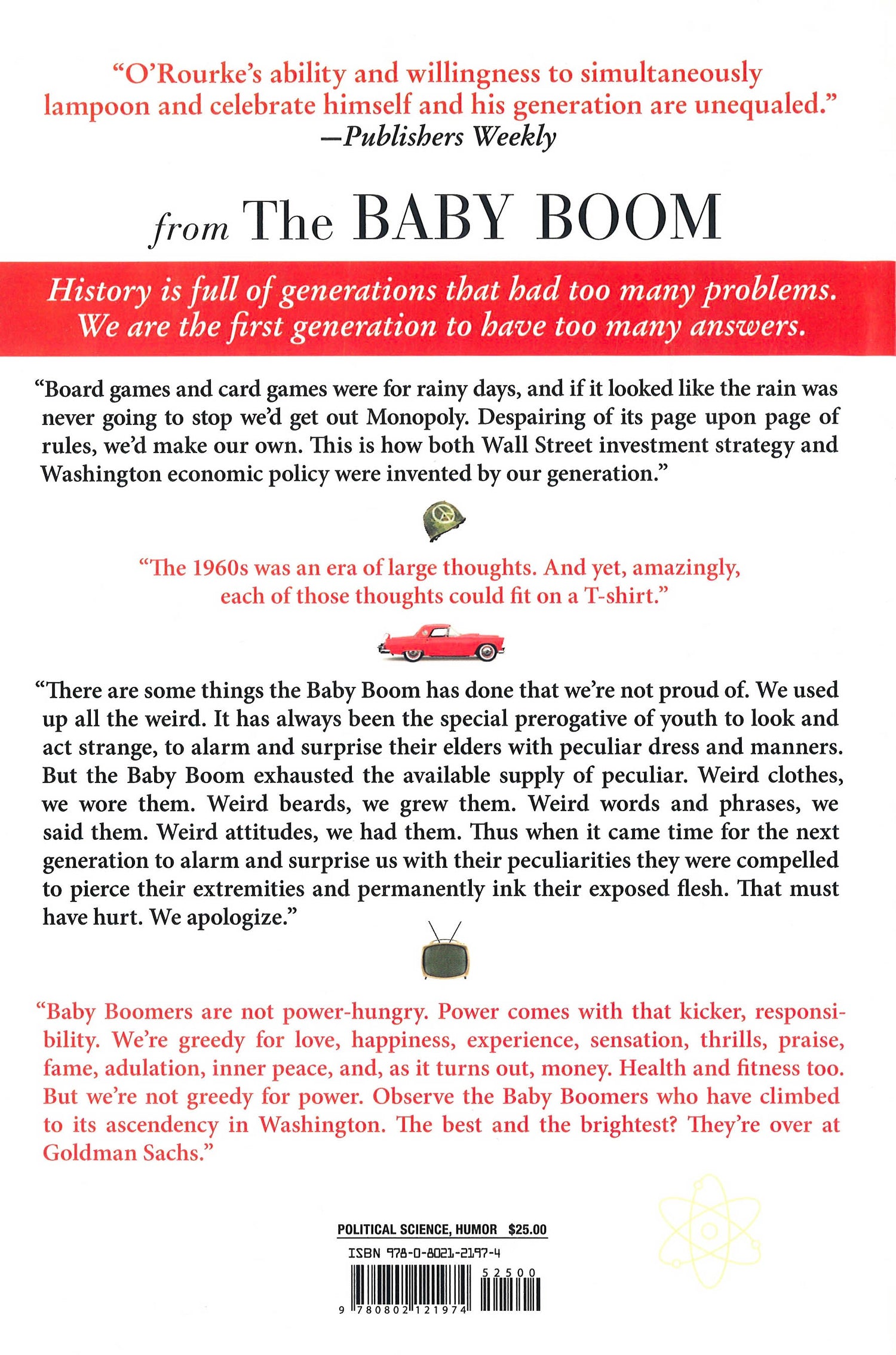 Now O'Rourke, born at the peak of the Baby Boom, turns his keen eye on himself and his 75 million accomplices in making America what it is today. With laughter as an analytical tool, he uses his own very average, if sometimes uproarious experiences as a key to his exceptional age cohort. He writes about the way the post-war generation somehow came of age by never quite growing up and created a better society by turning society upside down.