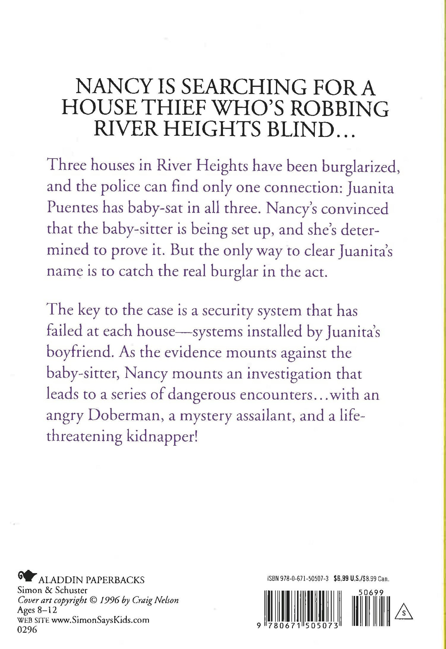Three houses have been burgled in River Heights and the police can find only one connection - Juanita Puentes has baby-sat in all three. Nancy's convinced that Juanita is being set up for the crimes, and she's determined to prove it by catching the true burglar in the act.