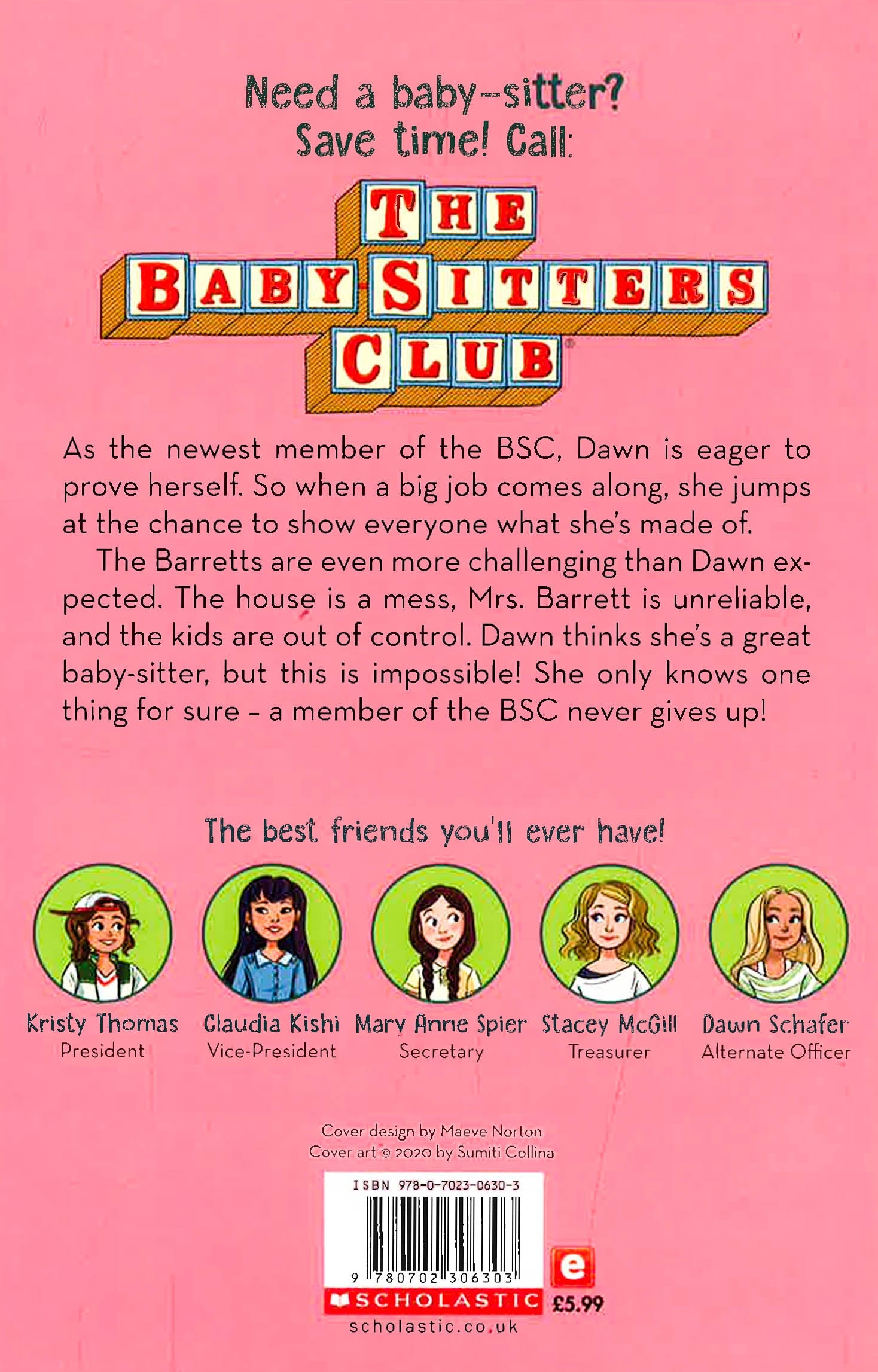 Newcomer Dawn is eager to prove herself when a big job comes along, and jumps at the chance to show what she's made of. The Barretts are out of control and even more challenging than Dawn expected! Dawn knows she's a great babysitter but this feels impossible. She only knows one thing for sure - a member of the BSC never gives up!