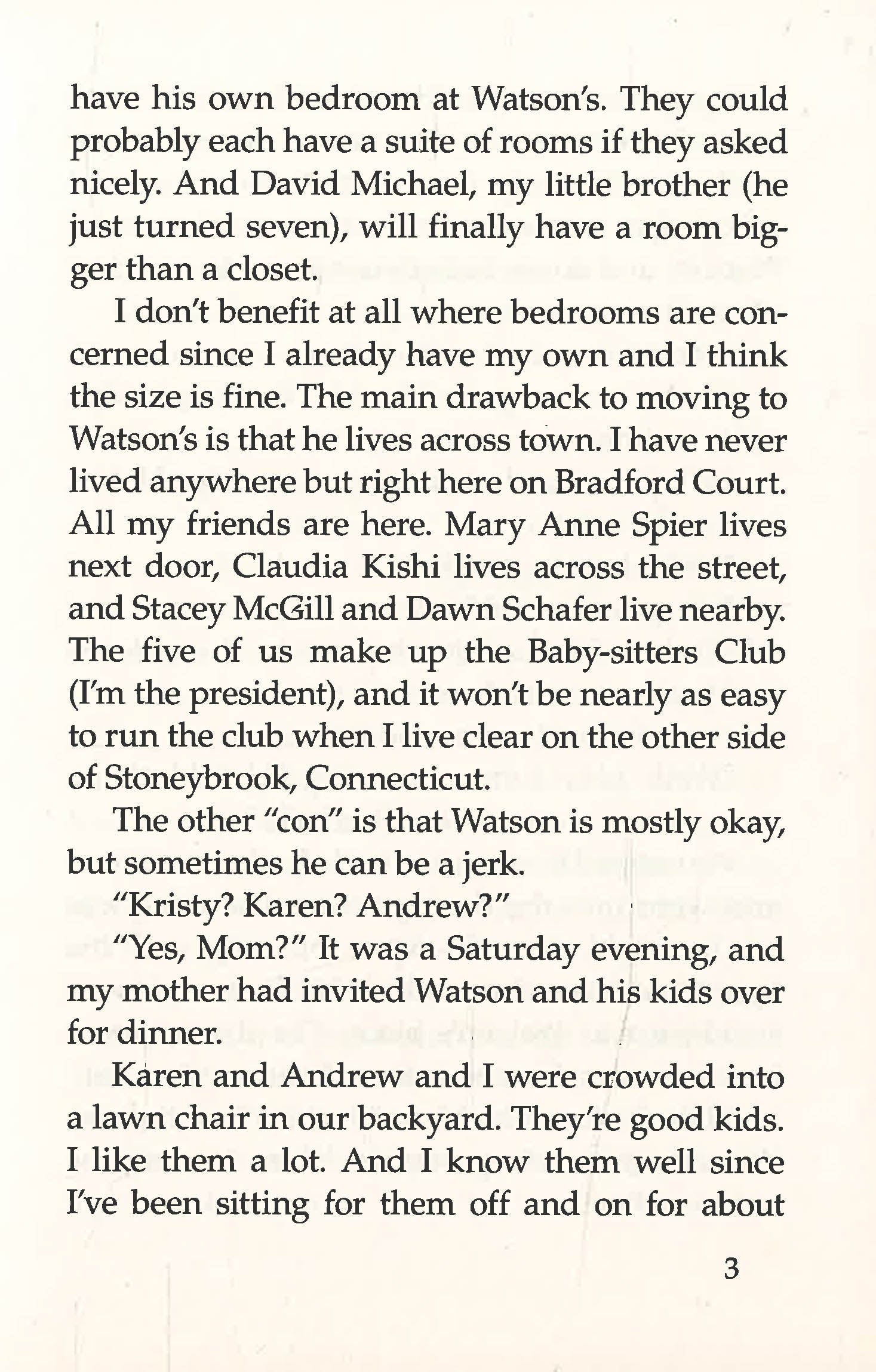 Kristy's mum is getting married, and everyone is coming to town to help, bringing their kids with them. Fourteen kids! Kristy is sure she and Stacey, Claudia, Mary Anne and Dawn can handle it - they're professional babysitters, after all! But will a week of chaos prove to be too much for the BSC?