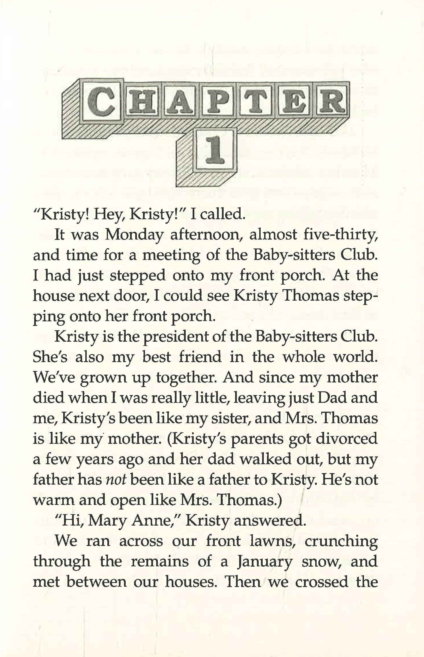 Mary Anne has never been a leader of the BSC. So when a fight breaks out among the club's four members, Mary Anne feels a little lost, unable to depend on Kristy, Stacey, or Claudia anymore.