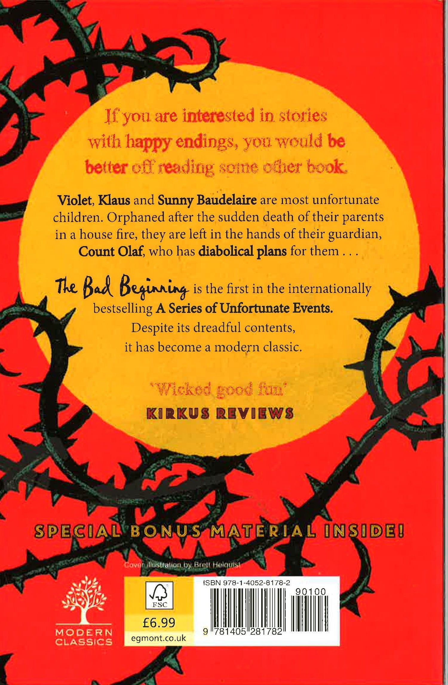 'If you are interested in stories with happy endings, you would be better off reading some other book.' Violet, Klaus and Sunny Baudelaire are most unfortunate children. Orphaned after the sudden death of their parents in a house fire, they are left in the hands of their guardian, Count Olaf, who has diabolical plans for them . . . 'A Series of Unfortunate Events' has sold more than 60 million copies worldwide, has been translated into 41 languages and was adapted into a 2004 film starring Jim Carrey. 'Wicked good fun' - Kirkus Reviews
