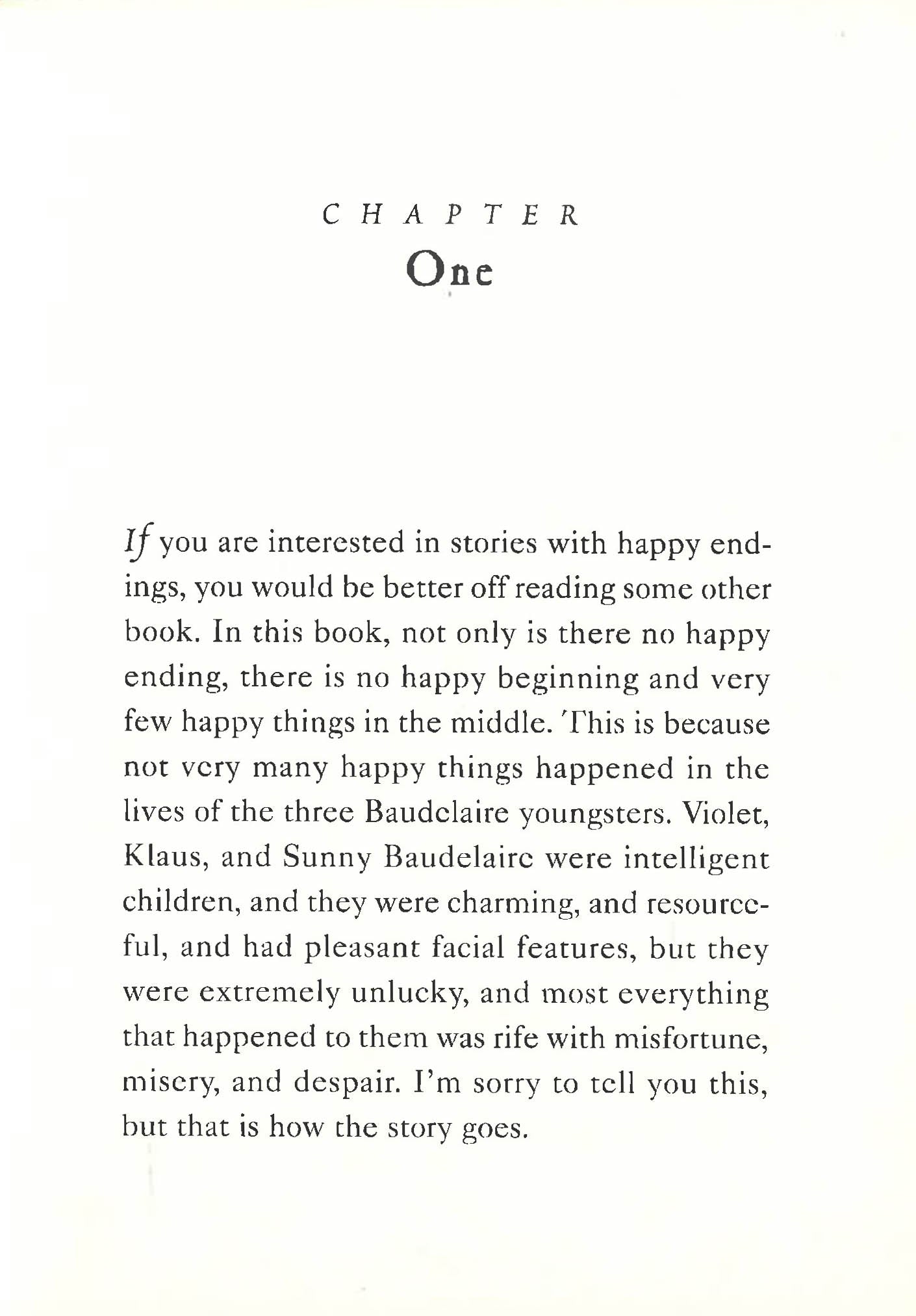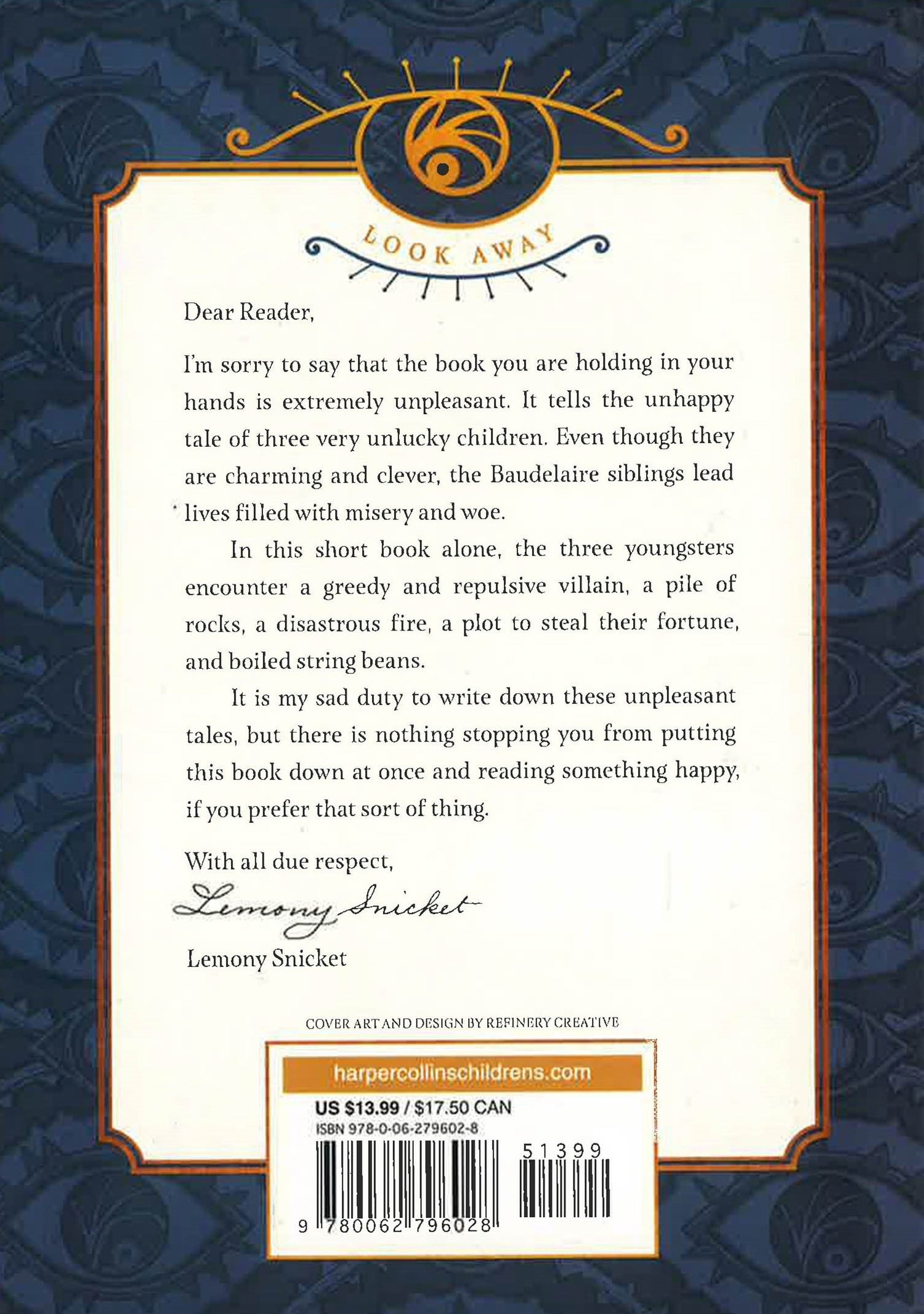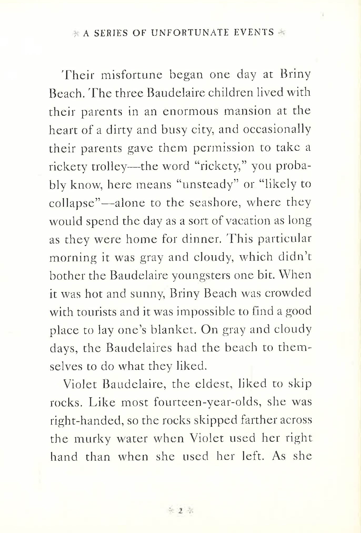 NOW A NETFLIX ORIGINAL SERIESIn the tradition of great storytellers, from Dickens to Dahl, comes an exquisitely dark comedy that is both literary and irreverent, hilarious and deftly crafted. Never before has a tale of three likeable and unfortunate children been quite so enchanting, or quite so uproariously unhappy. This middle grade novel is an excellent choice for tween readers in grades 5 to 6, especially during homeschooling. It's a fun way to keep your child entertained and engaged while not in the classroom. Violet, Klaus, and Sunny Baudelaire are intelligent children. They are charming, and resourceful, and have pleasant facial features. Unfortunately, they are exceptionally unlucky.In the first two books alone, the three youngsters encounter a greedy and repulsive villain, itchy clothing, a disastrous fire, a plot to steal their fortune, a lumpy bed, a deadly serpent, a large brass reading lamp, a long knife, and a terrible odor.