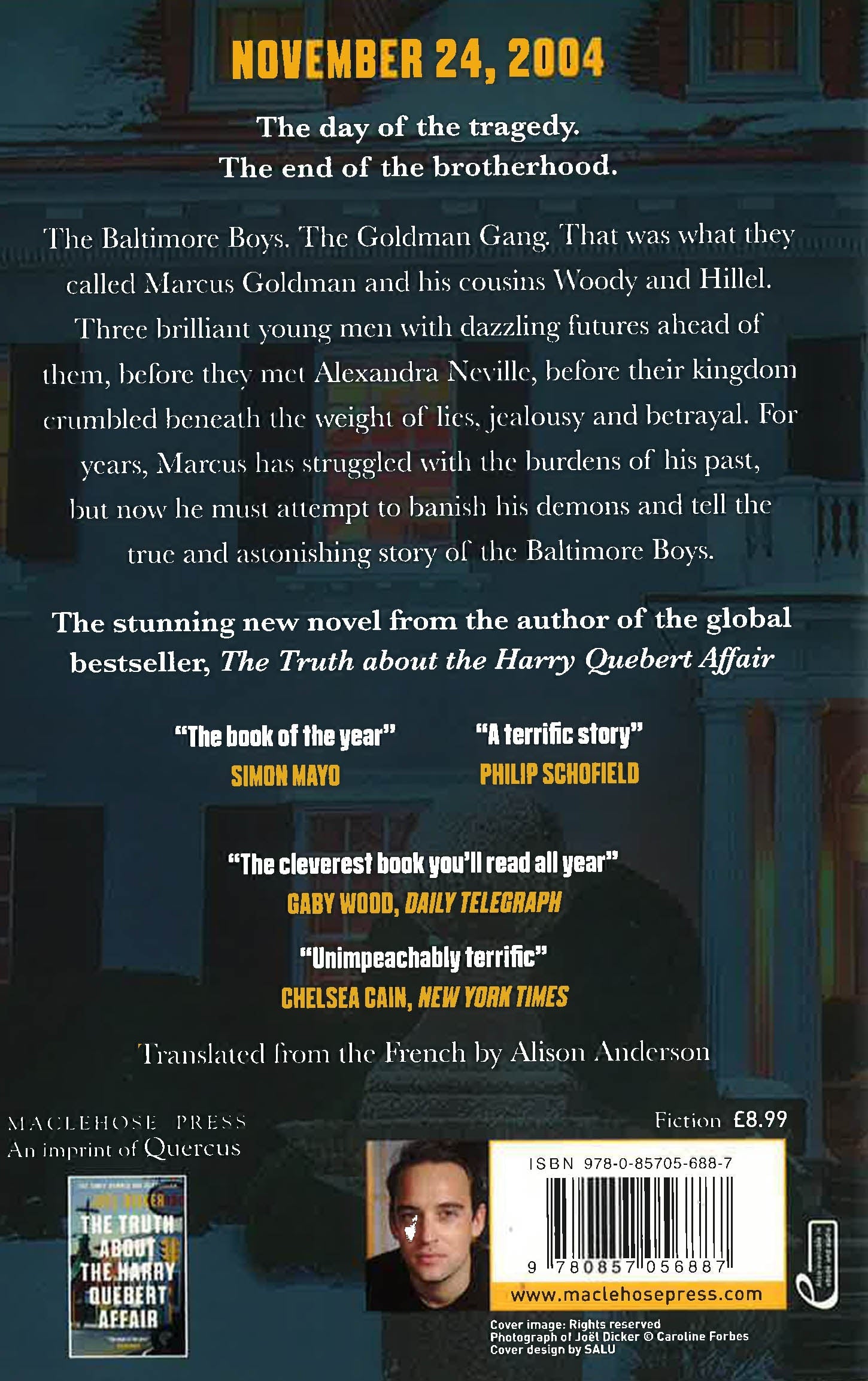Swiss Sensation Joel Dicker's compulsive follow-up to the phenomenally bestselling The Truth about the Harry Quebert Affair Fresh from the staggering success of The Truth about the Harry Quebert Affair, Marcus Goldman is struggling to write his third novel. A chance encounter in Florida throws him some inspiration from a surprising source: Alexandra Neville, the beautiful, phenomenally successful singer and Marcus's first love. All at once, memories of his childhood come flooding back. Memories of a family torn apart by tragedy, and a once glorious legacy reduced to shame and ruin.The Baltimore Boys. The Goldman Gang. That was what they called Marcus, and his cousins Hillel and Woody. Three brilliant young men with their whole lives ahead of them, before their kingdom crumbled beneath the weight of lies, jealousy and betrayal. For years, Marcus has struggled with the burdens of his past, but now, he must attempt to banish his demons and tell the real story of the Baltimore Boys.Translated from the French by Alison Anderson