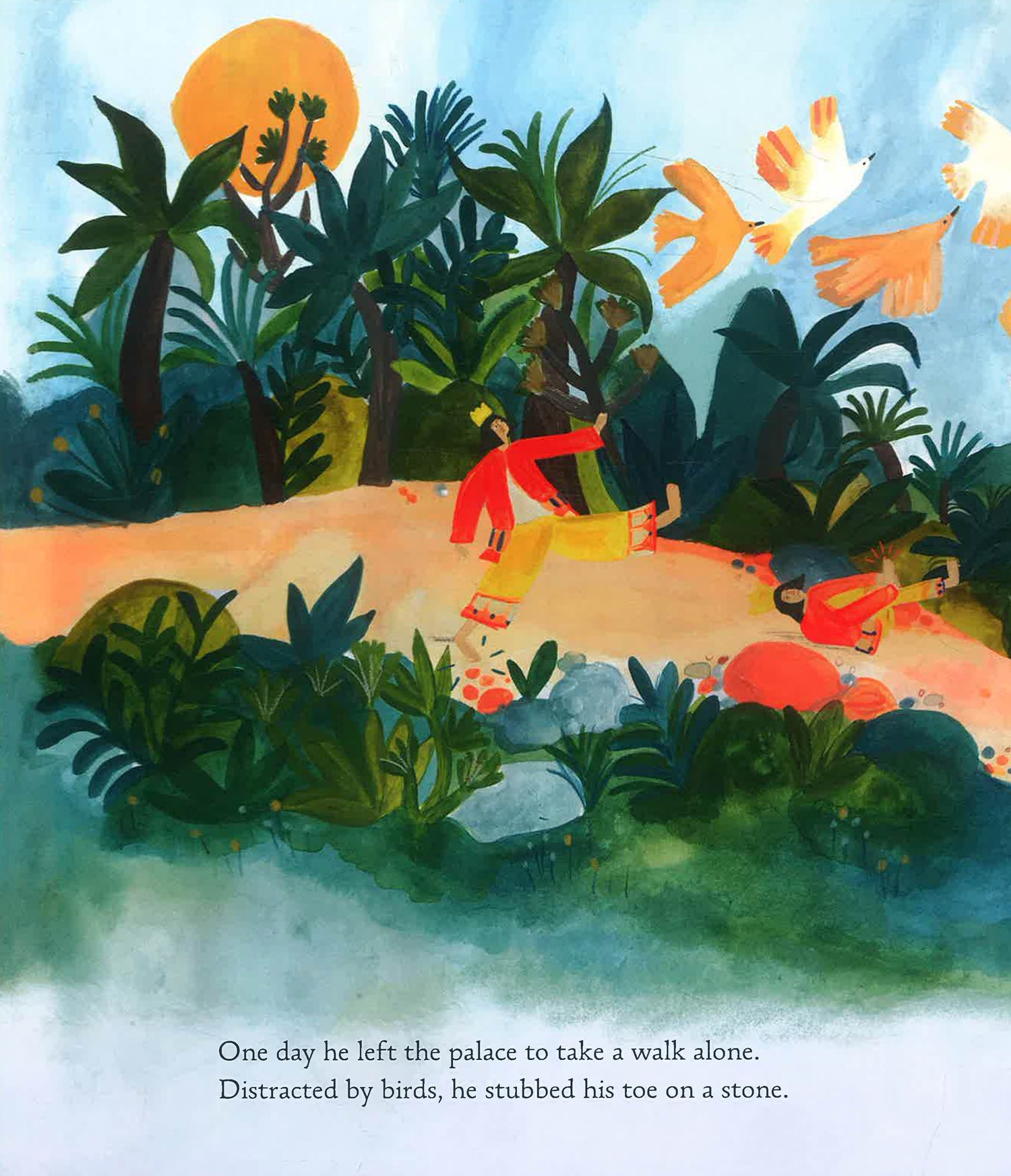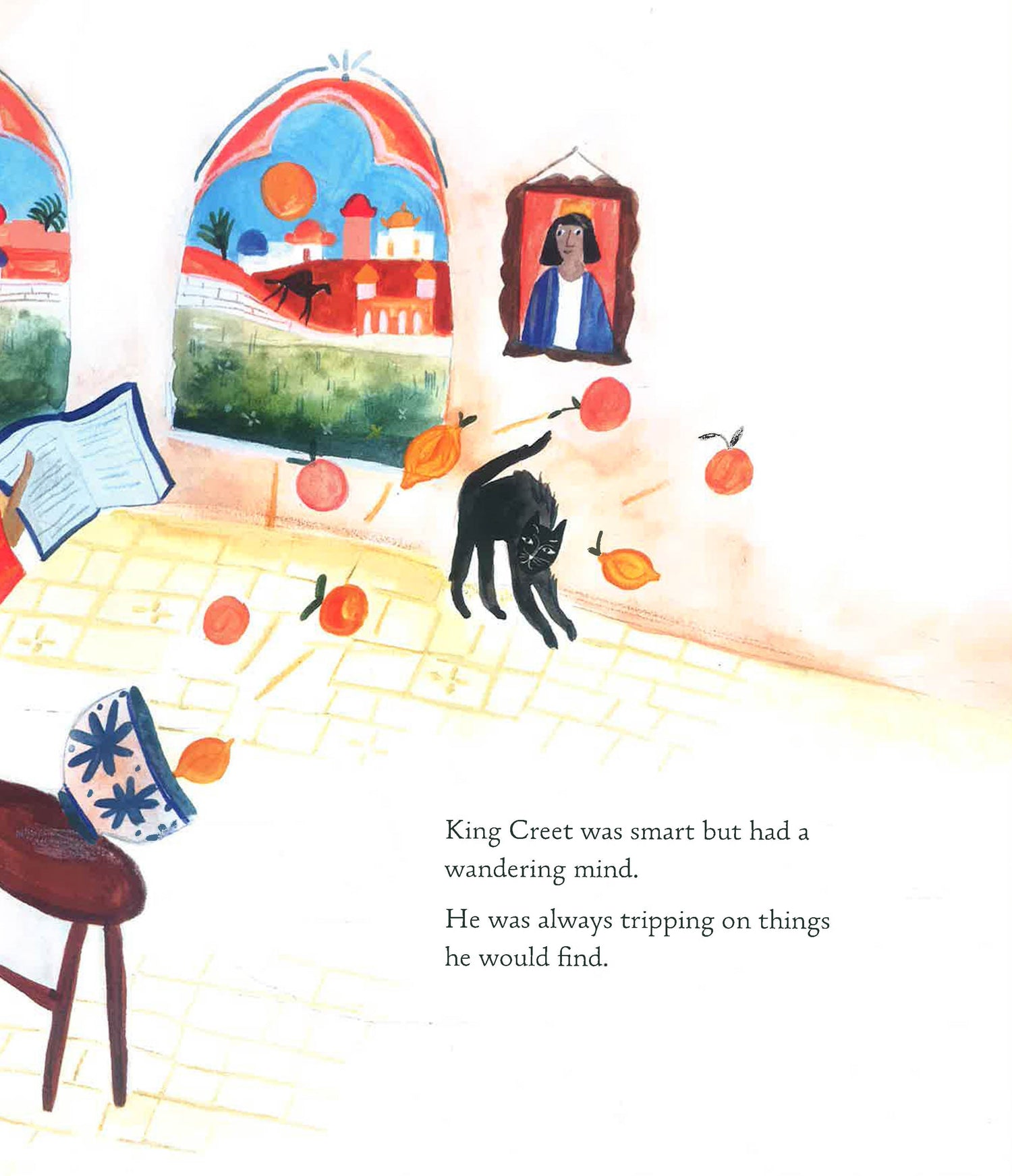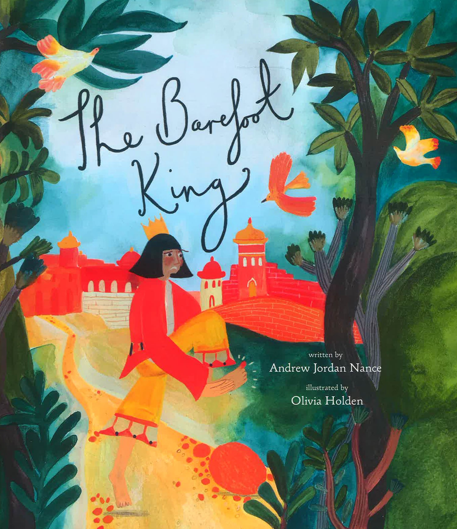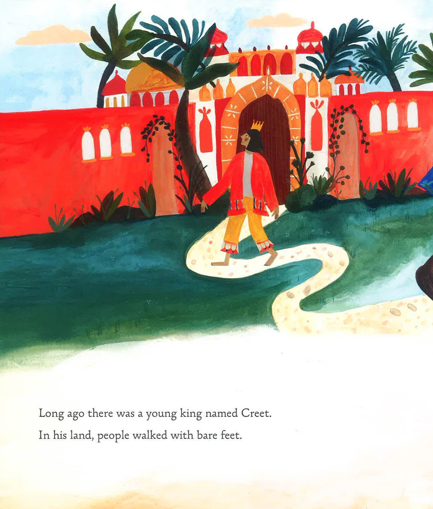 Told in rhyming couplets, The Barefoot King recounts the story of a young king named Creet who rules a land where people walk around with bare feet. Easily distracted, one day King Creet stubs his toe on a rock and is shocked by the pain. Never wanting to experience that discomfort again, the king decides to cover his whole kingdom in leather, with unfortunate consequences.