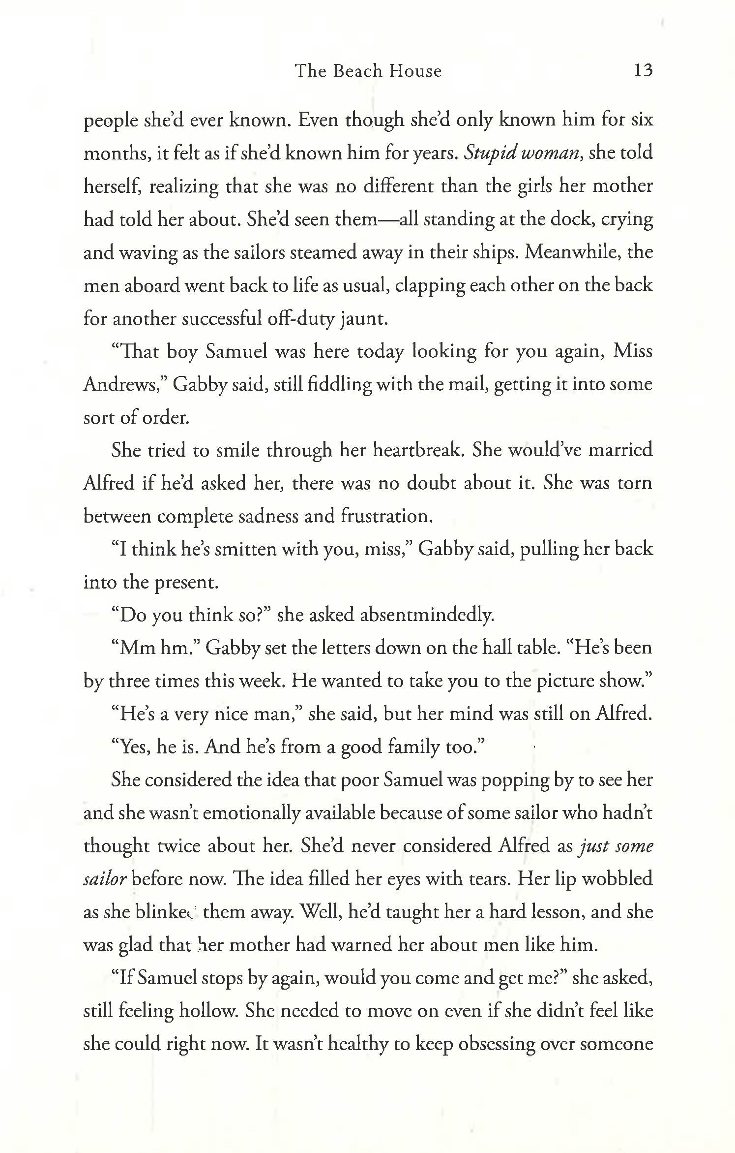 On her first night in her new hometown, Melanie meets local contractor and landowner Josh Claiborne, whose eyes match the dazzling sea. Melanie plans to restore the beach house to its original glory, and Josh is the perfect person to help renovate the wrap-around porch weathered by the coastal breeze and the peeling white paint faded by the sun.