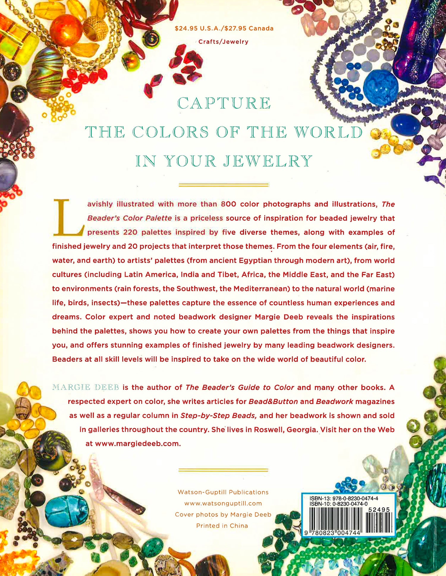 The Beader's Color Palette" reveals the extraordinary colour inspirations for beaded jewellery that can be found around the world. Margie Deeb, an expert on beading and colour, presents 220 palettes in five chapters: the four elements, art history, world cultures, natural landscapes and the animal world. Each inspired by a photograph or painting. Some also appear as spectacular jewellery contributed by noted beadwork artists. Each chapter includes step-by-step projects showing how to create a piece of beadwork jewellery inspired by a related palette. These projects mainly involve stringing, which is more accessible than weaving. Beginners who are new to either stringing or weaving can consult the helpful how-to sections at the back of the book.Margie Deeb is the author of "The Beader's Guide to Color" (9780823004874) and many others. * This book may have reminder mark*