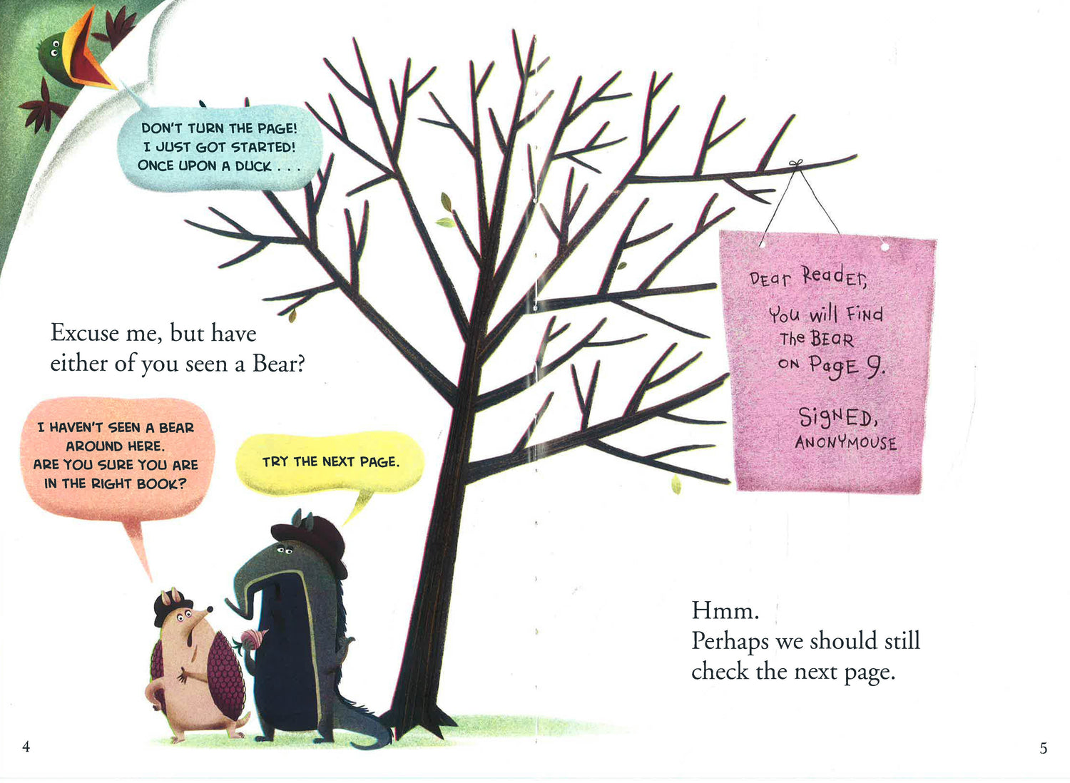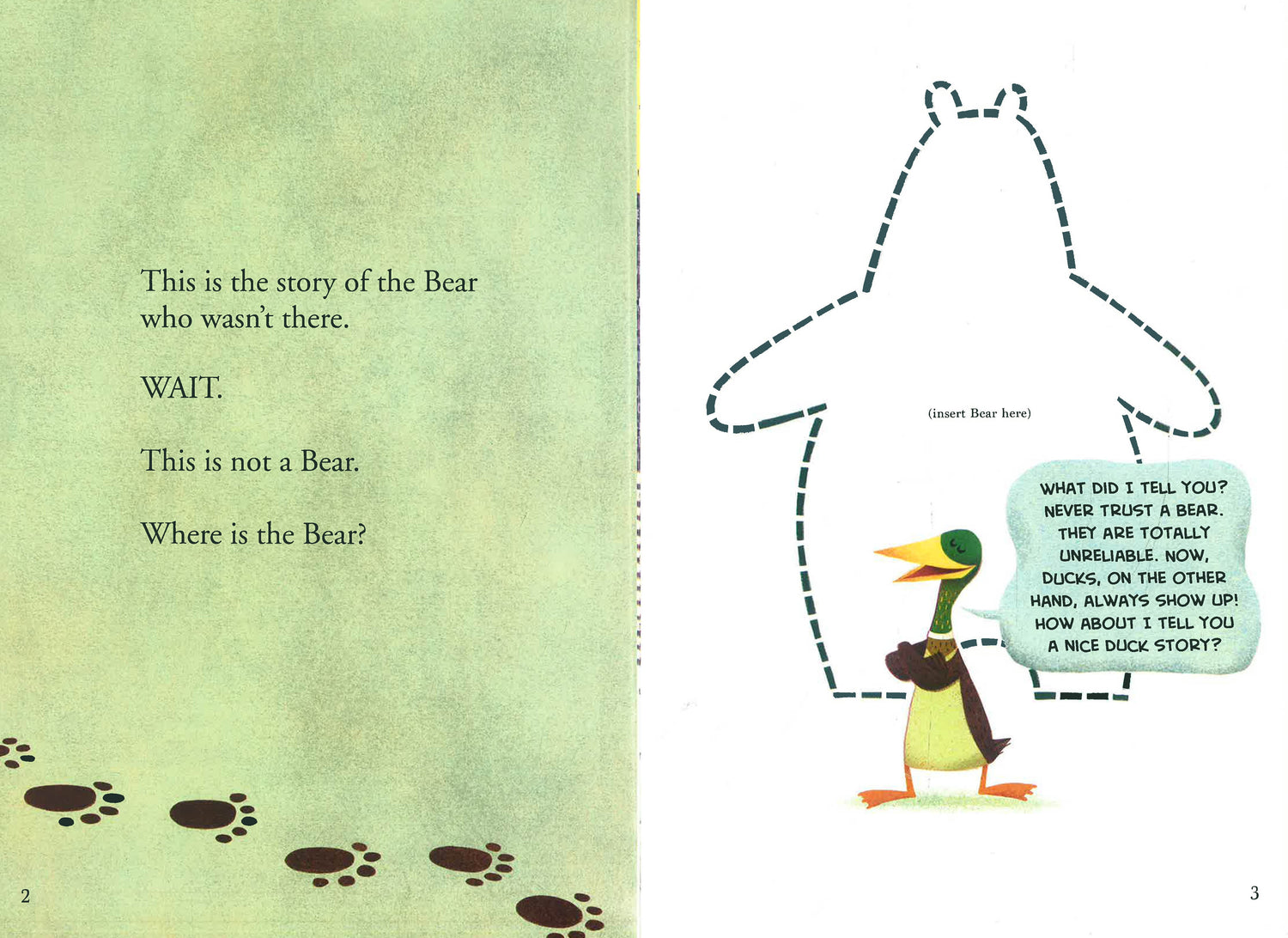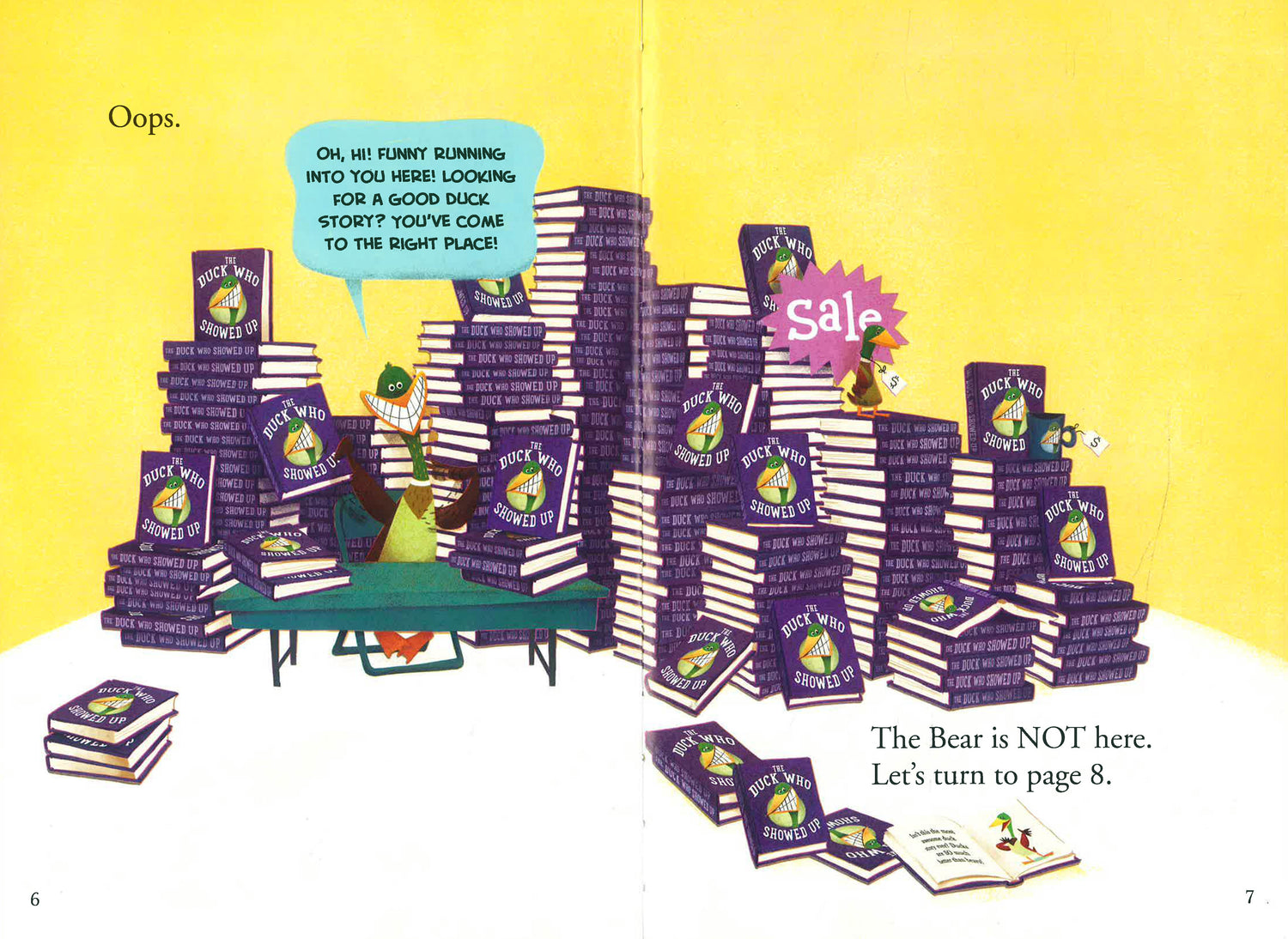 One thing's for sure--it probably won't be Duck. Duck doesn't seem concerned that Bear is missing. In fact, he seems to be trying to steal the show for himself! Duck would much prefer that the reader pick up his own book, The Duck Who Showed Up. He even disguises himself as Bear in an attempt to fool the reader. But after pages and pages of Duck's antics and search-party chaos, Bear appears somewhere utterly unexpected. In fact, it looks like someone may have tried to get rid of him on purpose....