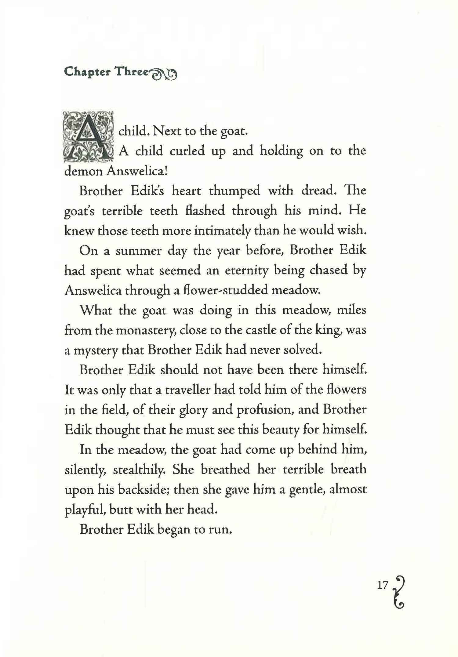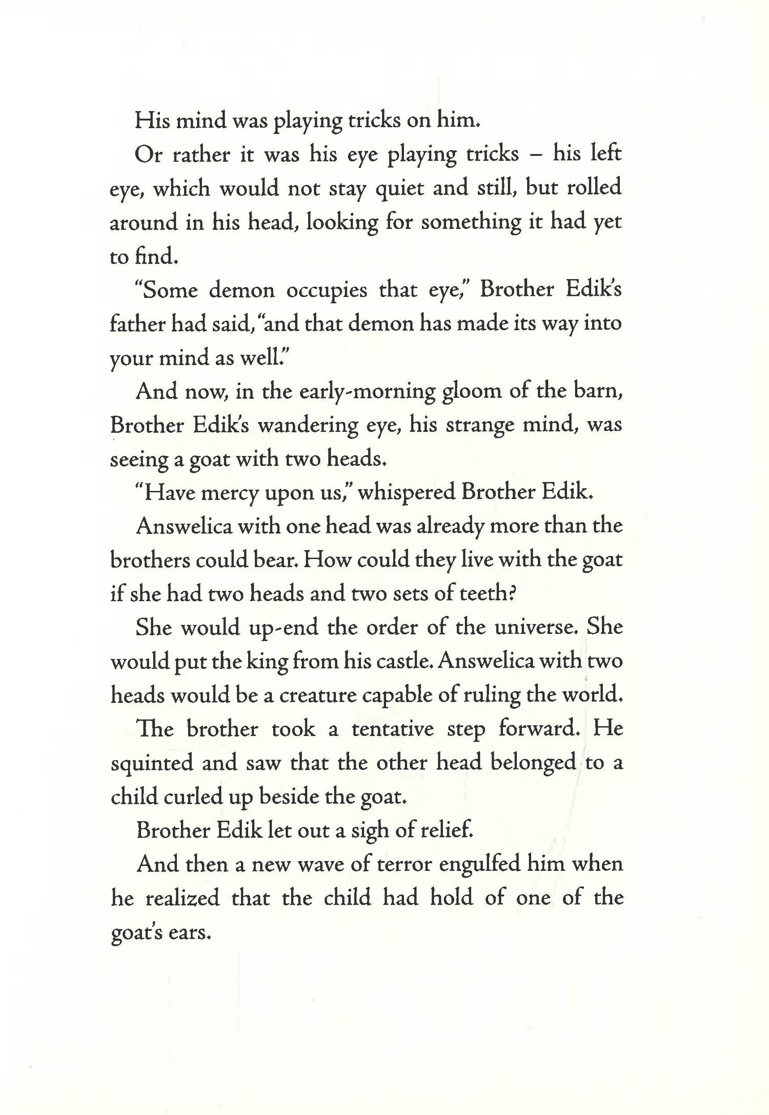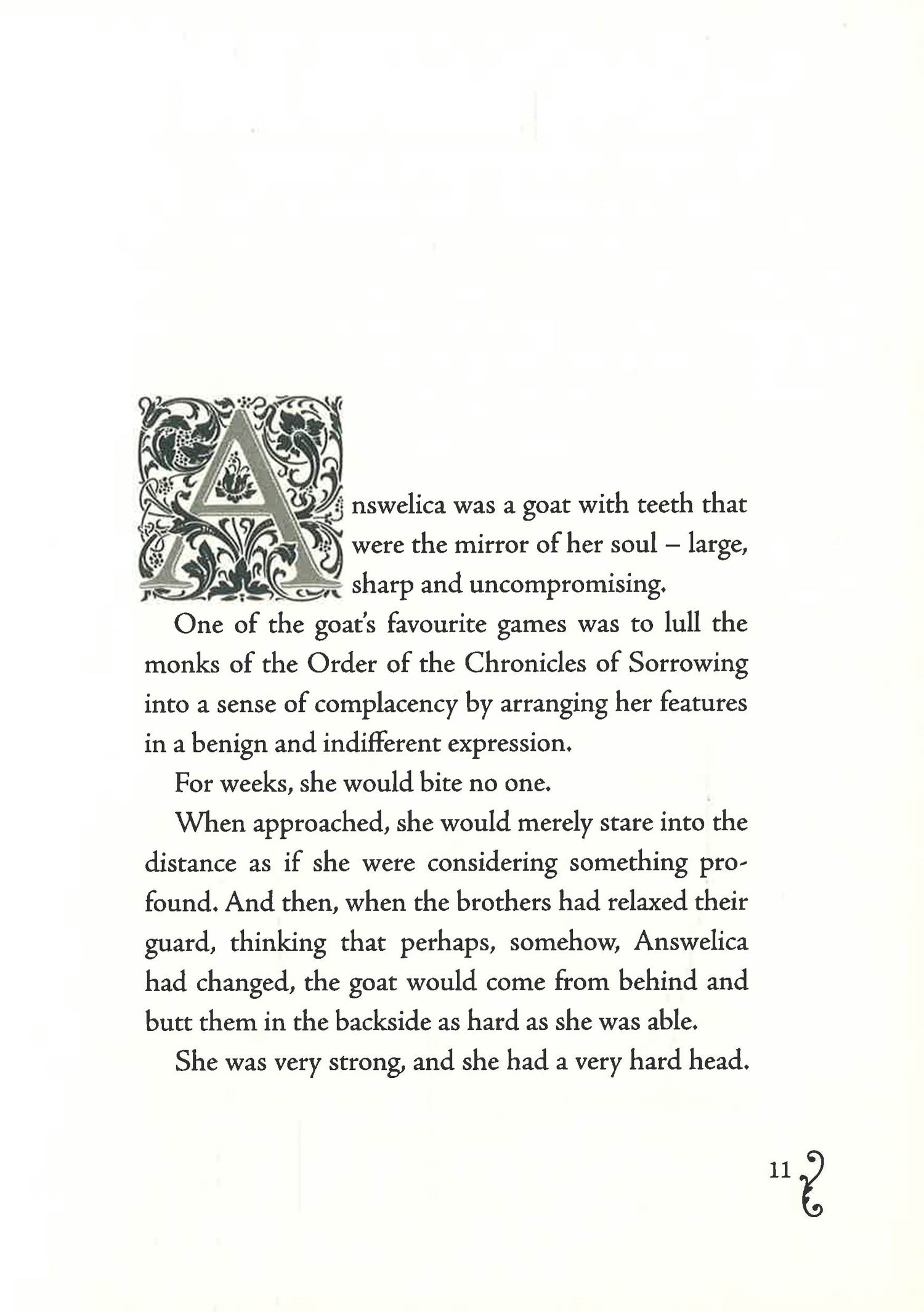 In a time of war, a mysterious child appears at the monastery of the Order of the Chronicles of Sorrowing. Gentle Brother Edik finds the girl, Beatryce, curled in a stall, wracked with fever, coated in dirt and blood and holding fast to the ear of Answelica the recalcitrant goat. As the monk nurses Beatryce to health, he uncovers her dangerous secret – one that imperils them all.