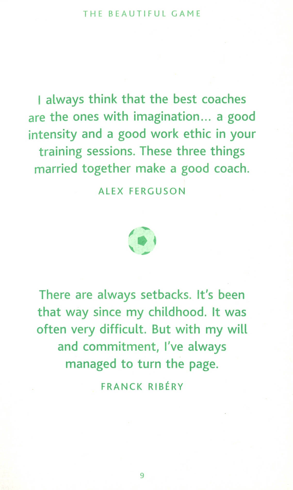 What matters above all is that the game should be played in the right spirit...' Sir Matt Busby A football match is never short of commentators, but only those with a real passion for the game, who know it inside-out, can offer truly wise and encouraging words. The book collects quotations from legendary players, managers, trainers and officials, painting an inspirational portrait of the highs and lows, glorious victories and agonising defeats, of the most popular sport on the planet.