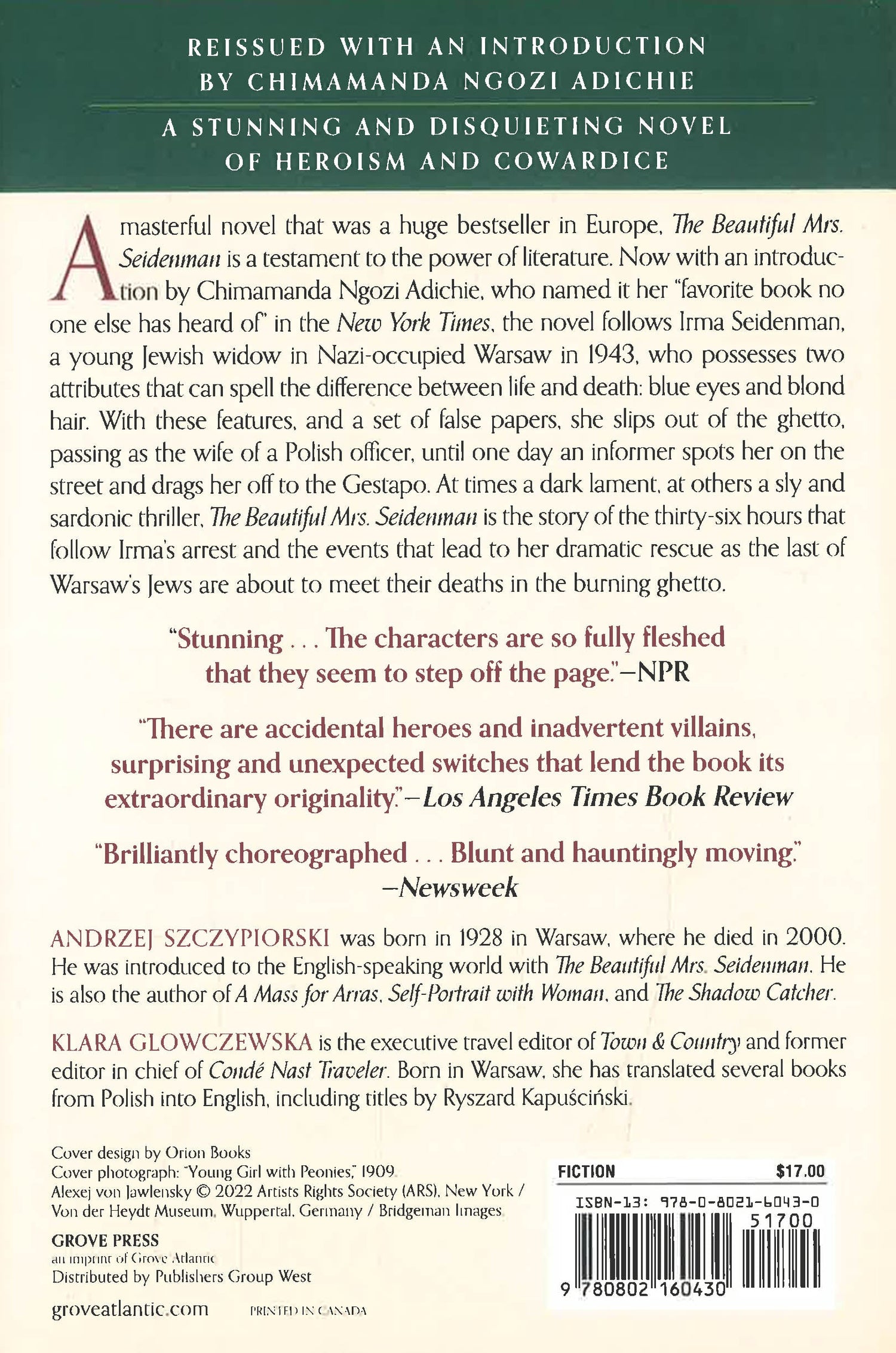 Reissued with an introduction by Chimamanda Ngozi Adichie, a stunning and disquieting novel of heroism and cowardiceA masterful novel that was a huge bestseller in Europe, The Beautiful Mrs. Seidenman is a testament to the power of literature. Now with an introduction by Chimamanda Ngozi Adichie, who named it her "favorite book no one else has heard of" in the New York Times, the novel follows Irma Seidenman, a young Jewish widow in Nazi-occupied Warsaw in 1943, who possesses two attributes that can spell the difference between life and death: blue eyes and blond hair. With these features, and a set of false papers, she slips out of the ghetto, passing as the wife of a Polish officer, until one day an informer spots her on the street and drags her off to the Gestapo. At times a dark lament, at others a sly and sardonic thriller, The Beautiful Mrs. Seidenman is the story of the thirty-six hours that follow Irma's arrest and the events that lead to her dramatic rescue as the last of Warsaw's Jews are about to meet their deaths in the burning ghetto.