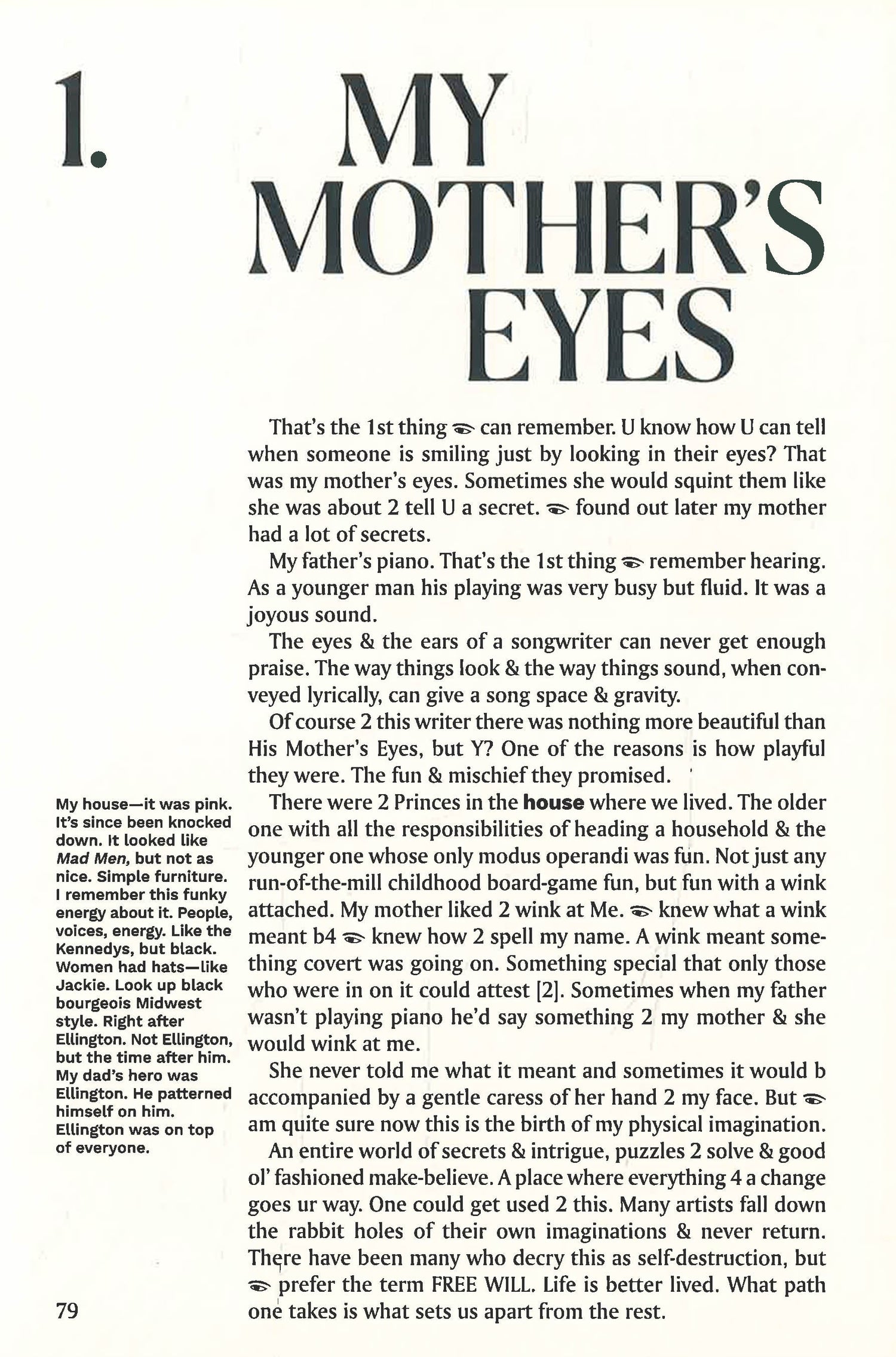 The Beautiful Ones is the story of how Prince became Prince—a first-person account of a kid absorbing the world around him and then creating a persona, an artistic vision, and a life, before the hits and fame that would come to define him. The book is told in four parts. The first is the memoir Prince was writing before his tragic death, pages that bring us into his childhood world through his own lyrical prose. The second part takes us through Prince’s early years as a musician, before his first album was released, via an evocative scrapbook of writing and photos. The third section shows us Prince’s evolution through candid images that go up to the cusp of his greatest achievement, which we see in the book’s fourth section: his original handwritten treatment for Purple Rain—the final stage in Prince’s self-creation, where he retells the autobiography of the first three parts as a heroic journey.