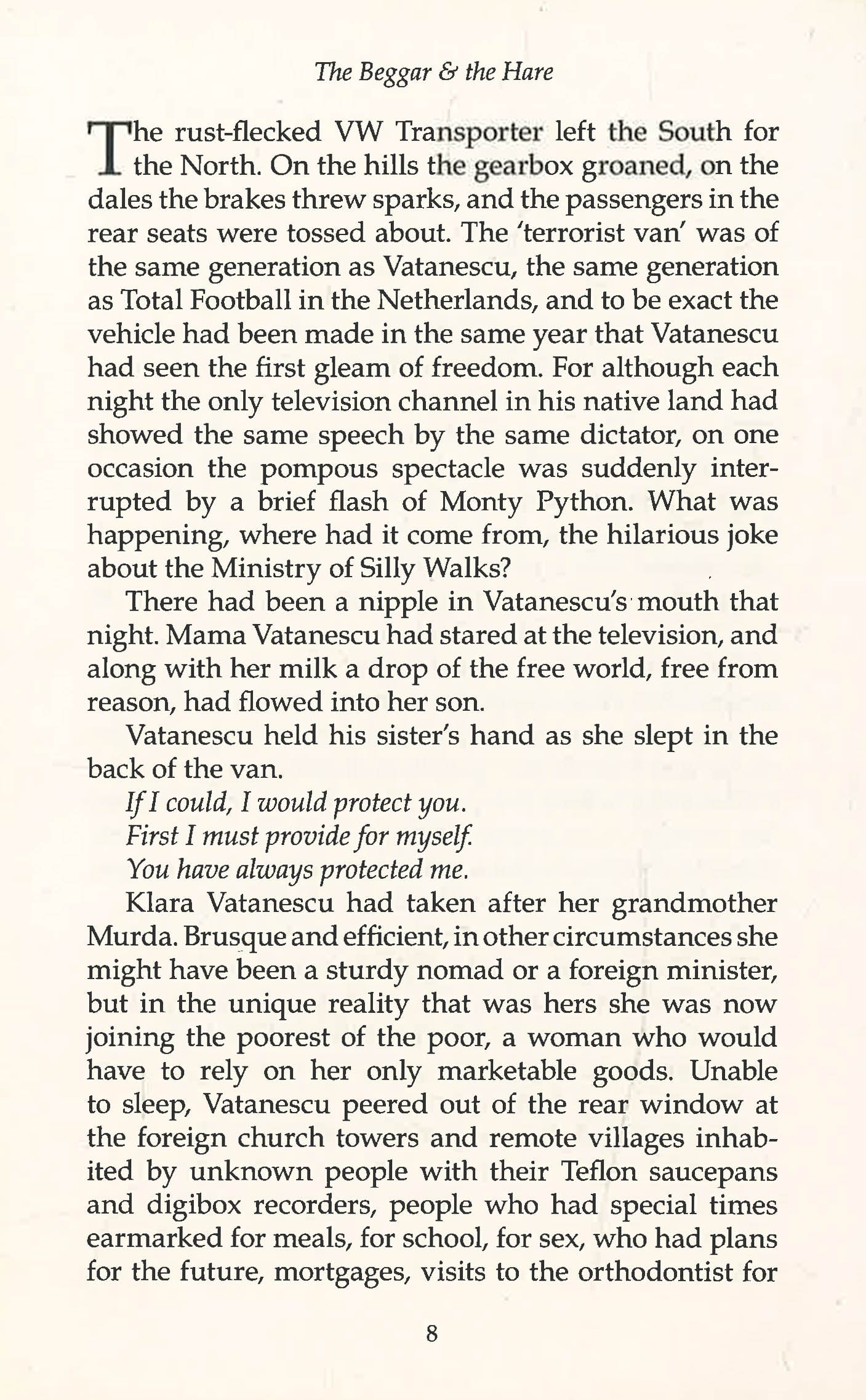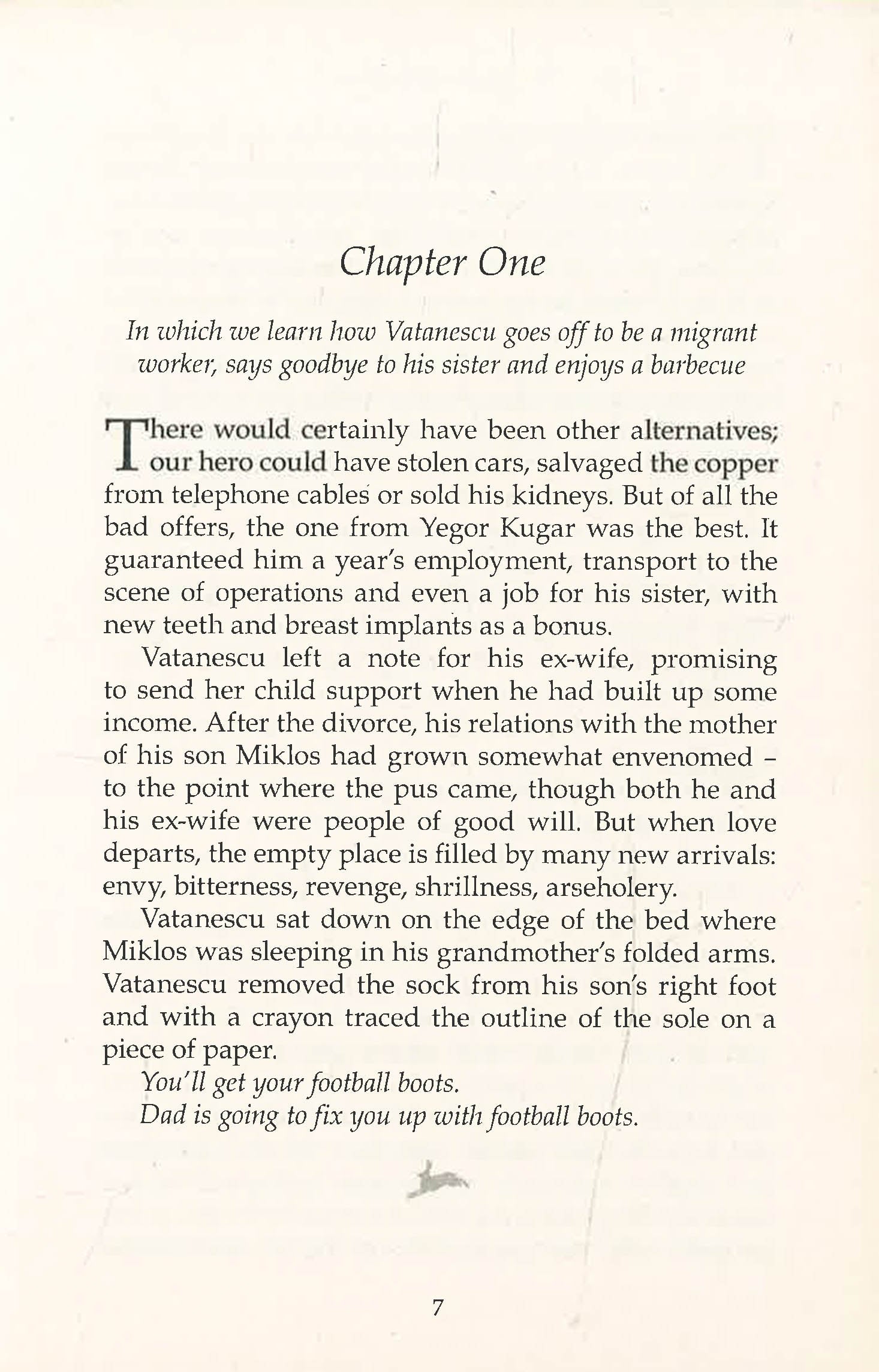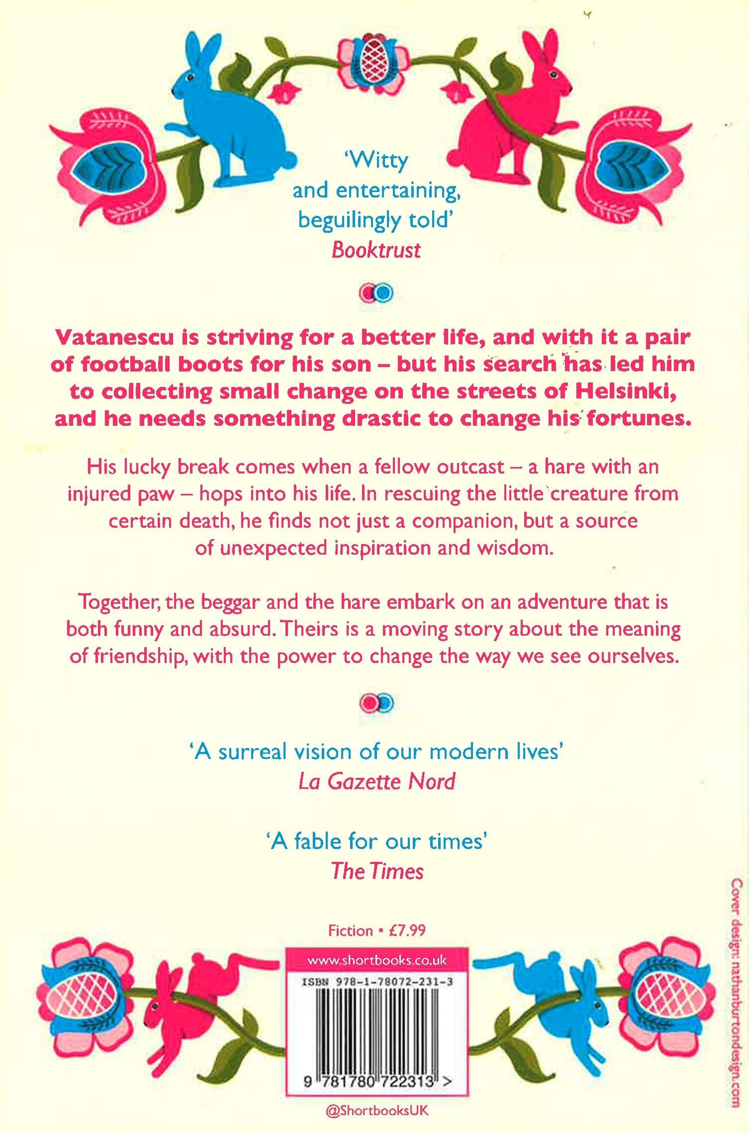 Vatanescu, an impoverished construction worker, wants a future for himself and a pair of football boots for his son. So he decides to head north to a cold, dark country where there is money to be made. Taking up with a Russian human trafficker, he joins the bottom rung of a begging ring in Finland. But the prospects in this line of work are not as good as he had hoped, and soon Vatanescu is on the run. His luck finally turns when he meets a fellow outcast, a hare fleeing Helsinki pest control. The pair embark on a journey that is funny, dark and wonderfully absurd. Could a beggar and a hare change not just the course of a country, but the way we see ourselves?